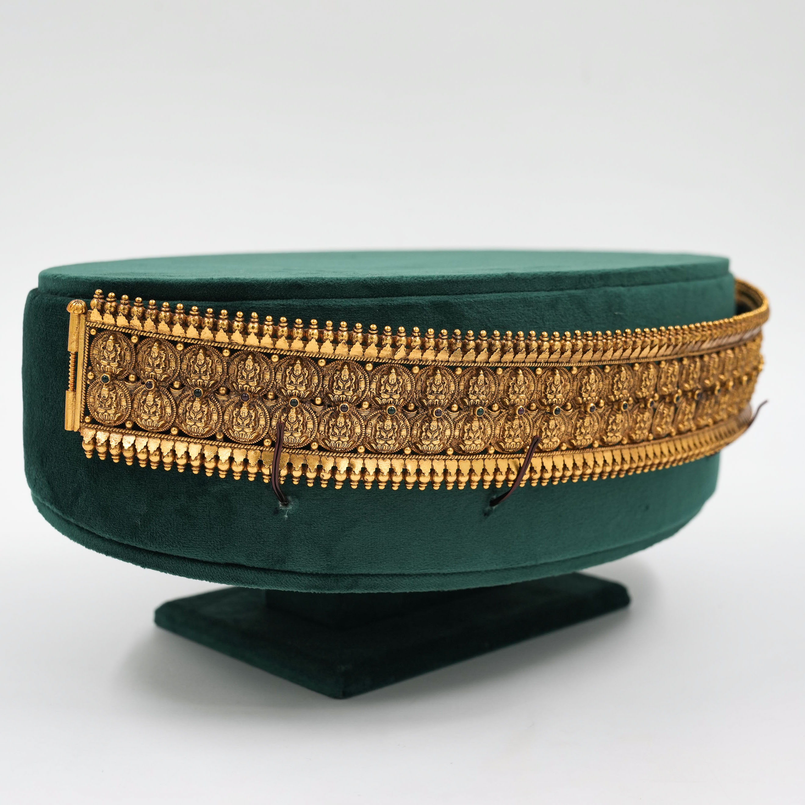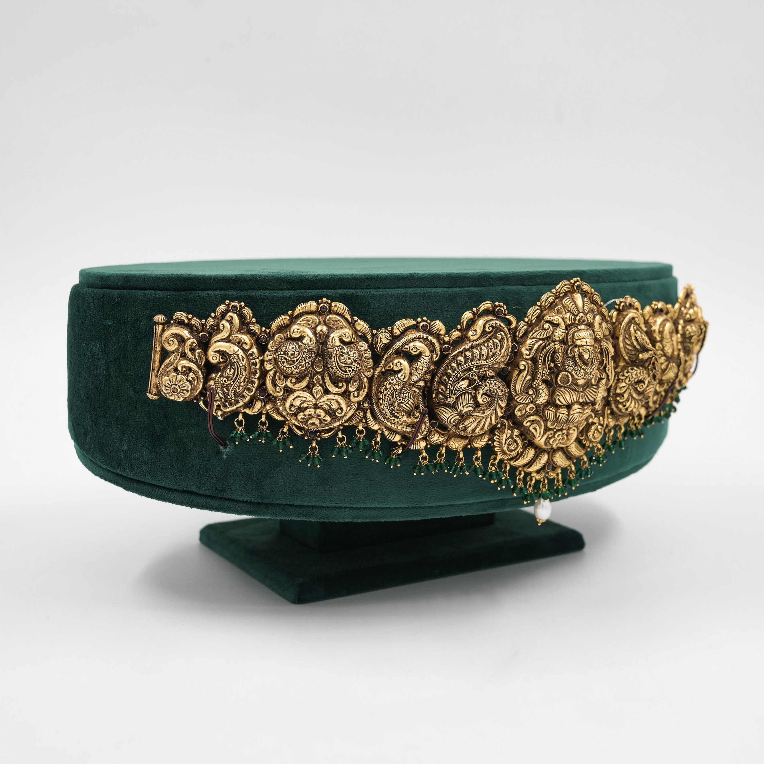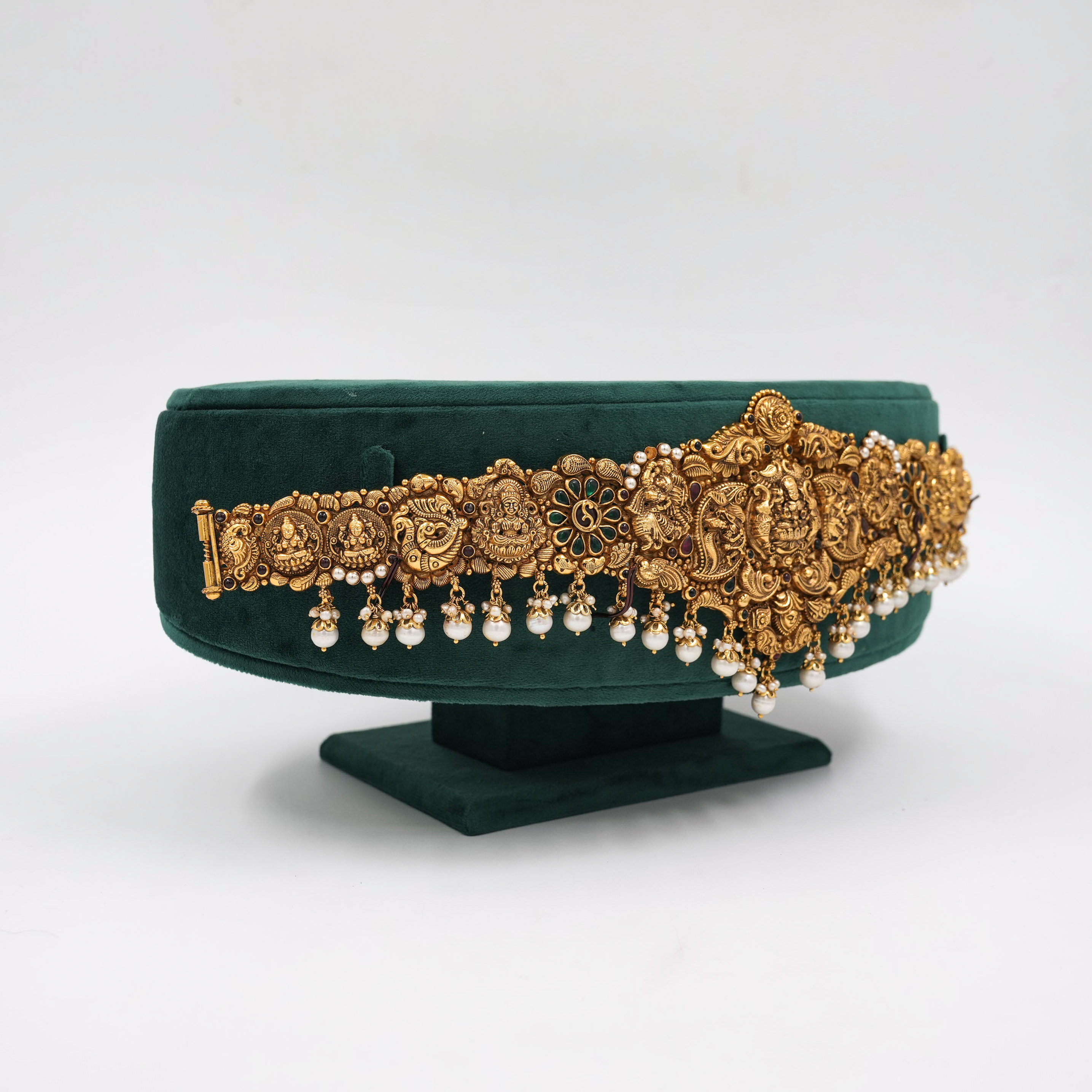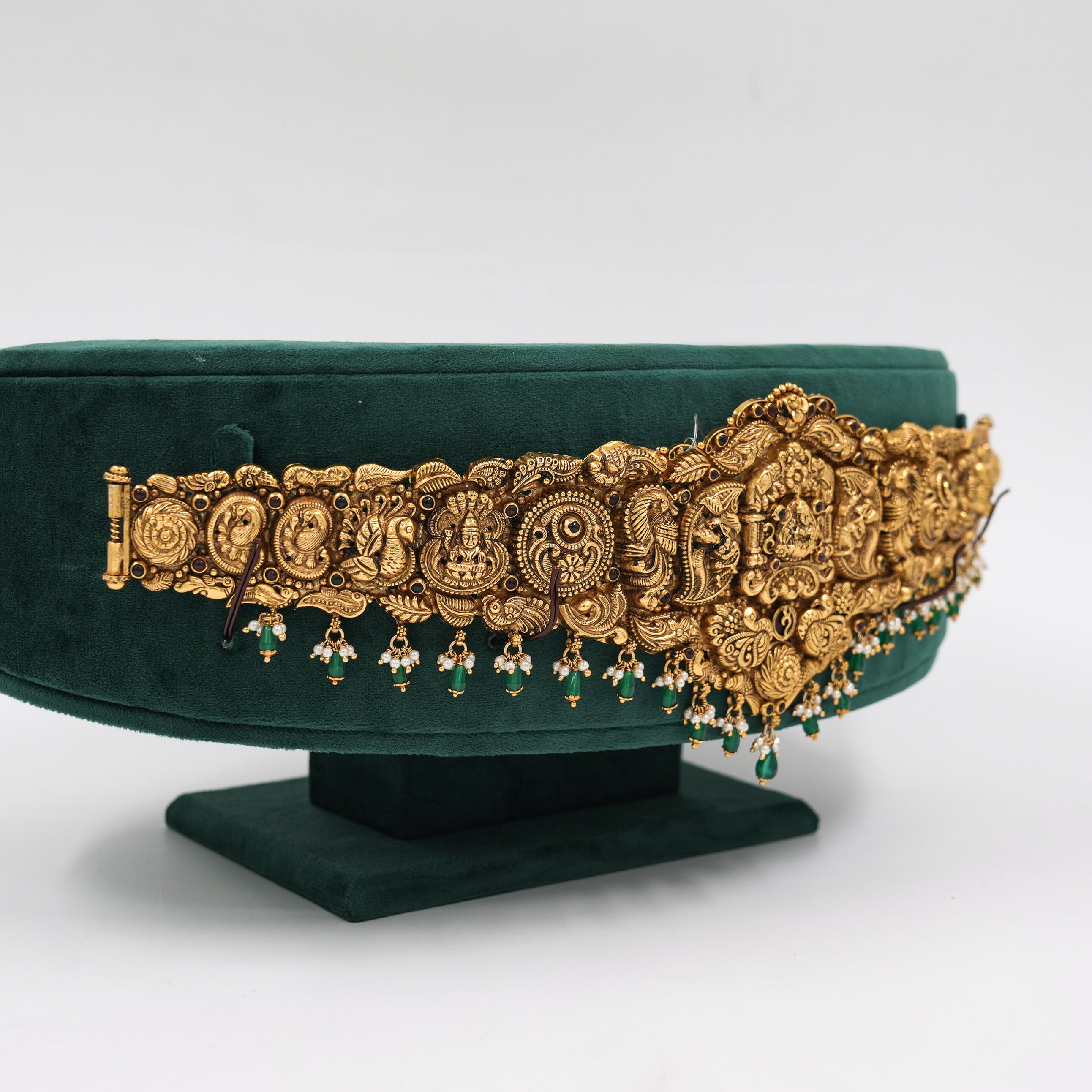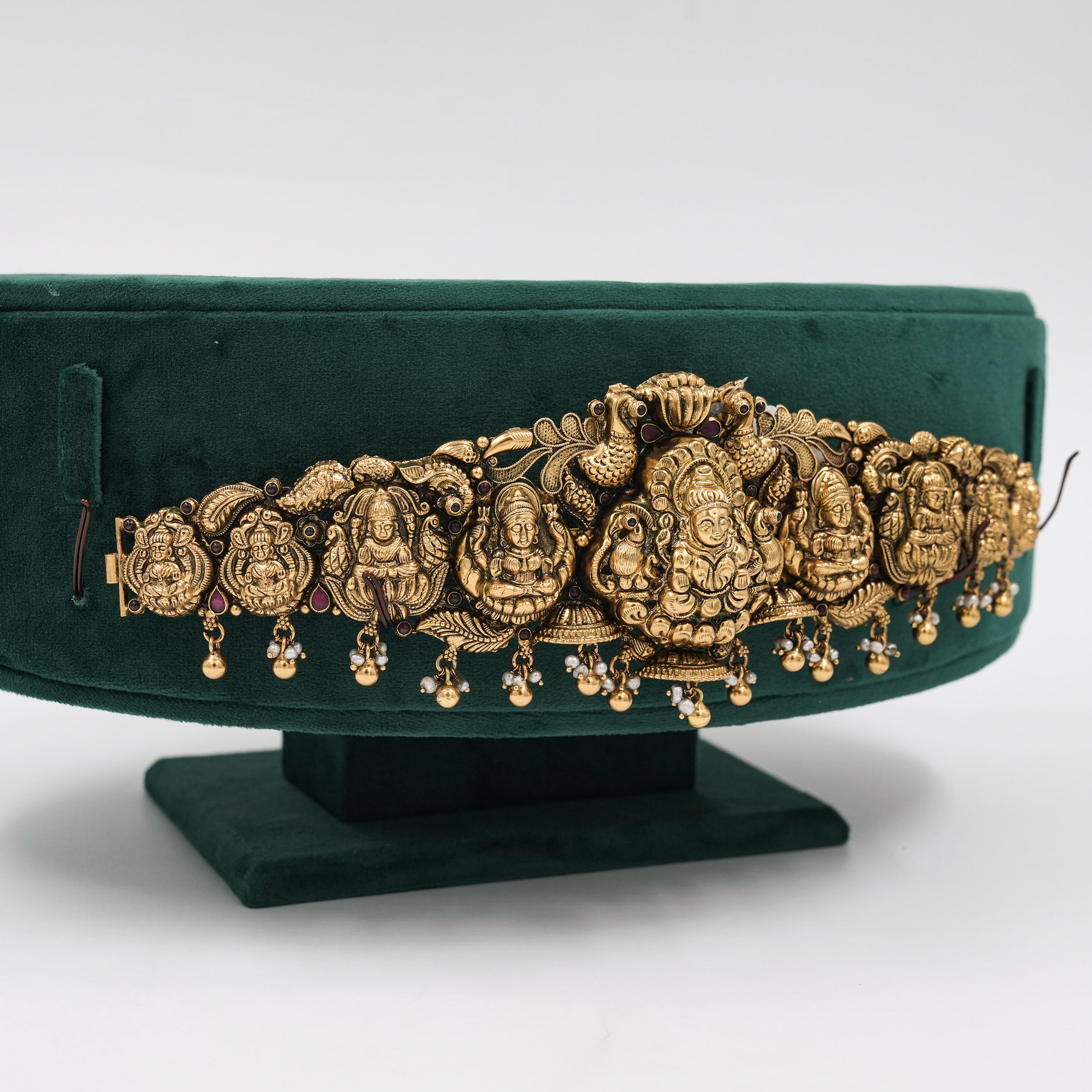 Ornate gold temple belt with intricate detailing, perfect for weddings and traditional occasions. Buy gold temple belt from Raag Silver Jewellery in Hyderabad.