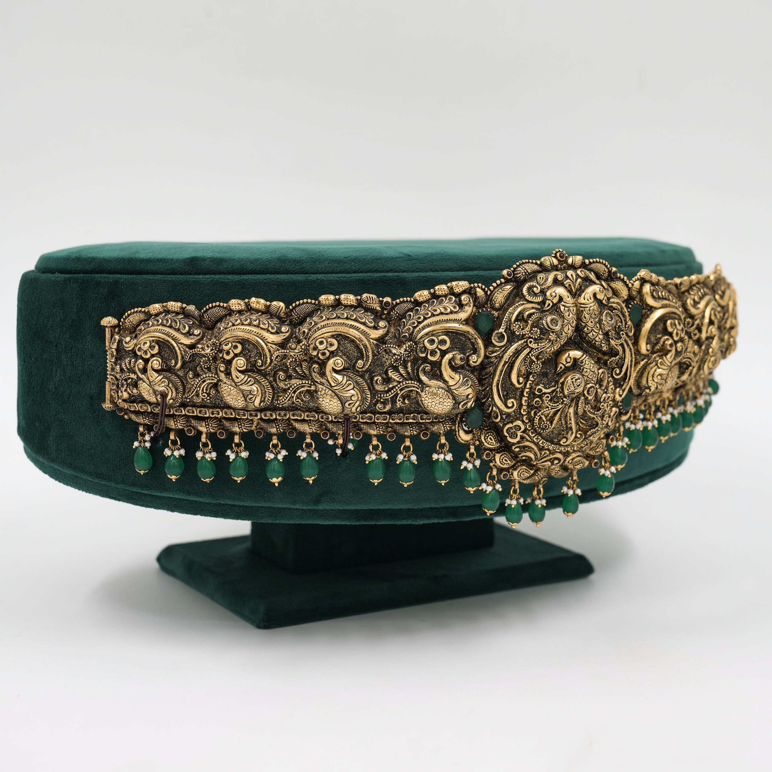 Oxidized silver peacock belt with green drops, perfect for traditional outfits and festive occasions. Buy Silver Peacock Belt from Raag Silver Jewellery in Hyderabad.