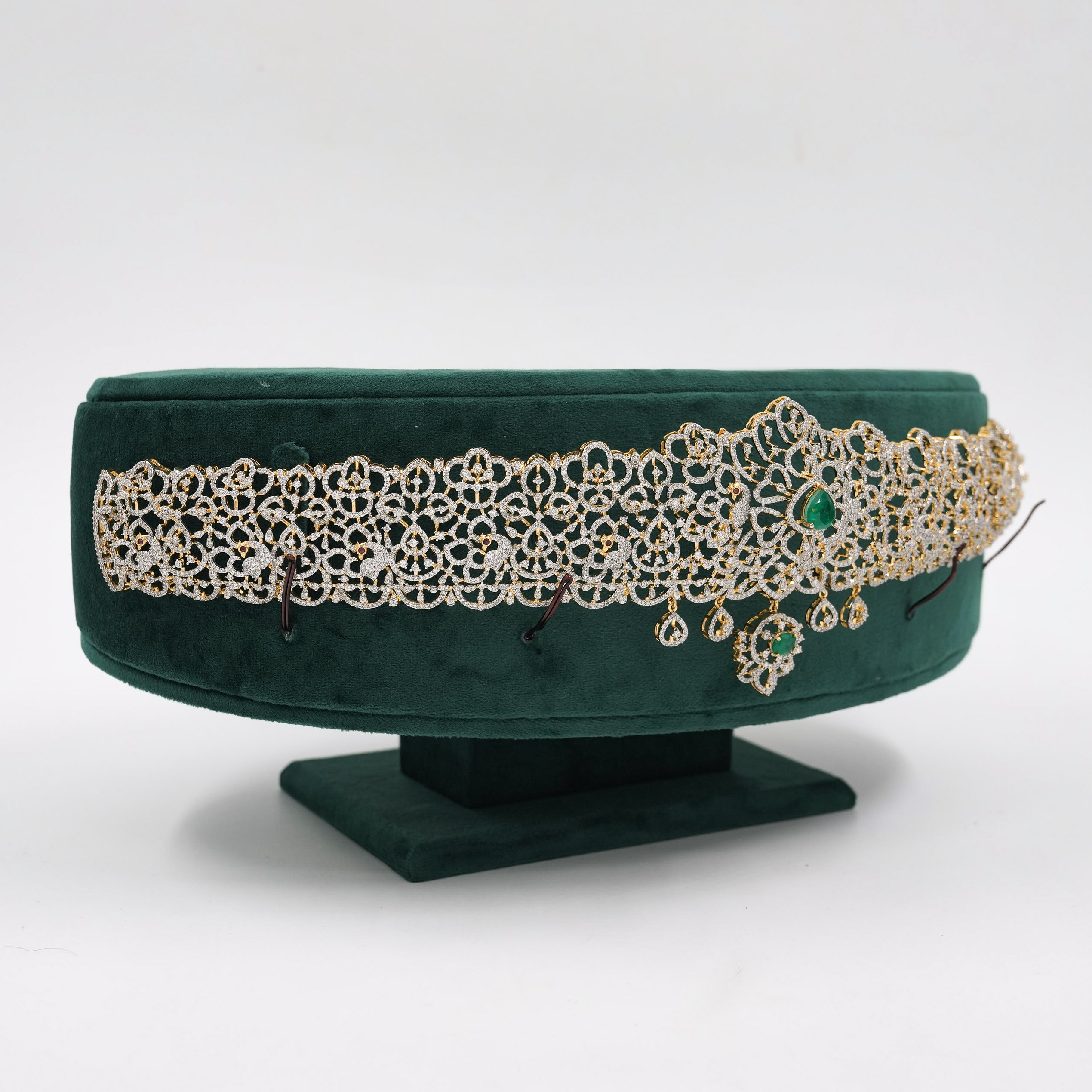 Gold polished emerald studded silver belt for women, perfect for special occasions and traditional wear. Buy emerald silver belt from Raag Silver Jewellery in Hyderabad.