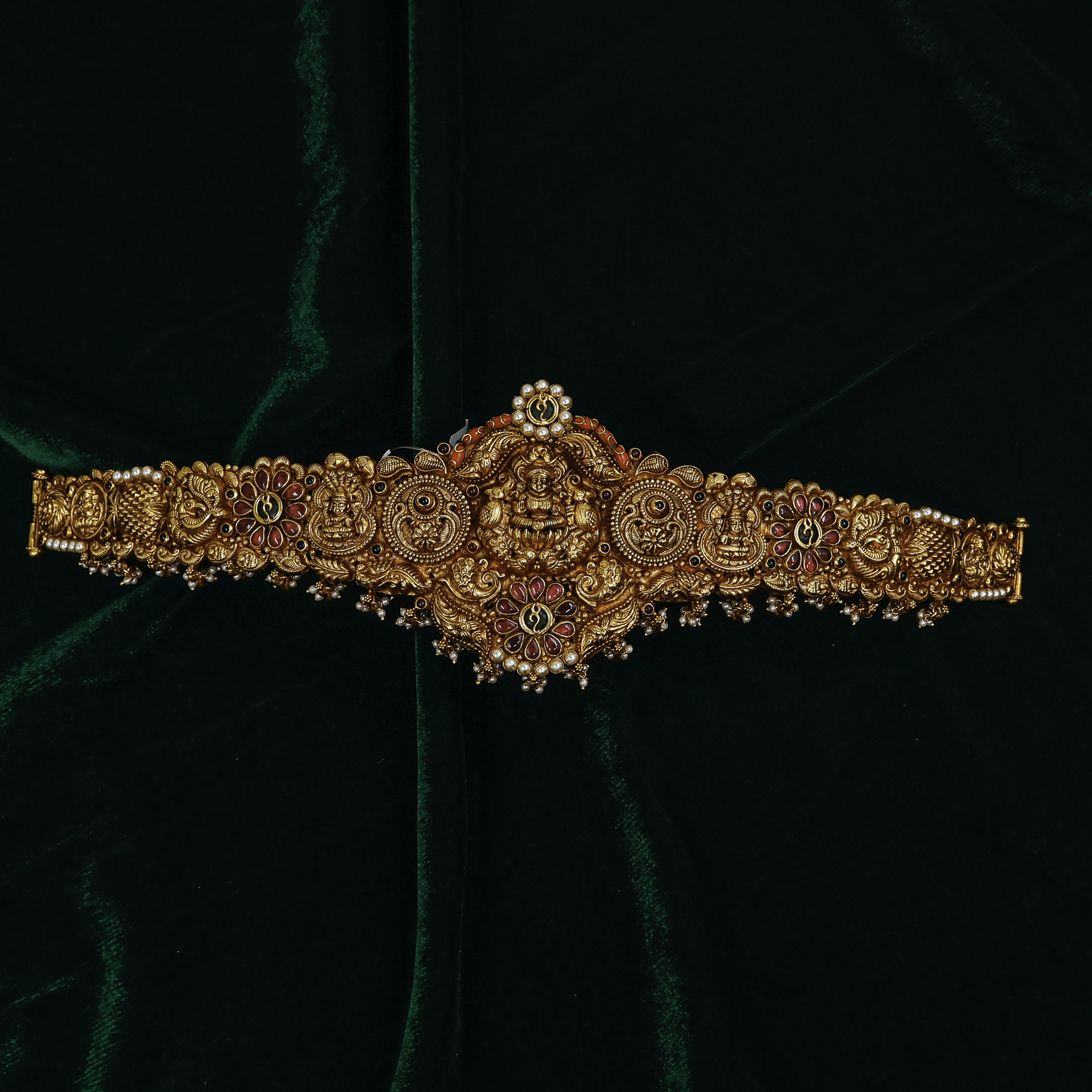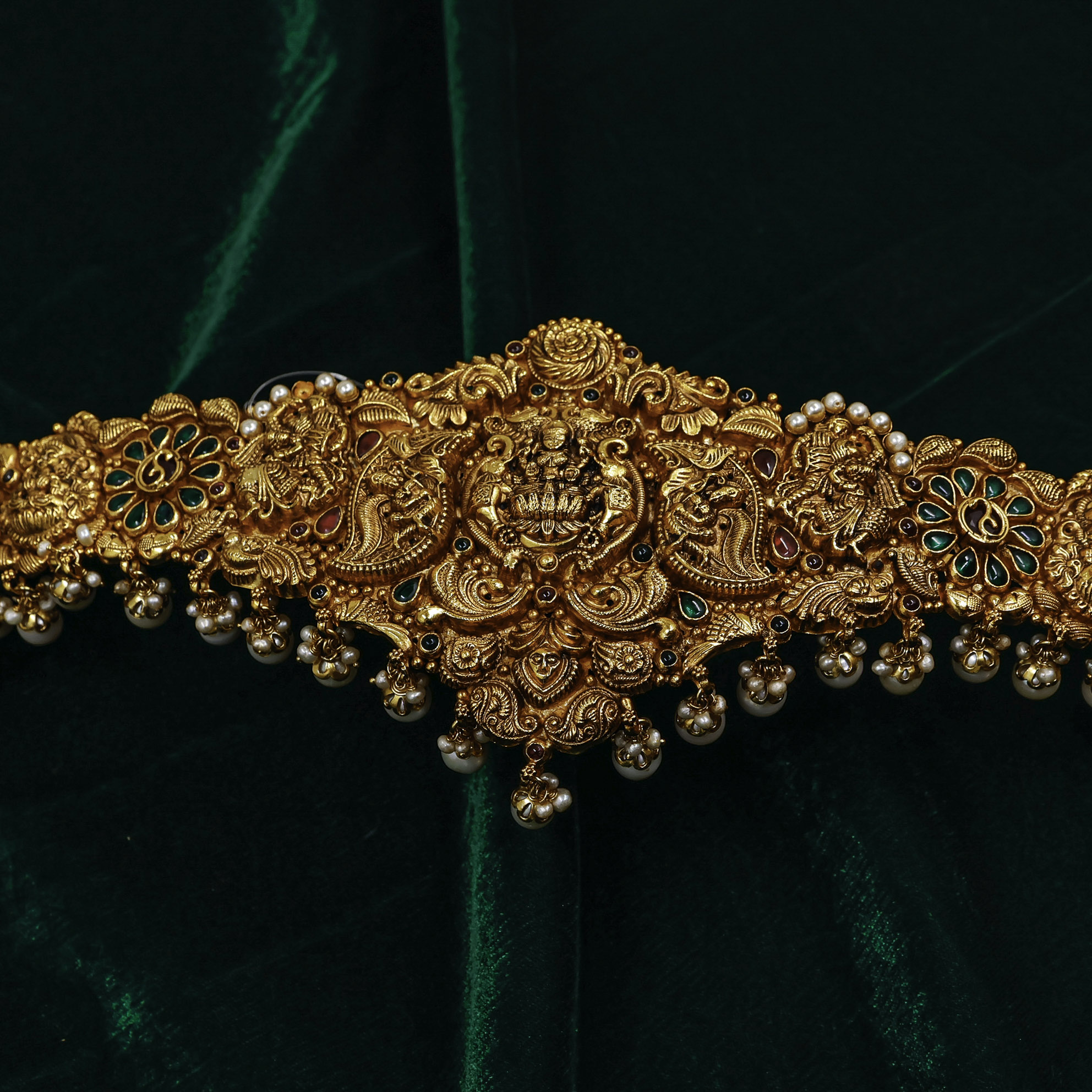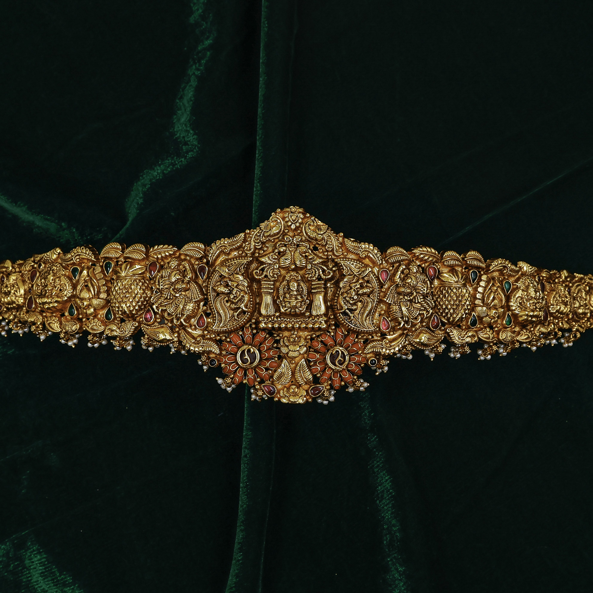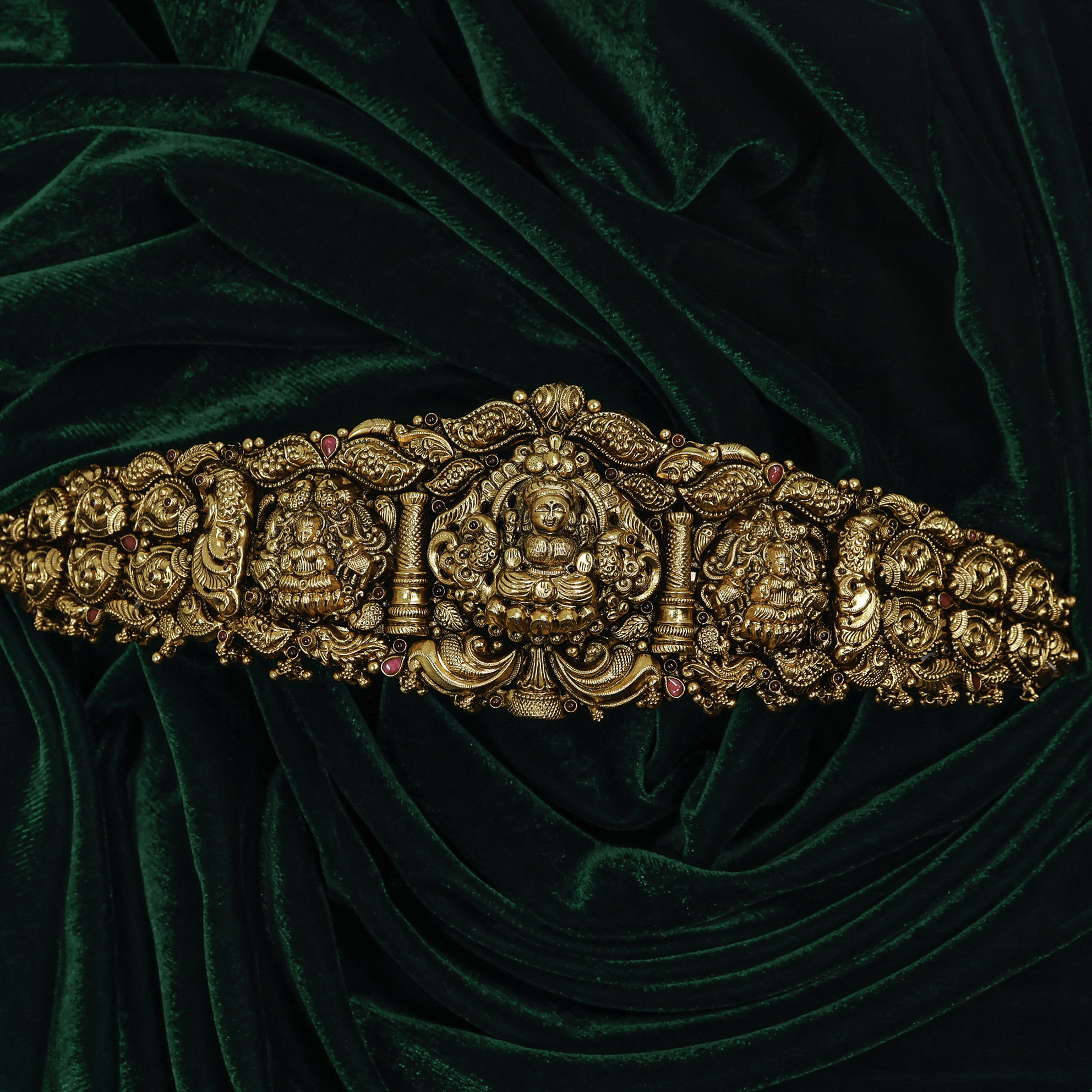 Antique Gold Polished Silver Lakshmi belt with green beads, perfect for traditional Indian attire. Buy Gold Polished Silver Lakshmi belt from Raag Silver Jewellery in Hyderabad.