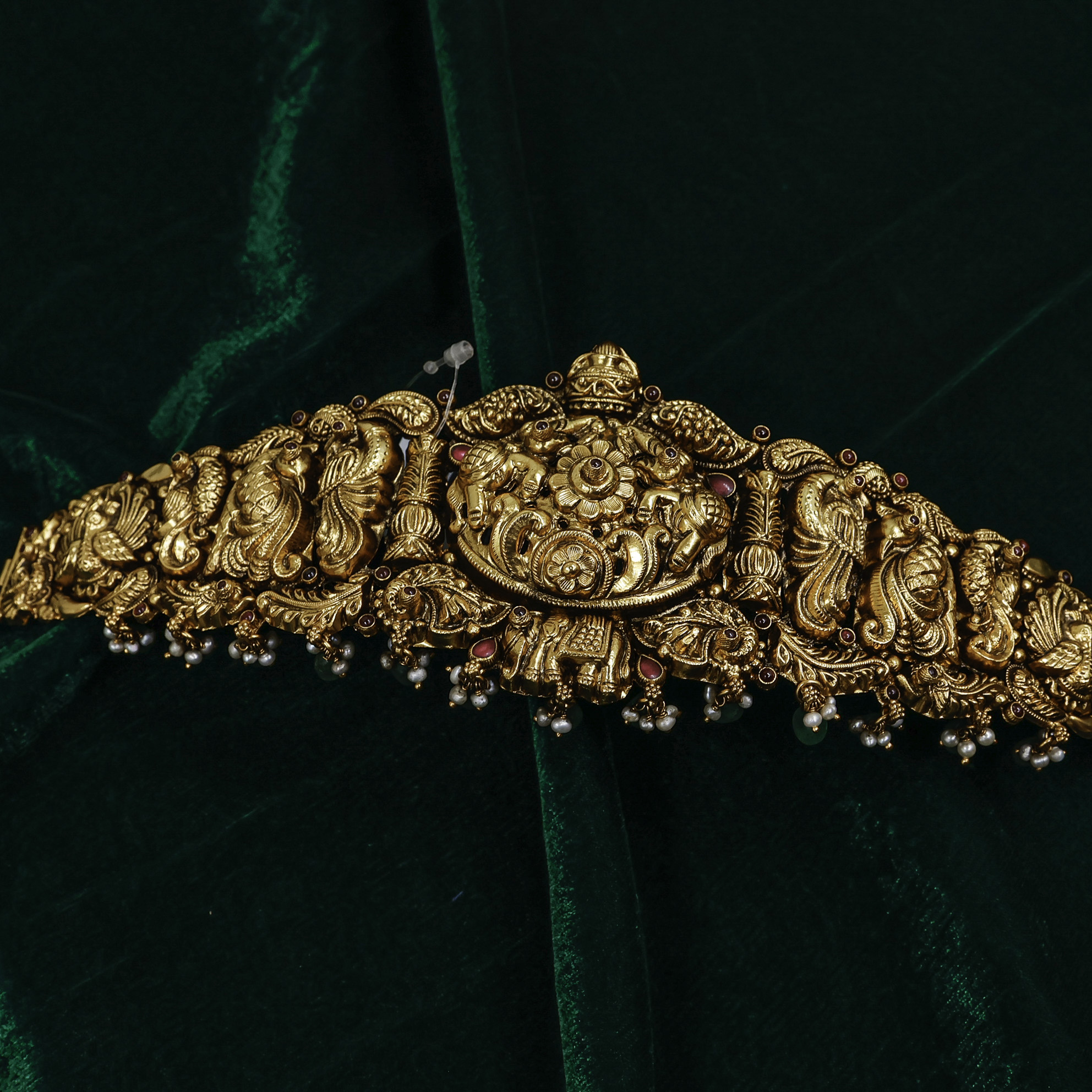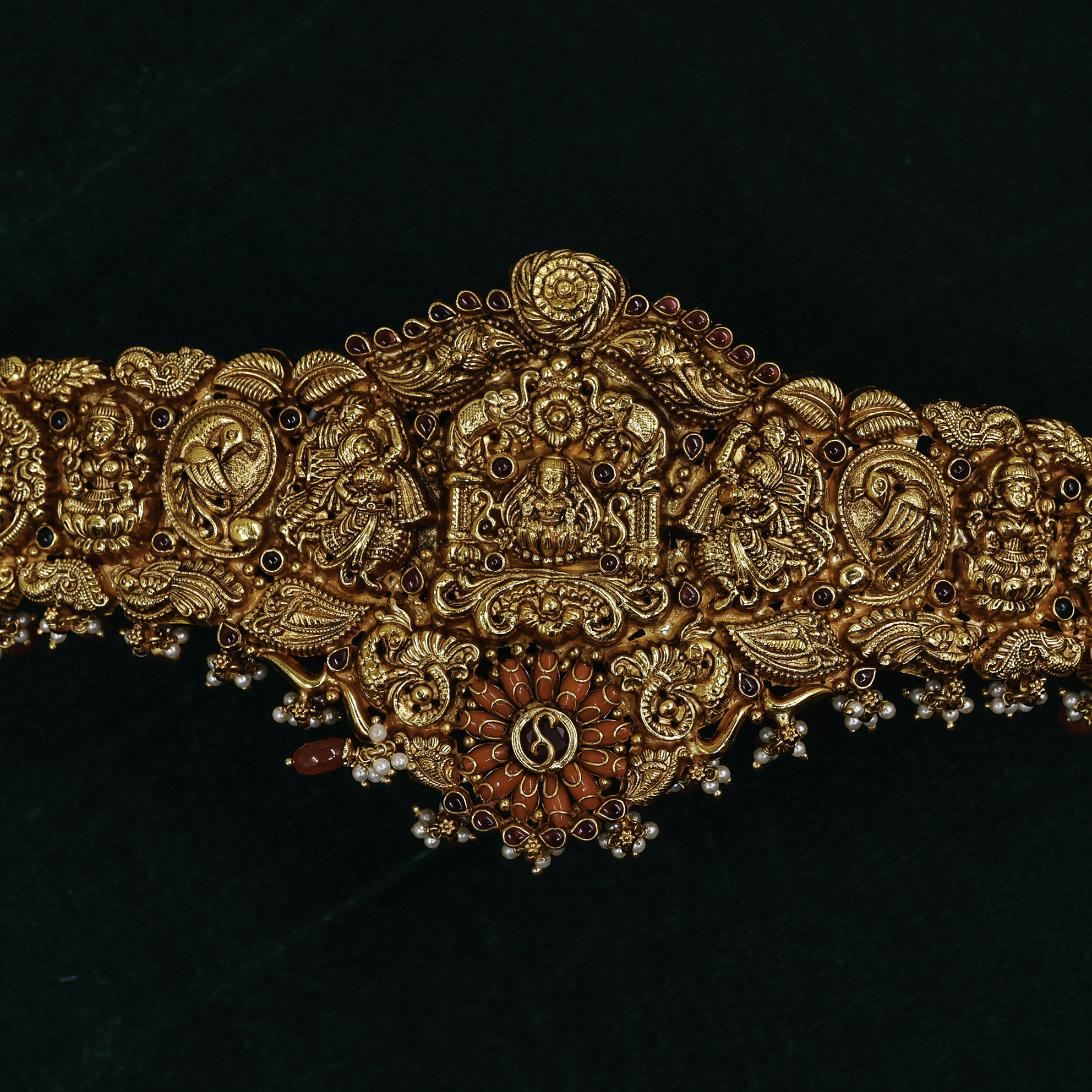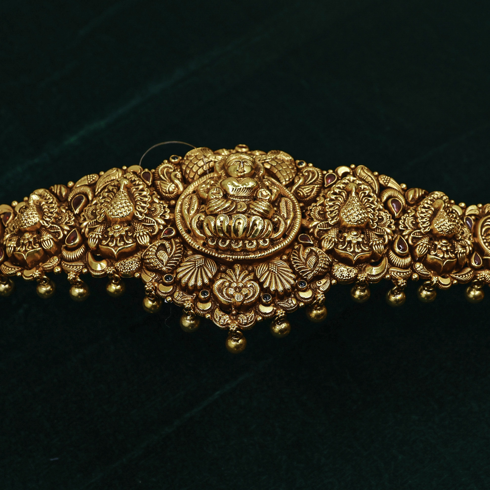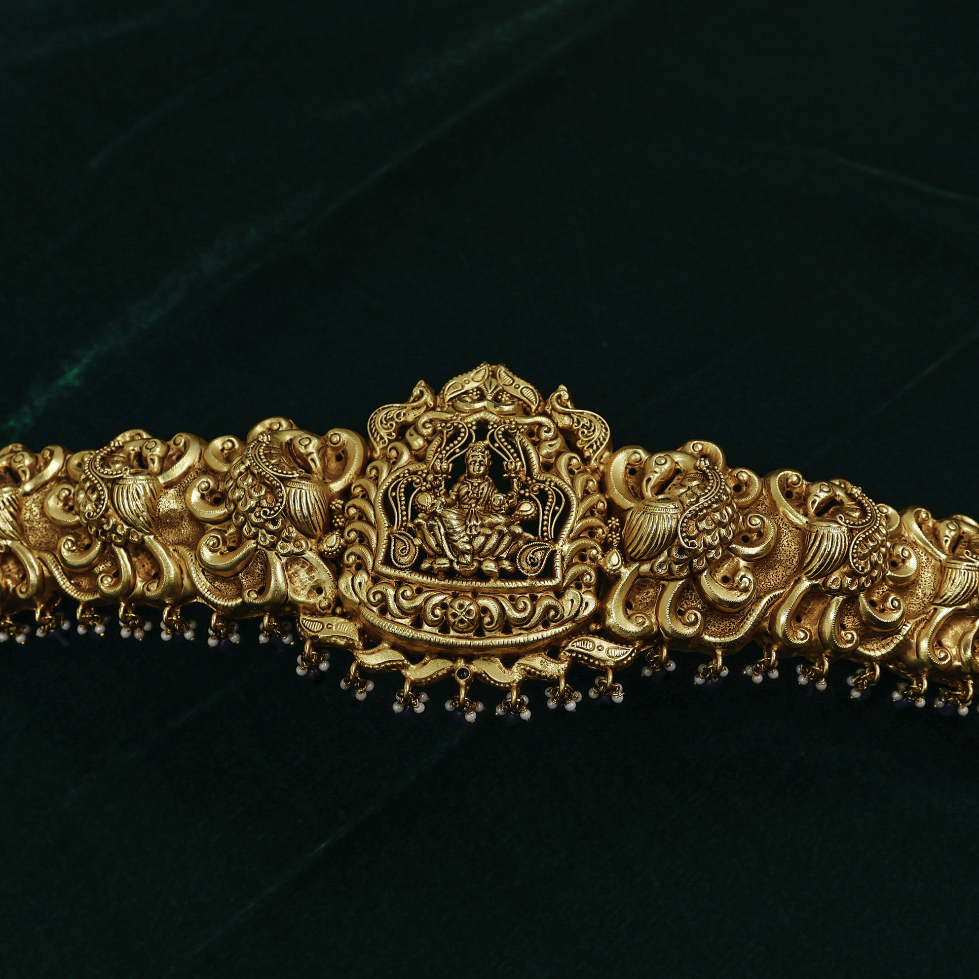 Antique Gold Polished Silver Lakshmi belt with green beads, perfect for traditional Indian attire. Buy Gold Polished Silver Lakshmi belt from Raag Silver Jewellery in Hyderabad.