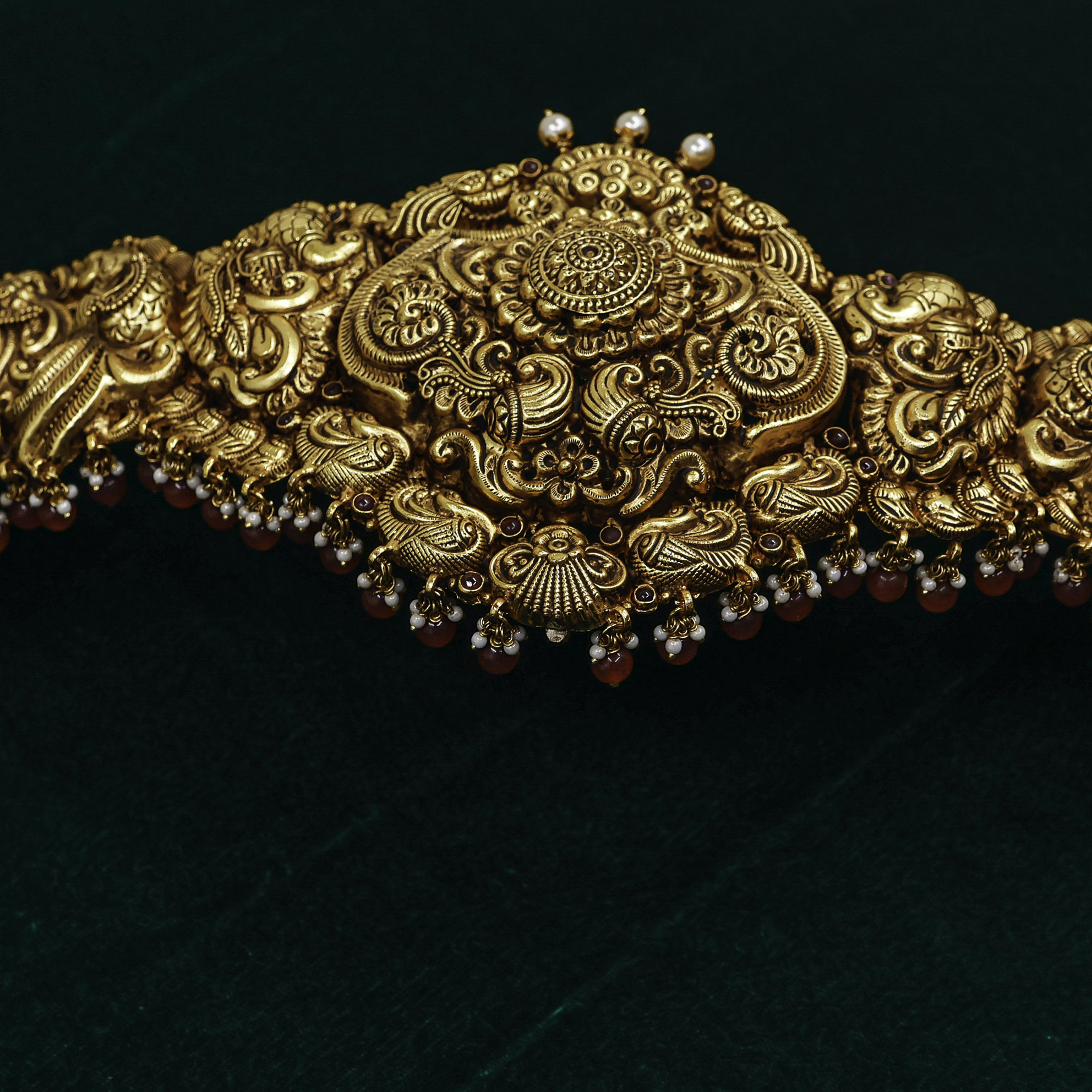 Intricate Gold Polished Silver peacock belt with traditional design, perfect for weddings and festive occasions. Buy Gold Polished Silver peacock belt from Raag Silver Jewellery in Hyderabad.