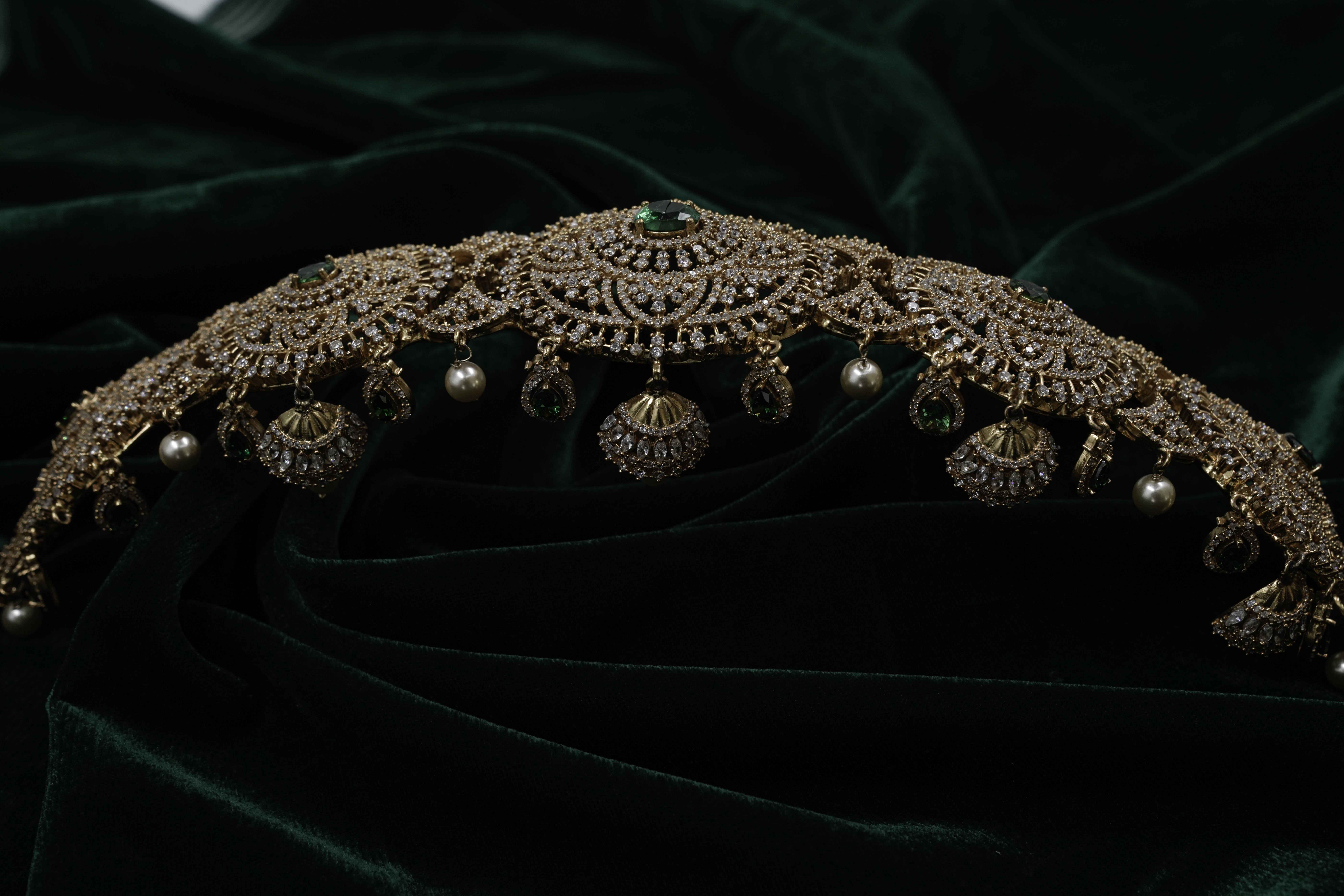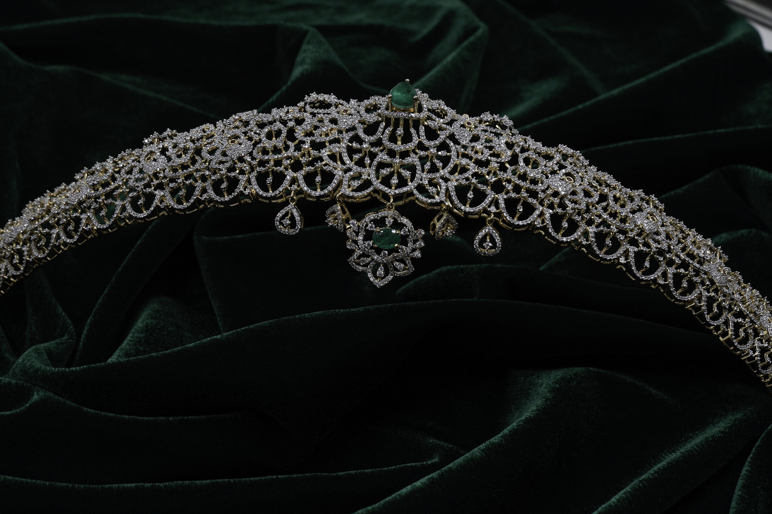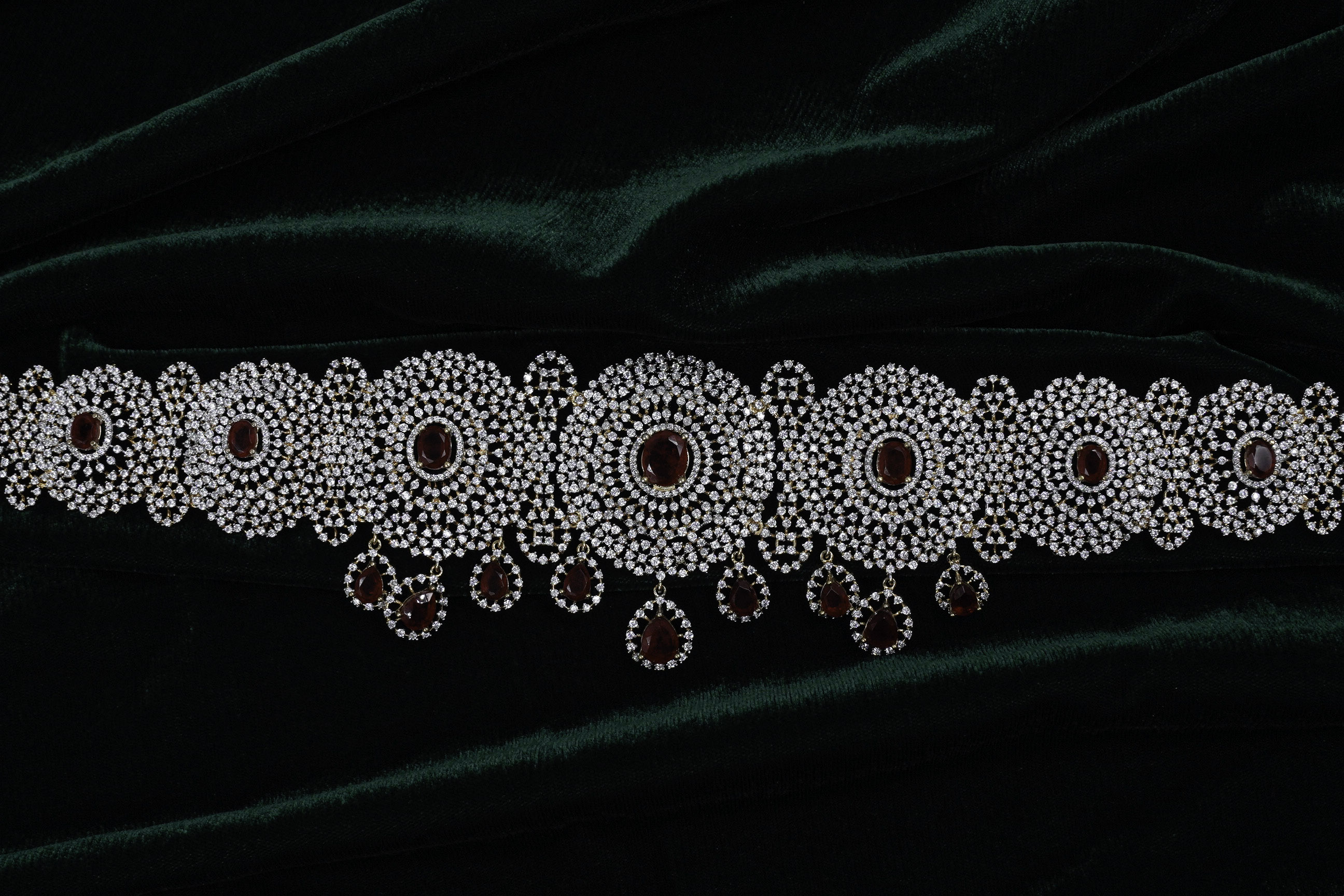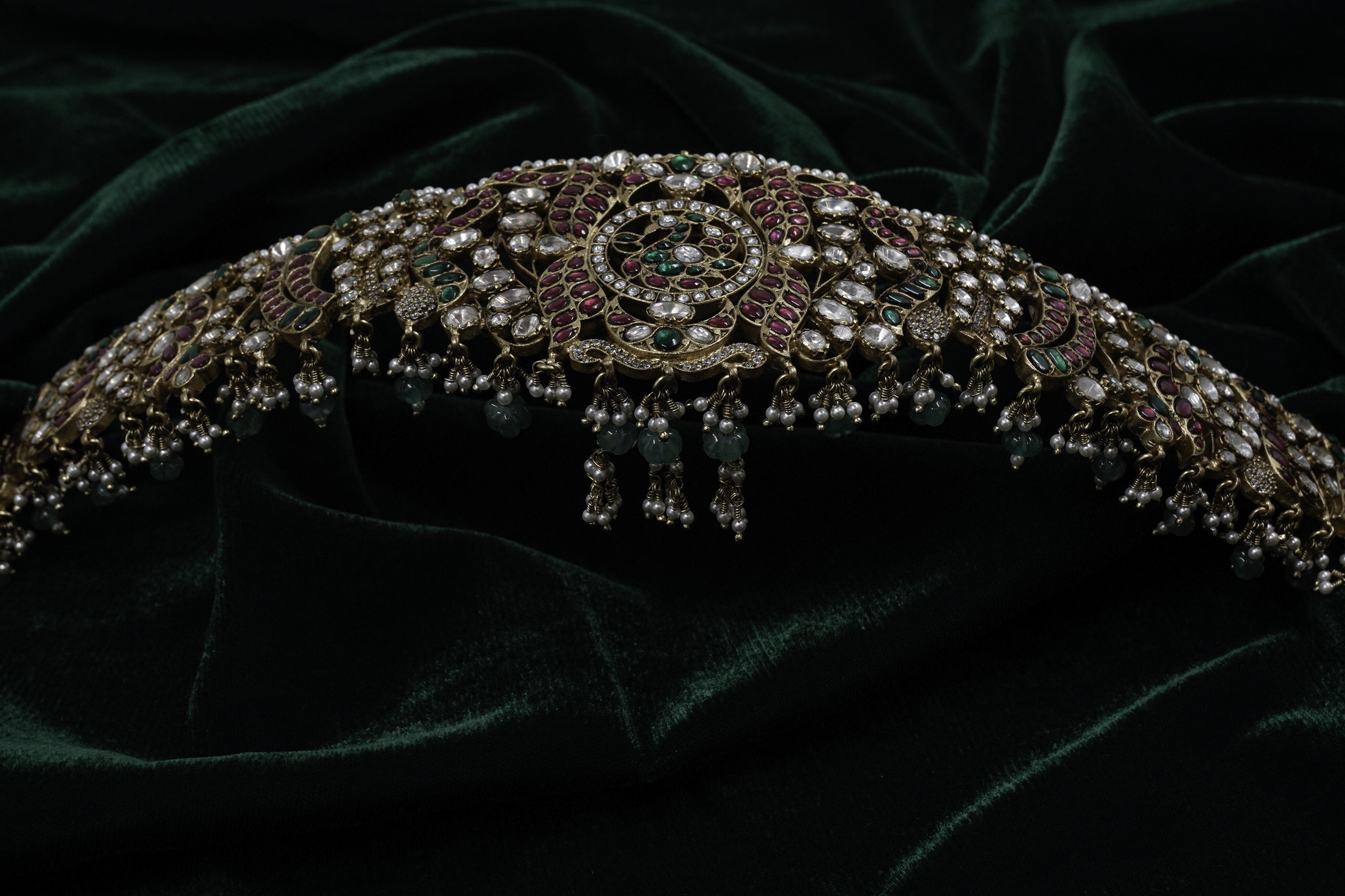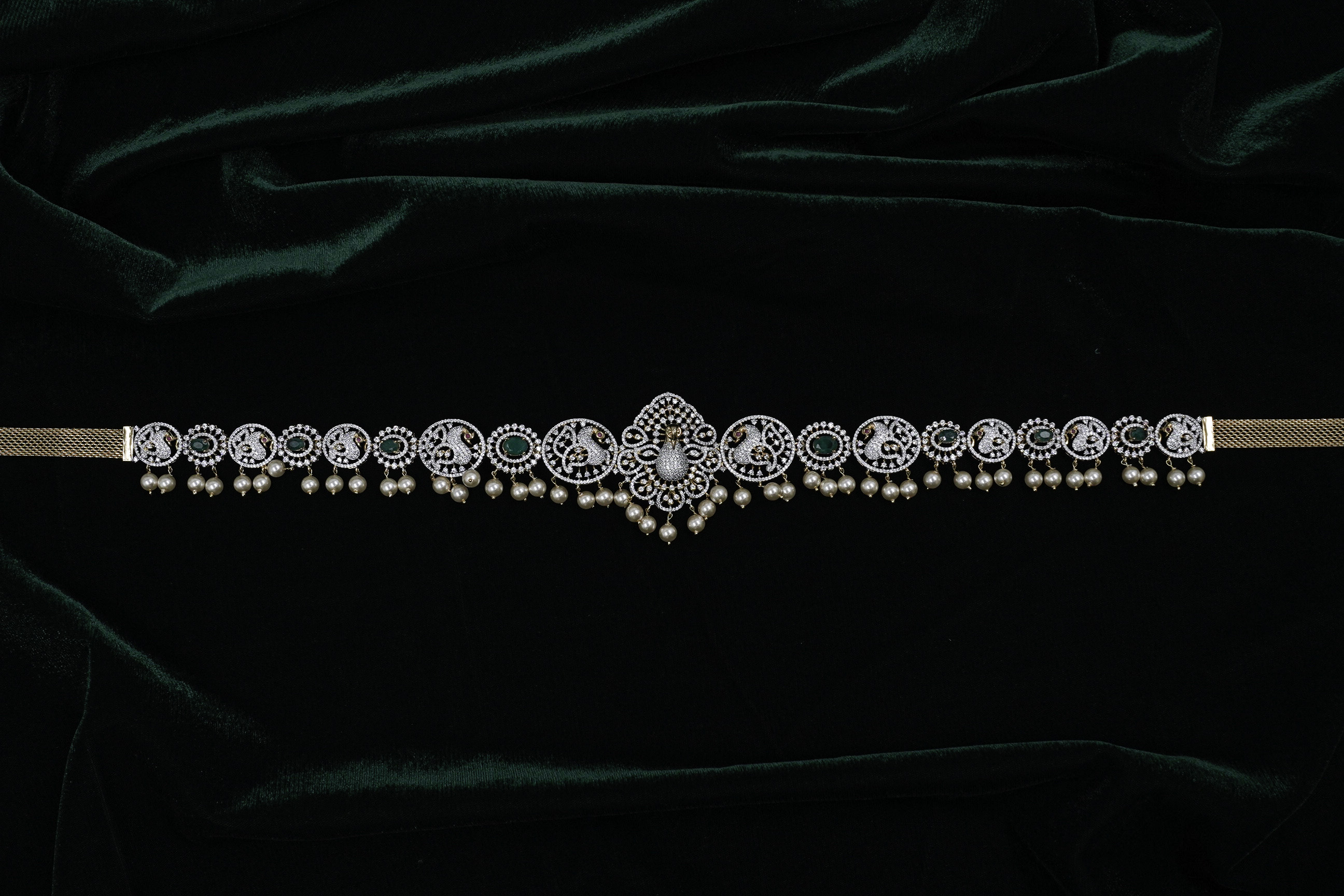 Ornate silver emerald belt with intricate detailing, perfect for weddings and festive occasions. Buy silver emerald belt from Raag Silver Jewellery in Hyderabad.