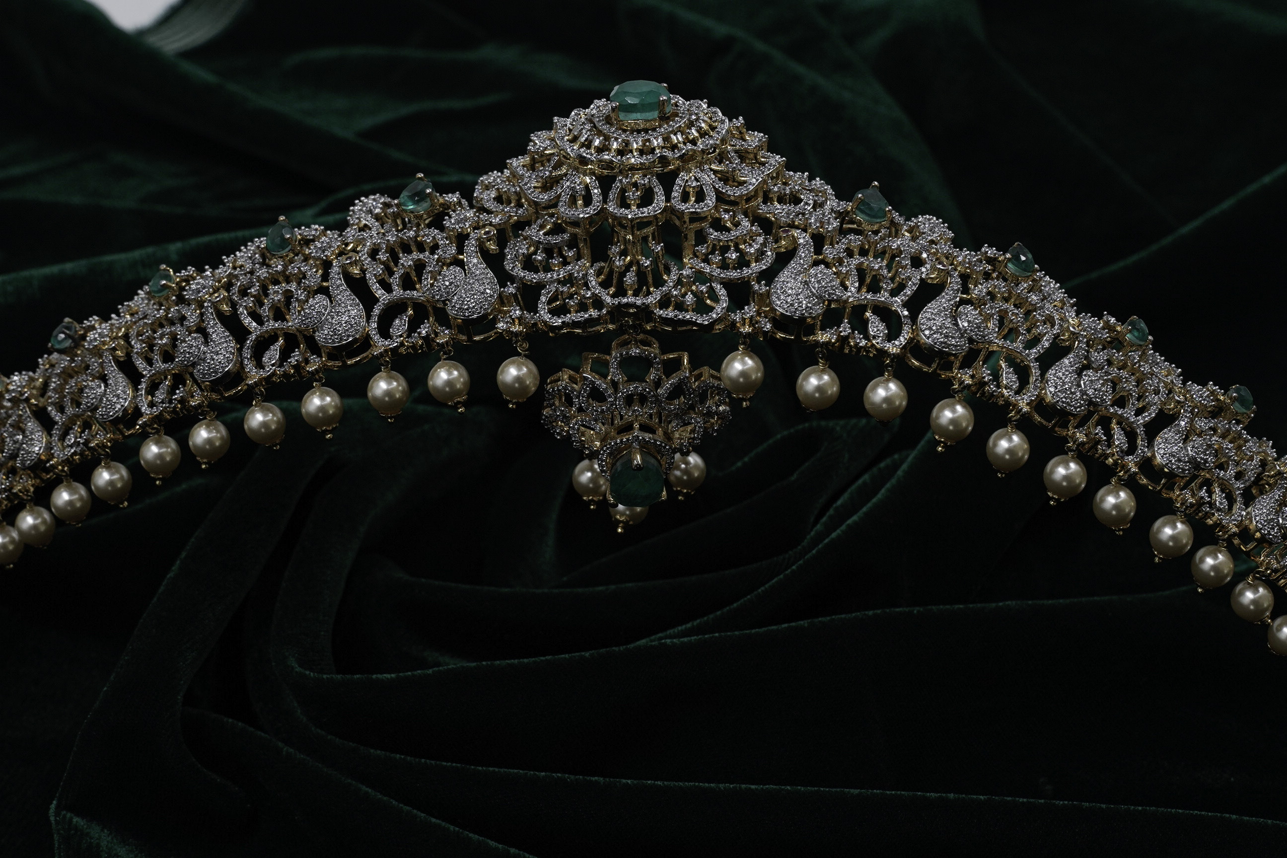 Elegant silver emerald belt with pearl drops, perfect for weddings and festive occasions. Buy Silver Emerald Belt from Raag Silver Jewellery in Hyderabad.