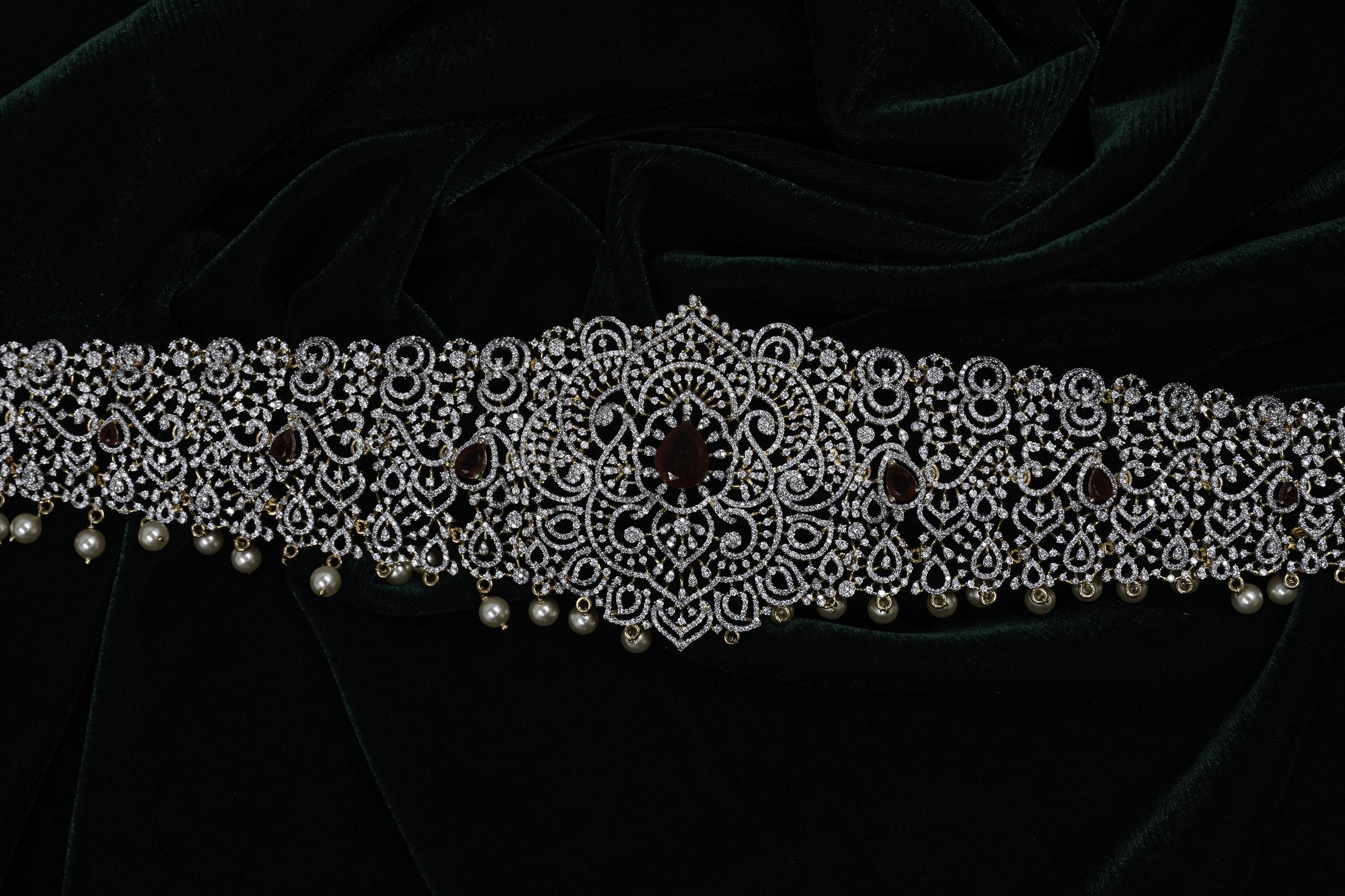 Ornate silver hip belt with intricate detailing, perfect for weddings and traditional events. Buy silver hip belt from Raag Silver Jewellery in Hyderabad.