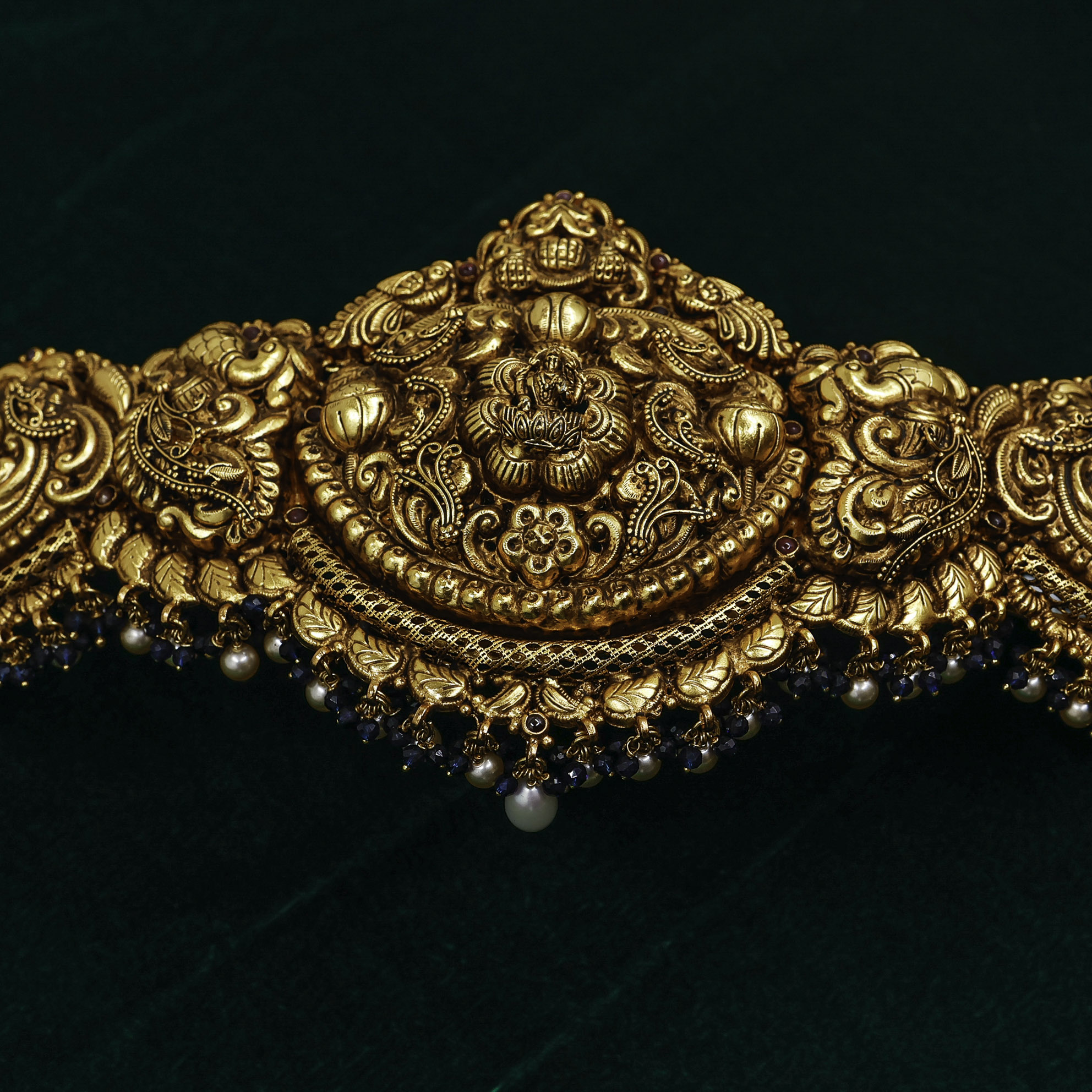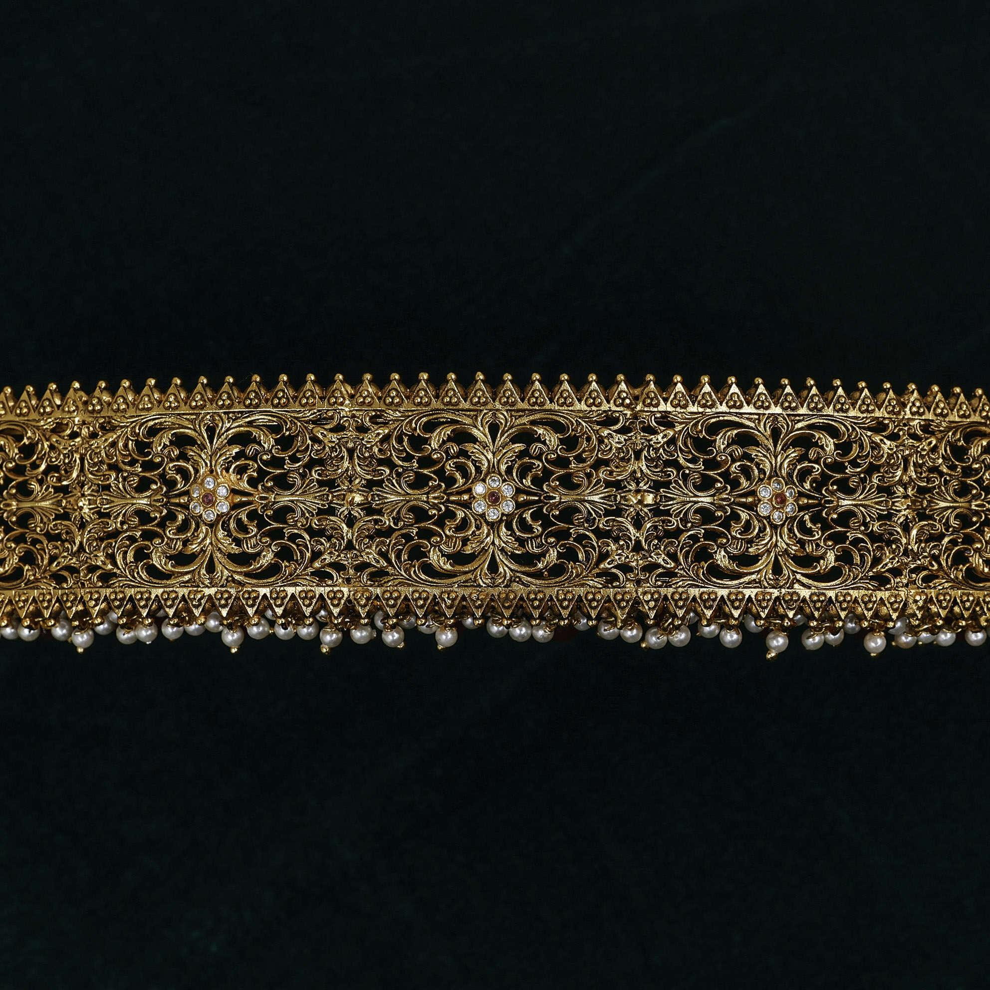 Intricate Gold Polished Silver tone belt with traditional Indian design, perfect for weddings and festive occasions. Buy Gold Polished Silver tone belt from Raag Silver Jewellery in Hyderabad.