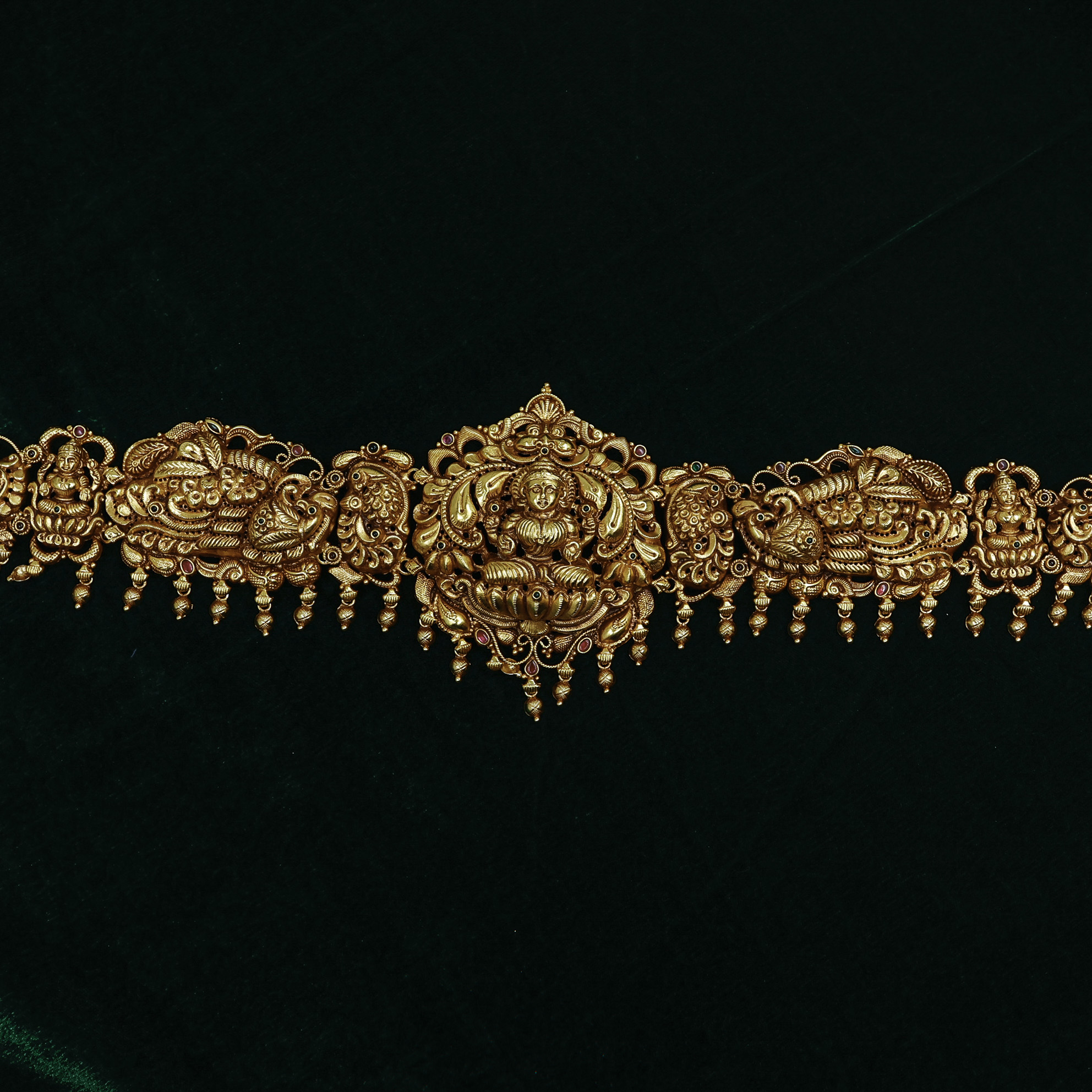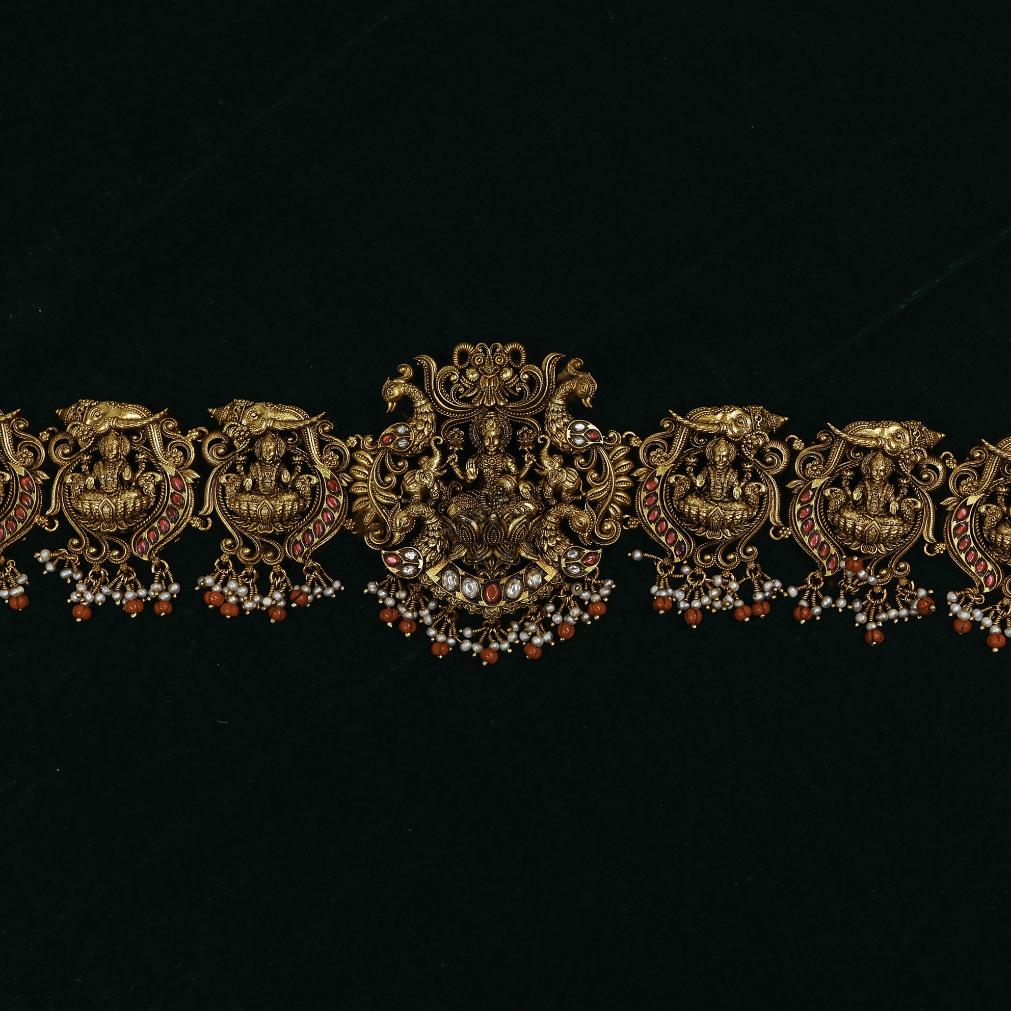 Antique silver hip belt featuring goddess Lakshmi design, perfect for traditional occasions. Buy Silver Hip Belt from Raag Silver Jewellery in Hyderabad.