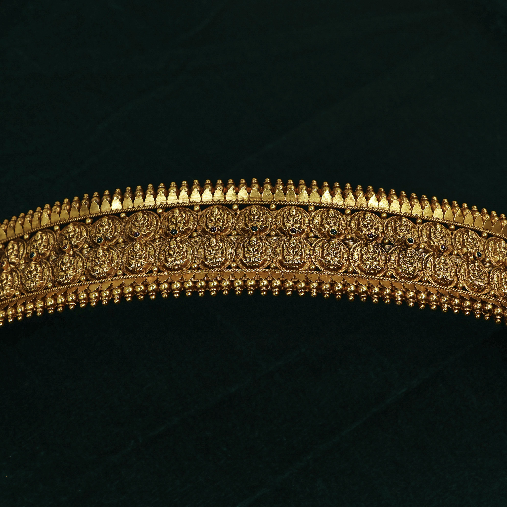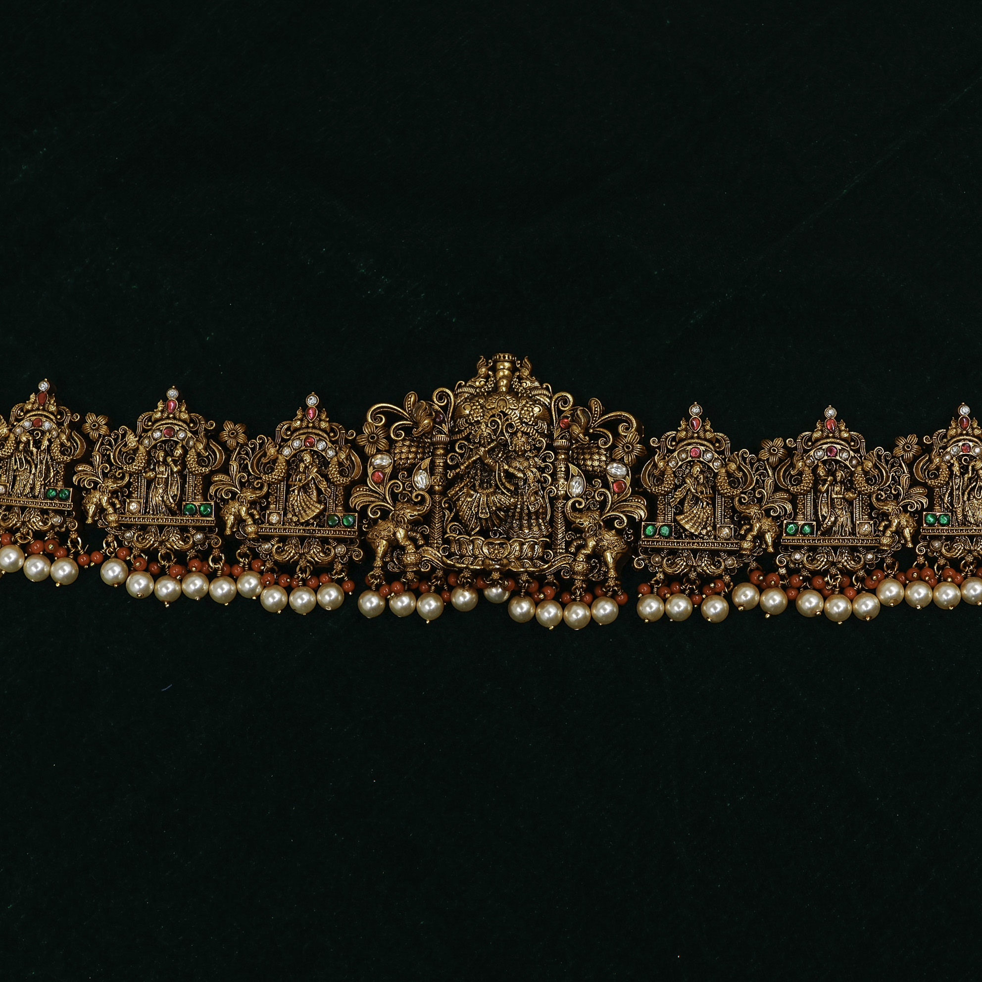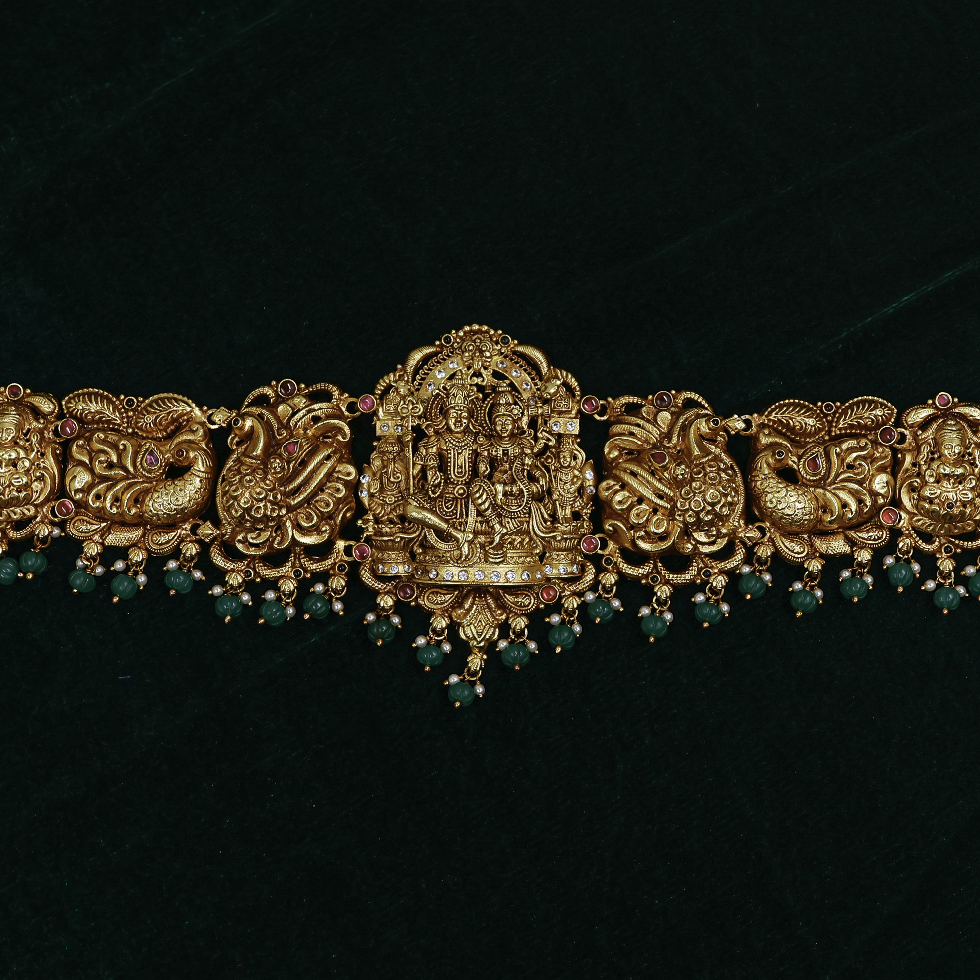 Intricately crafted Gold Polished Silver belt featuring Indian deity motifs, perfect for festive occasions. Buy Gold Polished Silver Belt from Raag Silver Jewellery in Hyderabad.