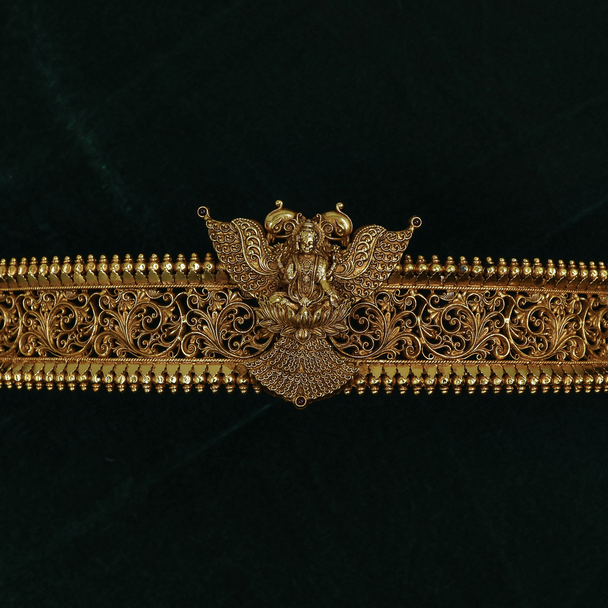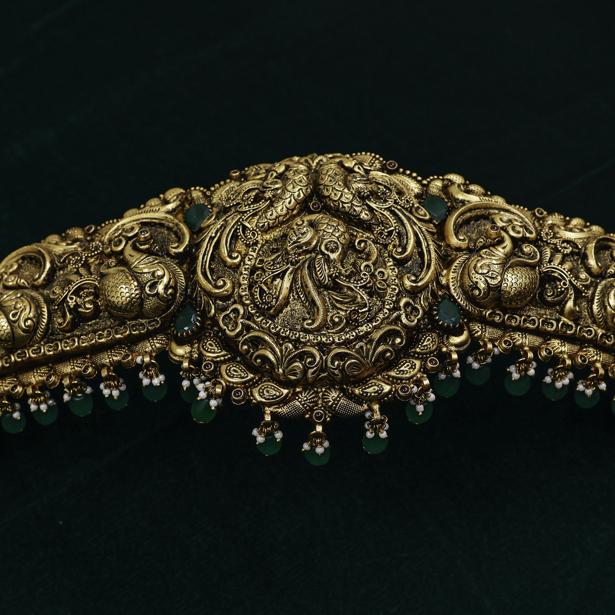 Intricate Gold Polished Silver peacock belt, a statement piece showcasing traditional Indian craftsmanship. Buy Gold Polished Silver Peacock Belt from Raag Silver Jewellery in Hyderabad.