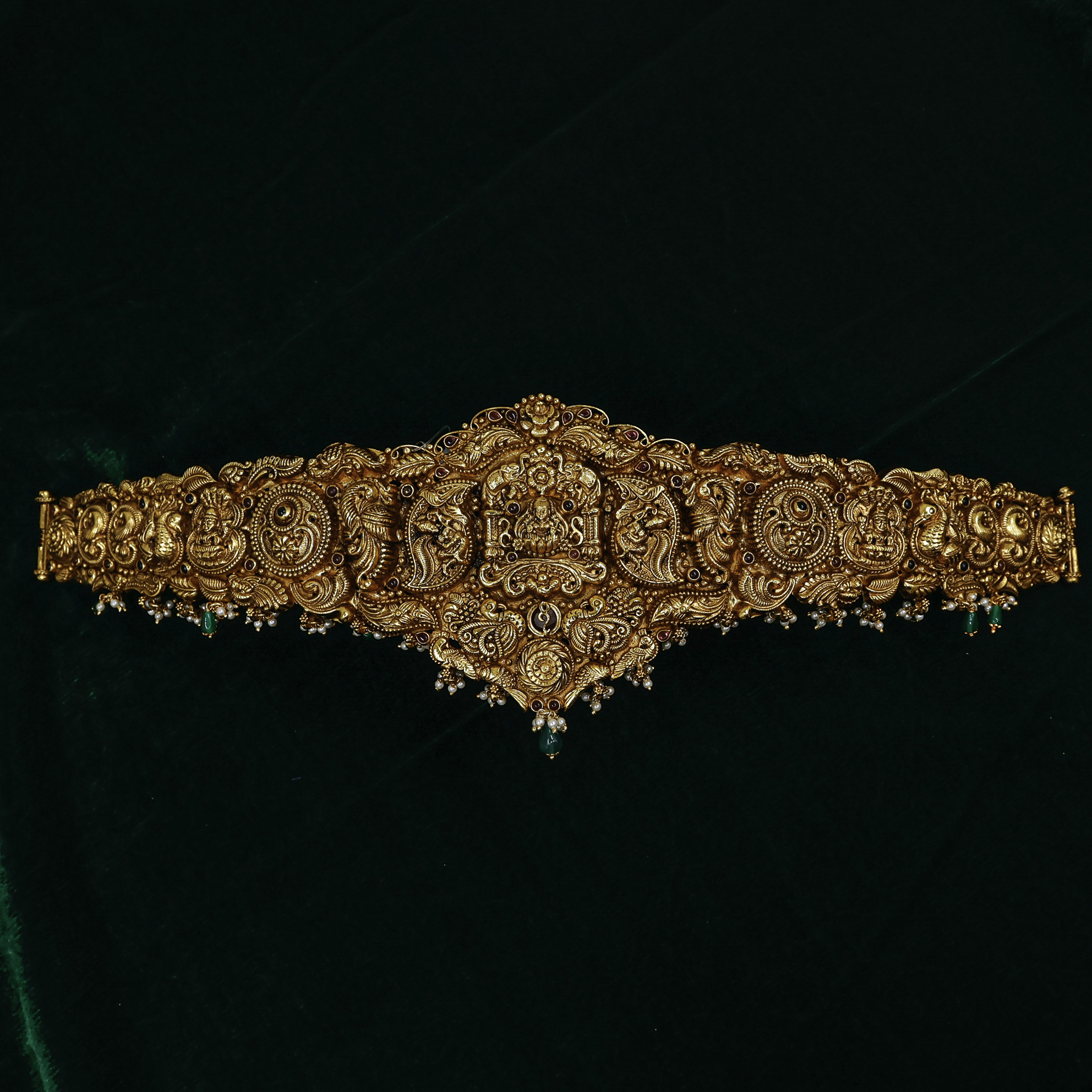 Ornate Gold Polished Silver hip belt featuring deity motifs, a traditional Indian jewelry piece. Buy Gold Polished Silver hip belt from Raag Silver Jewellery in Hyderabad.