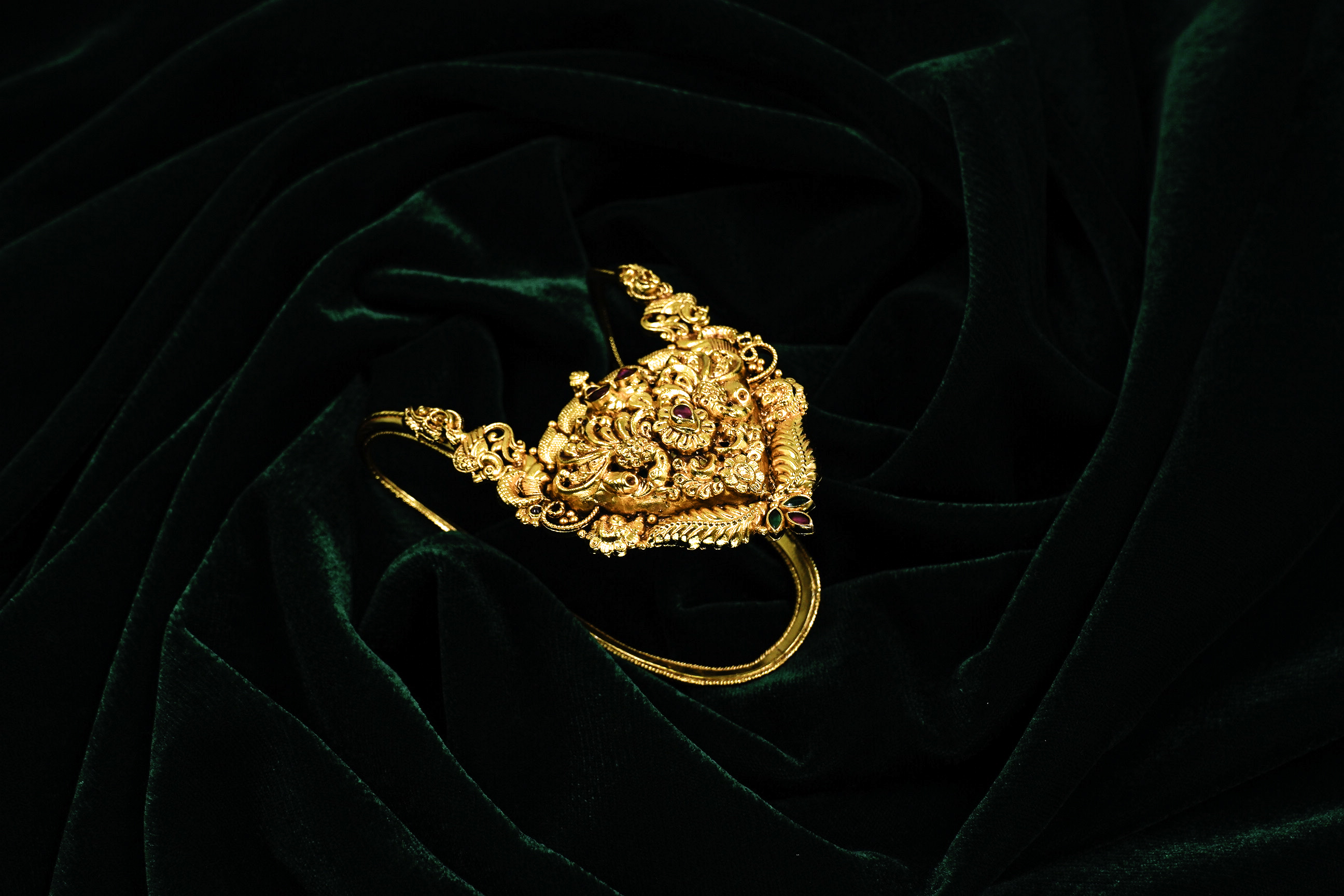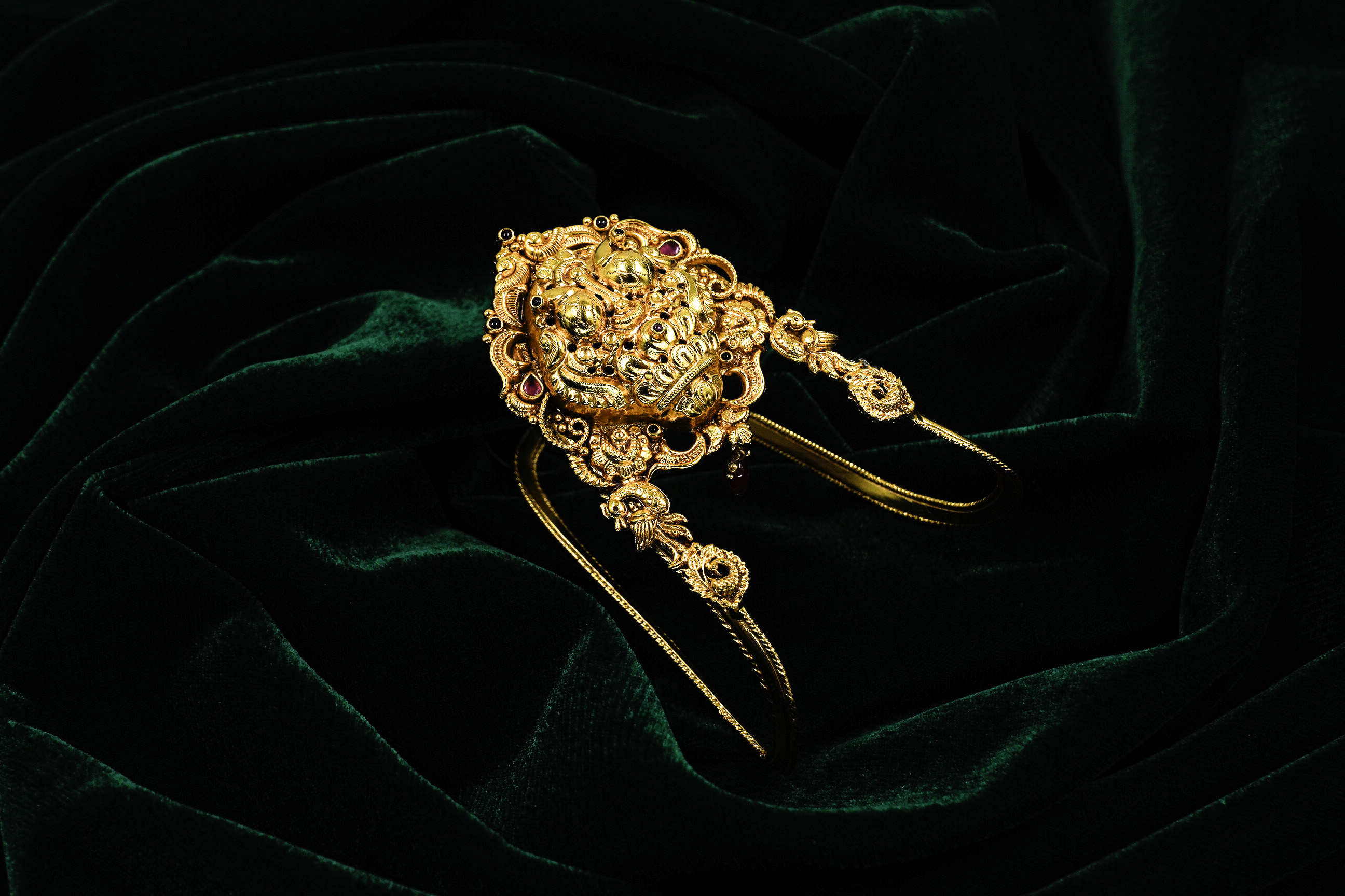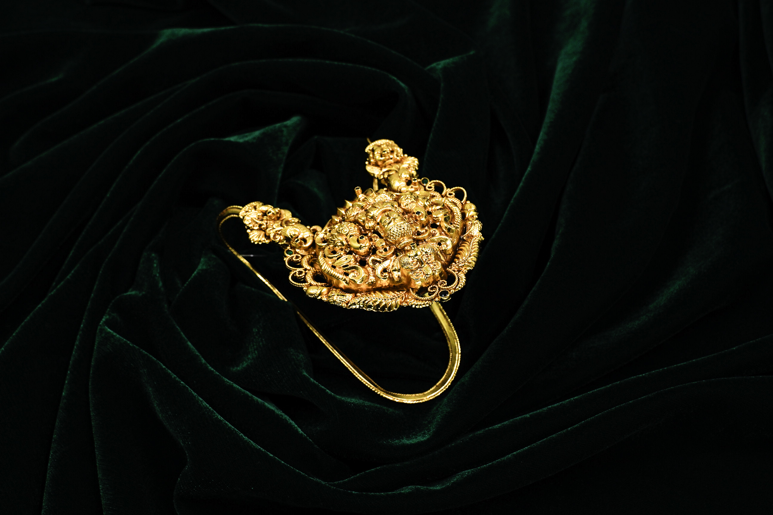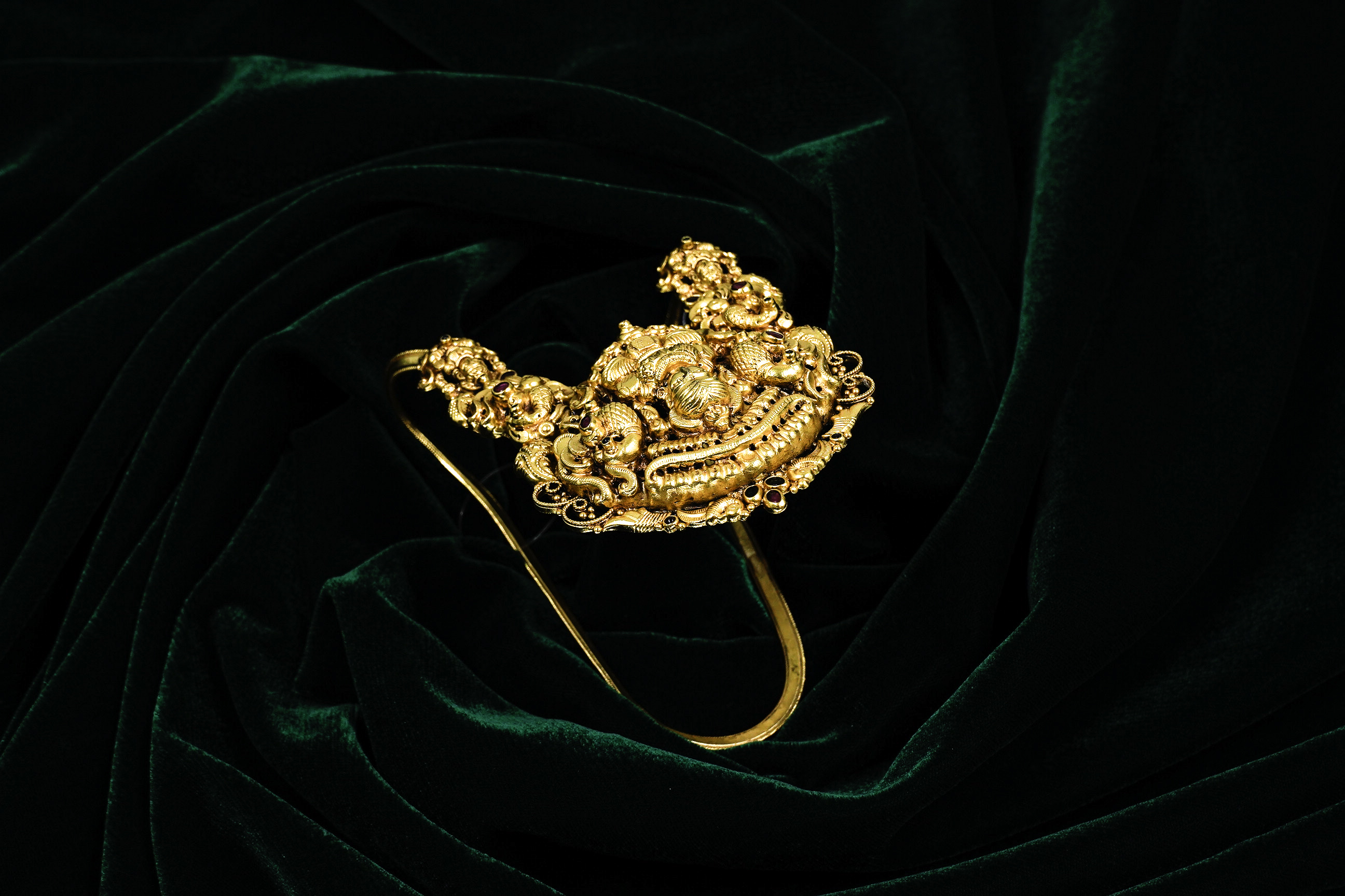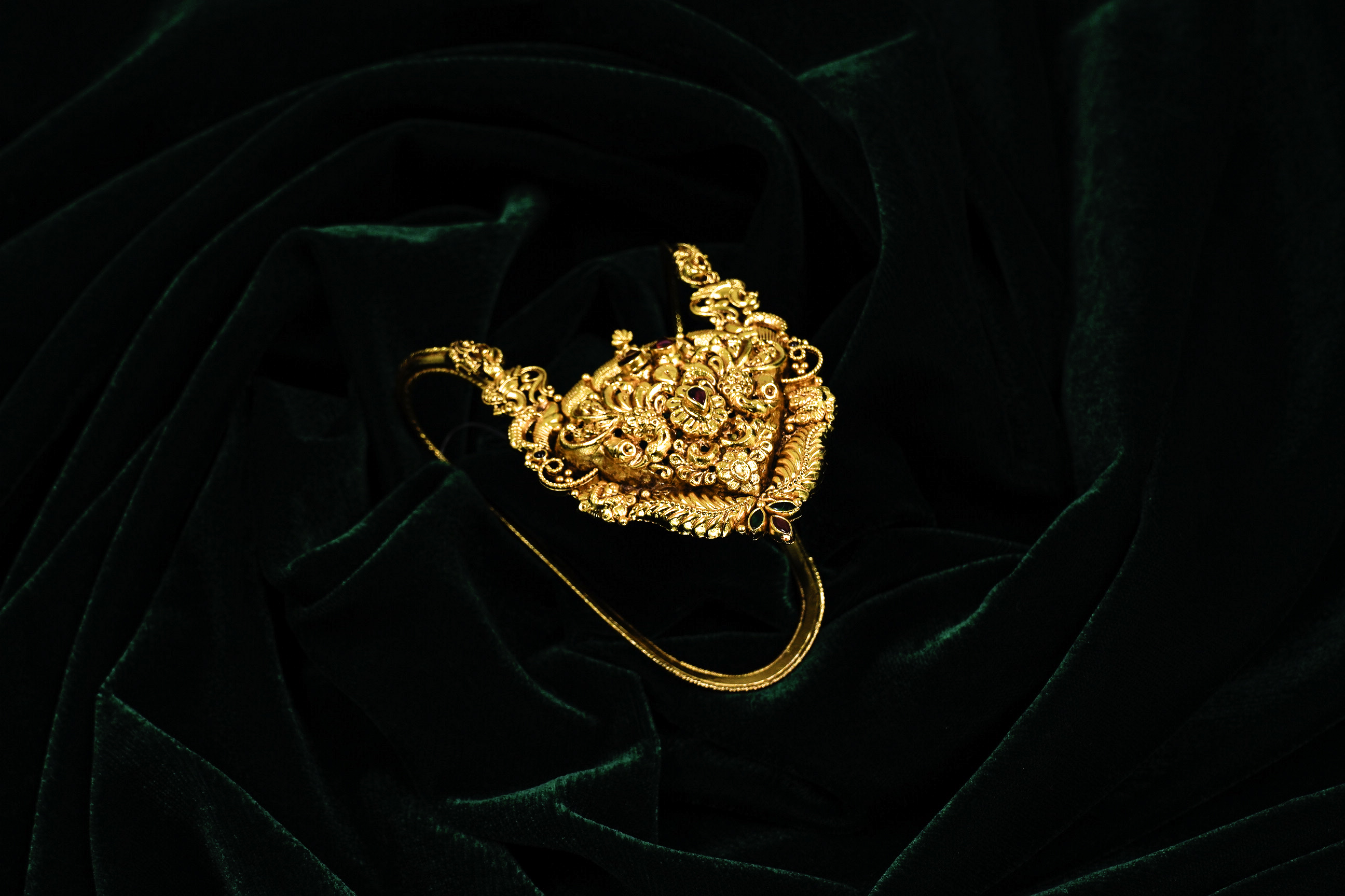 Ornate Gold Polished Silver bridal choker necklace featuring intricate detailing, perfect for weddings and special occasions. Buy Gold Polished Silver bridal choker from Raag Silver Jewellery in Hyderabad.
