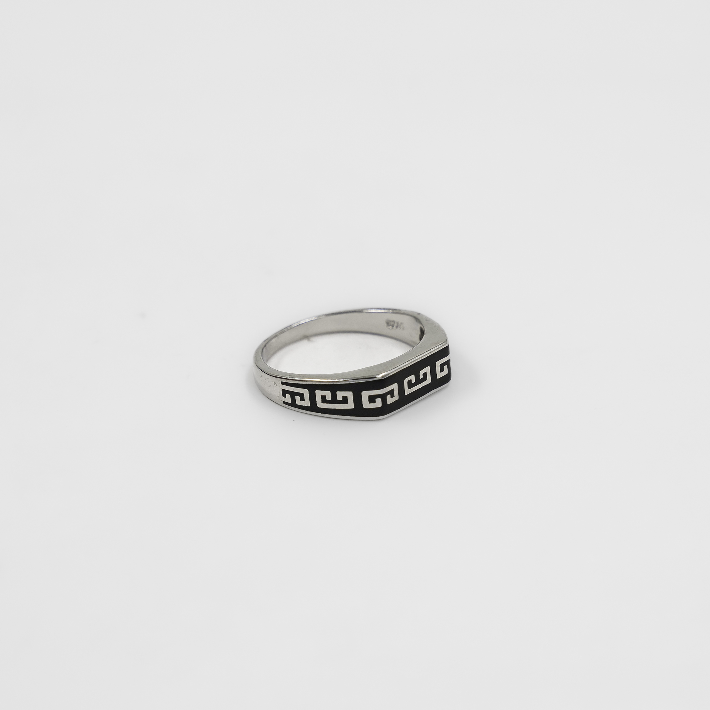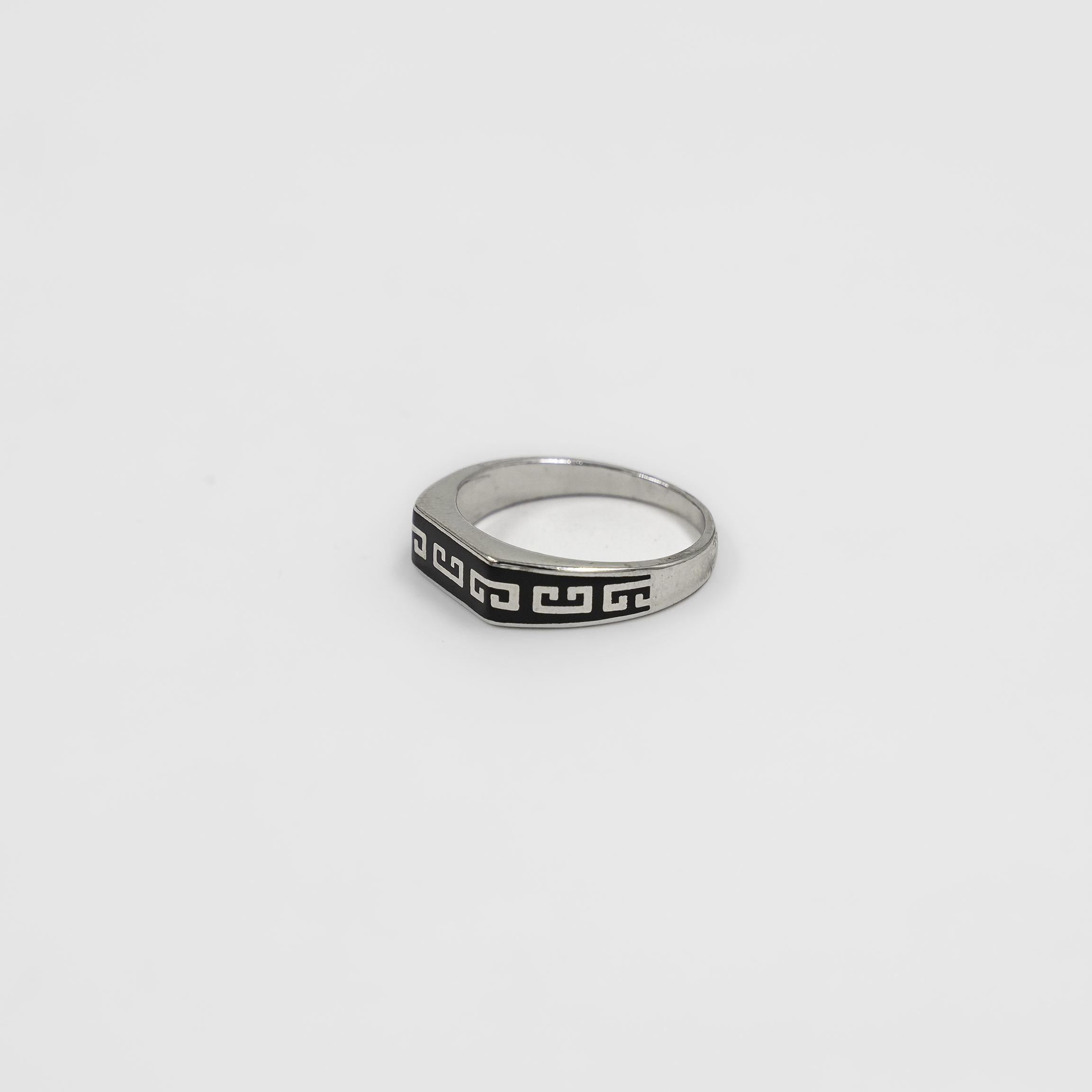 Elegant Silver Black Enamel Greek Key Pattern Ring Band