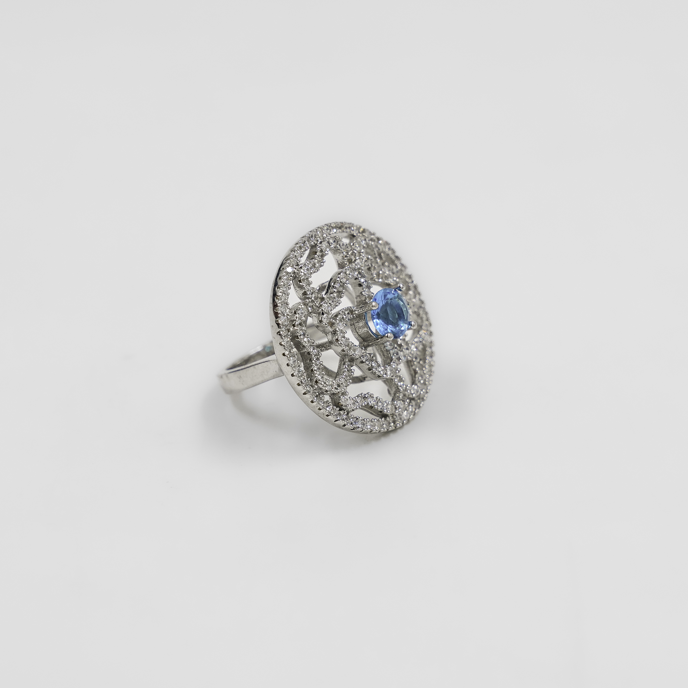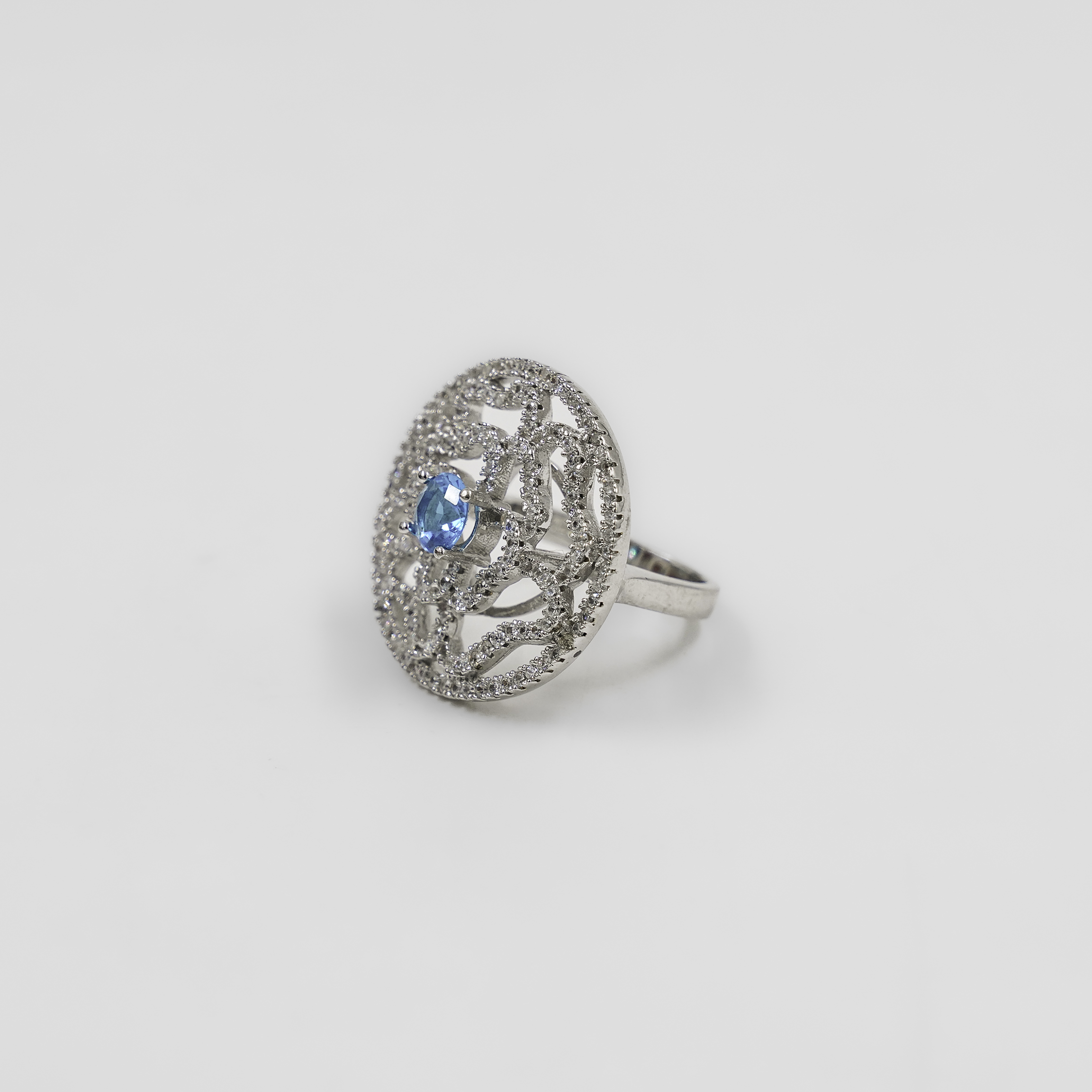 Elegant Silver Ring With Blue Gemstone Round Floral Design