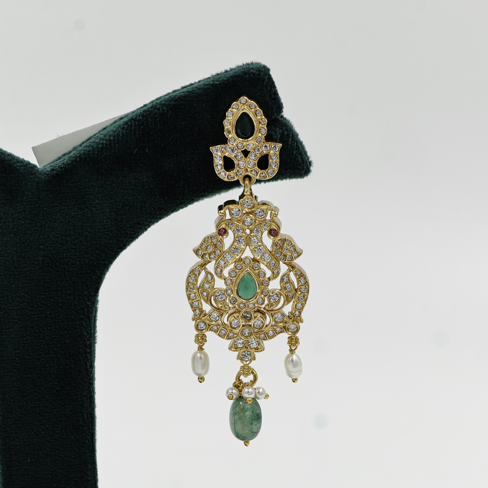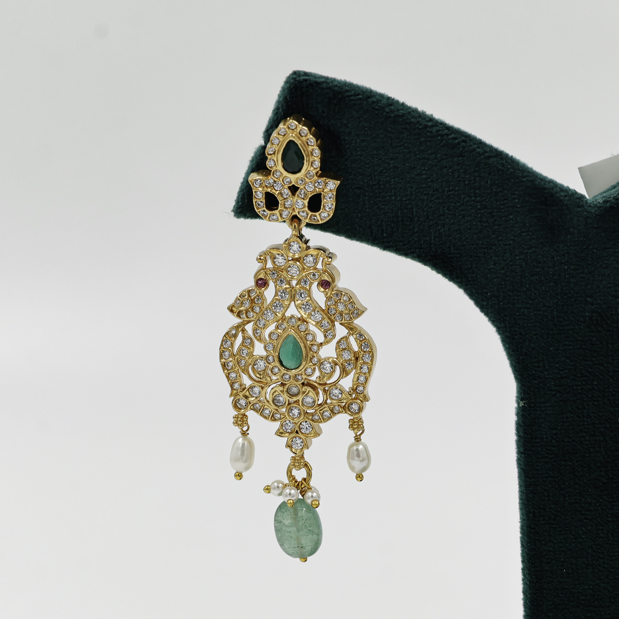 Gold Polished Silver emerald drop earrings with intricate design, perfect for weddings and festive occasions. Buy emerald drop earrings from Raag Silver Jewellery in Hyderabad.