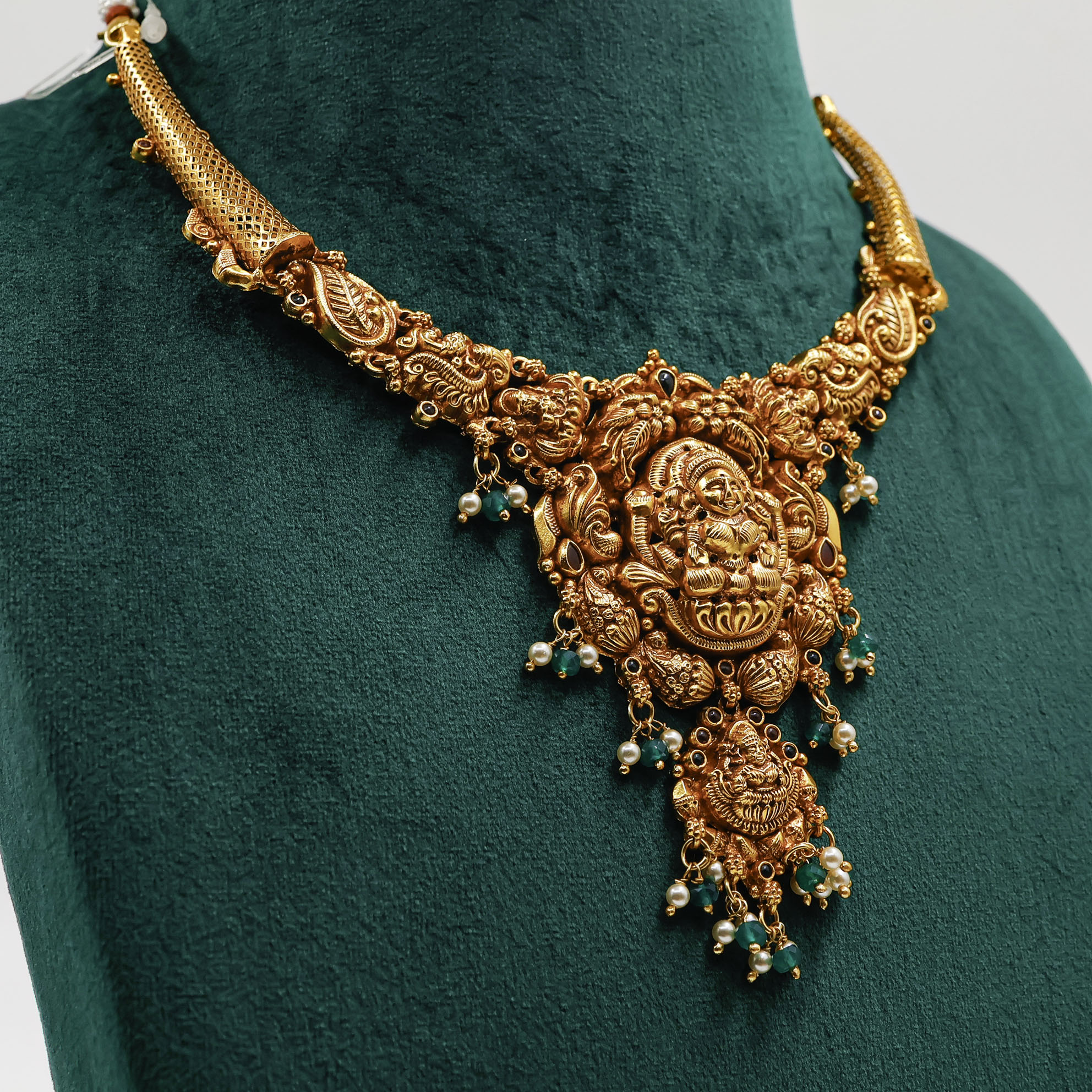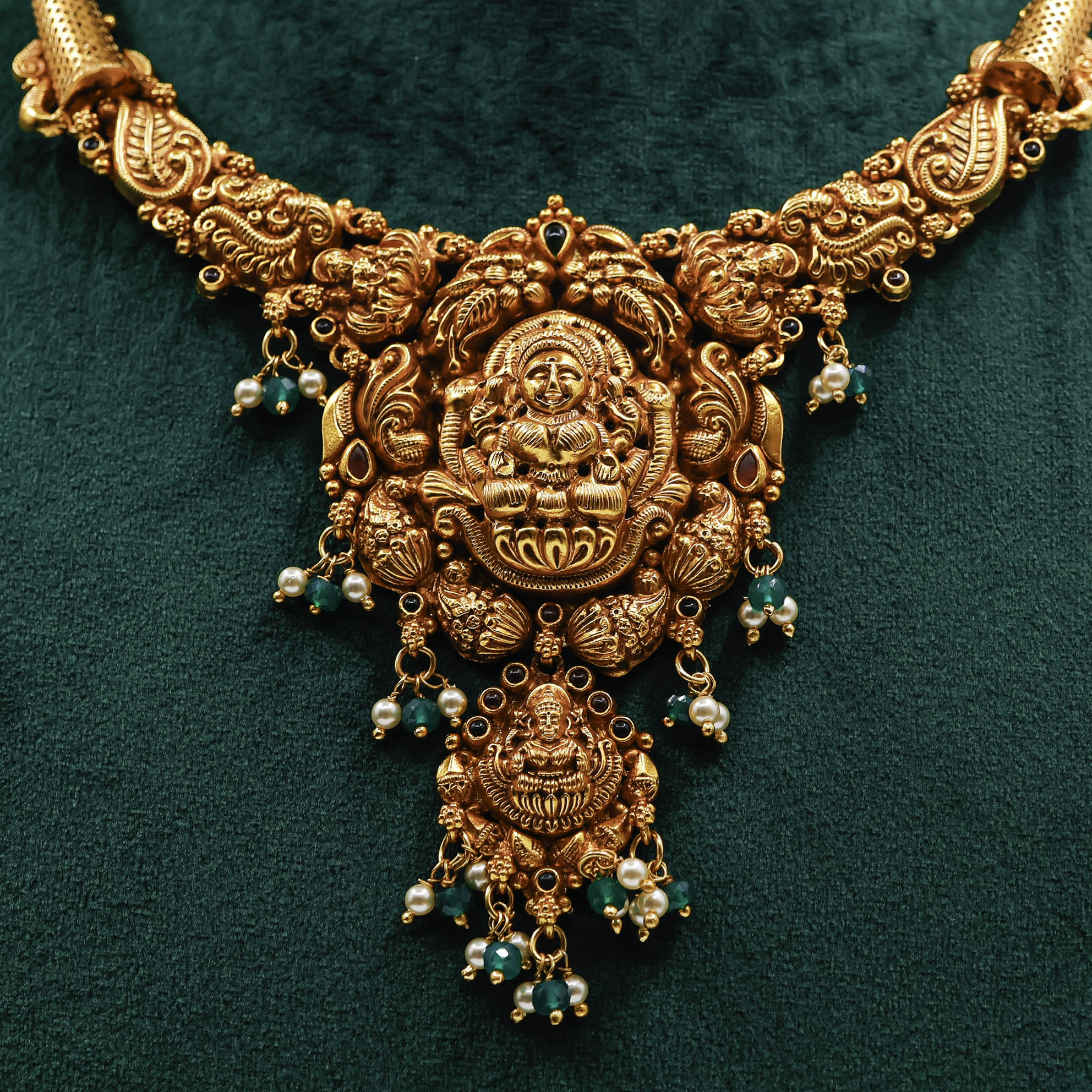 Gold Polished Silver necklace with emerald stones and pearls, a classic and elegant piece. Buy Emerald Gold Polished Silver Necklace from Raag Silver Jewellery in Hyderabad.