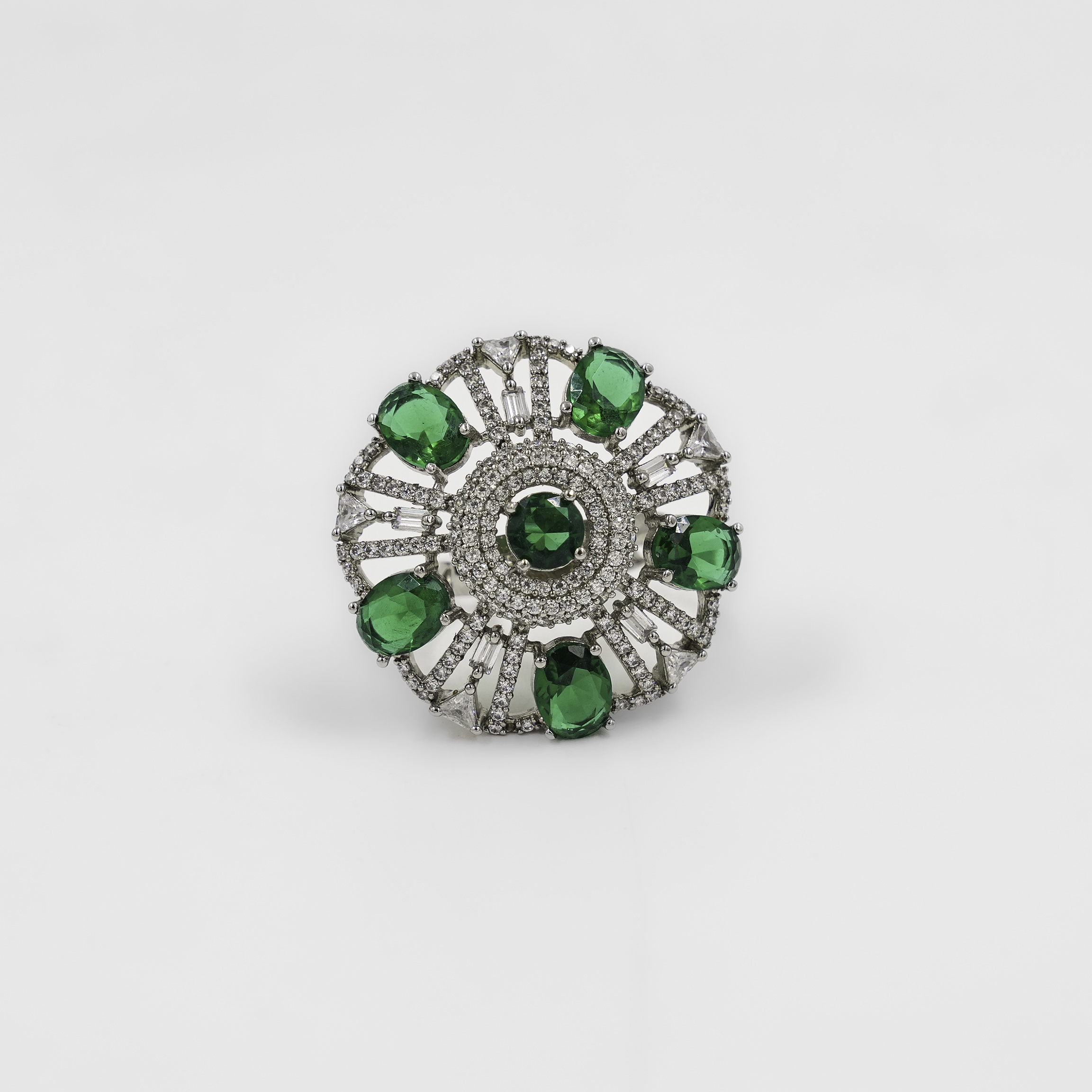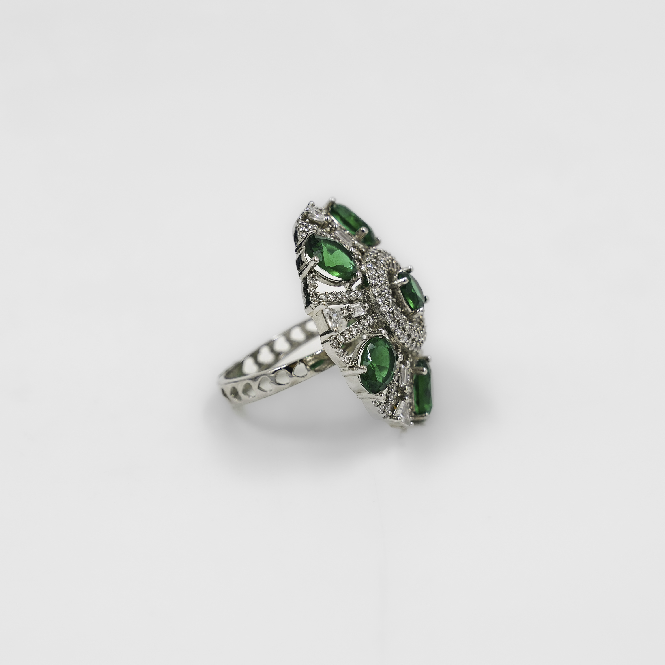 Floral Design Silver Ring With Emerald Green Stones