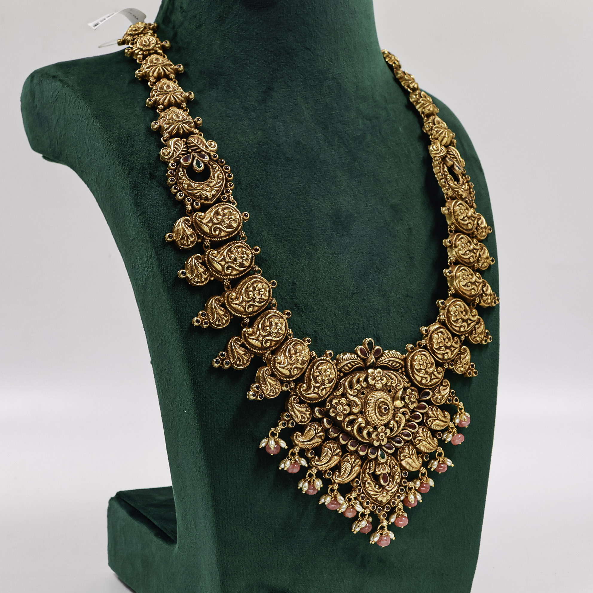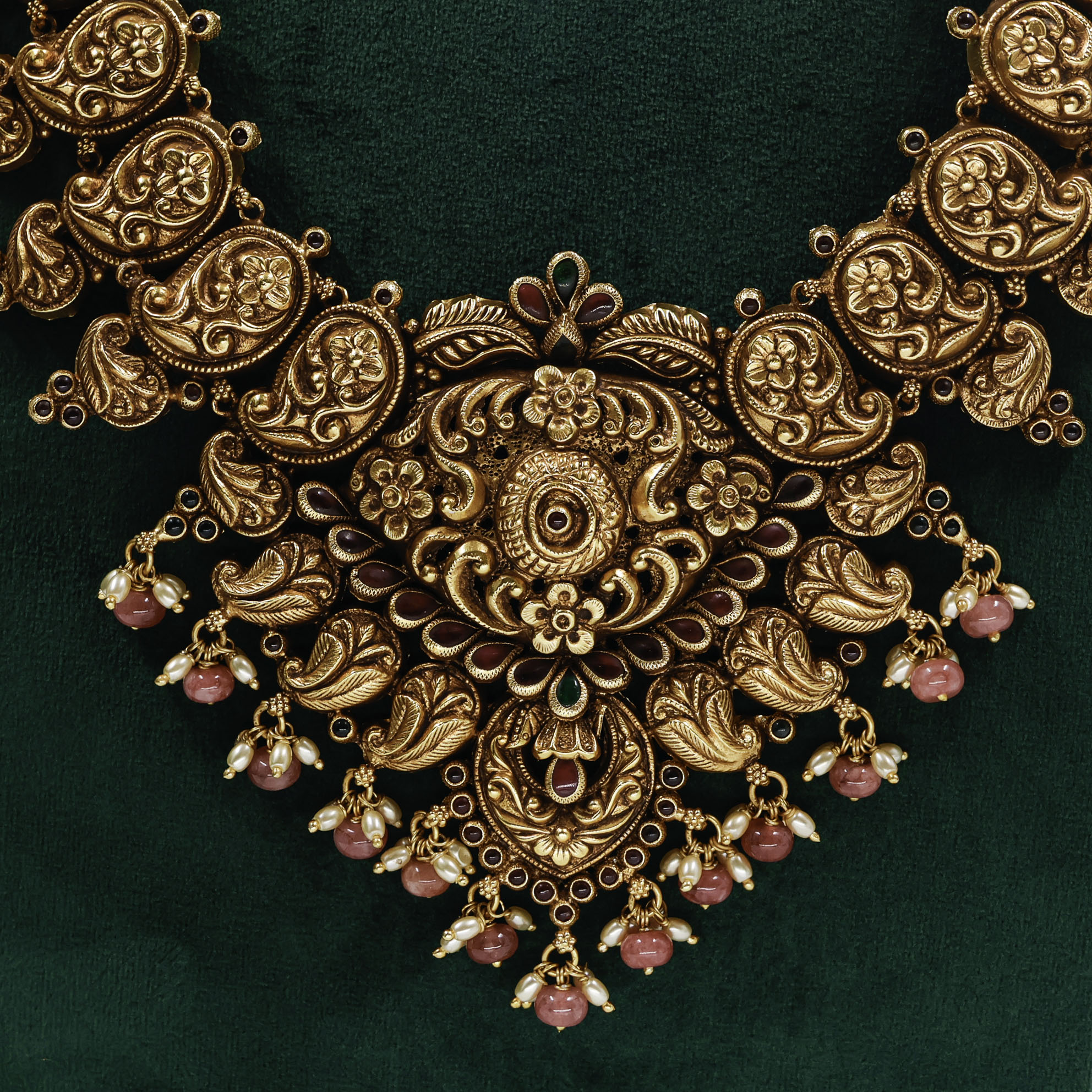Intricate Gold Polished Silver necklace featuring traditional Indian designs, perfect for weddings and festive occasions. Buy Gold Polished Silver Necklace from Raag Silver Jewellery in Hyderabad.