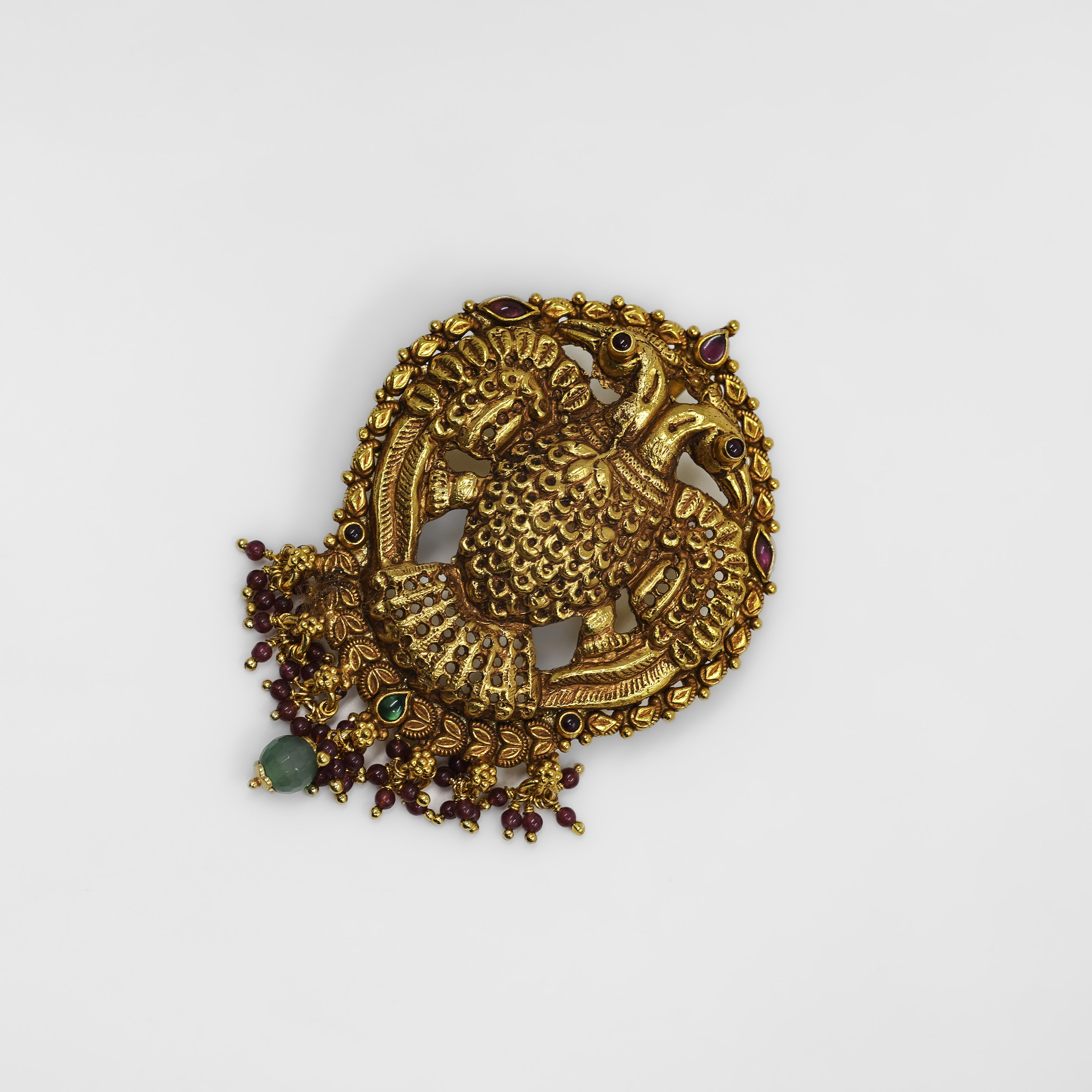 Intricately designed Gold Polished Silver brooch with stone accents, a perfect traditional accessory. Buy Gold Polished Silver Brooch from Raag Silver Jewellery in Hyderabad.