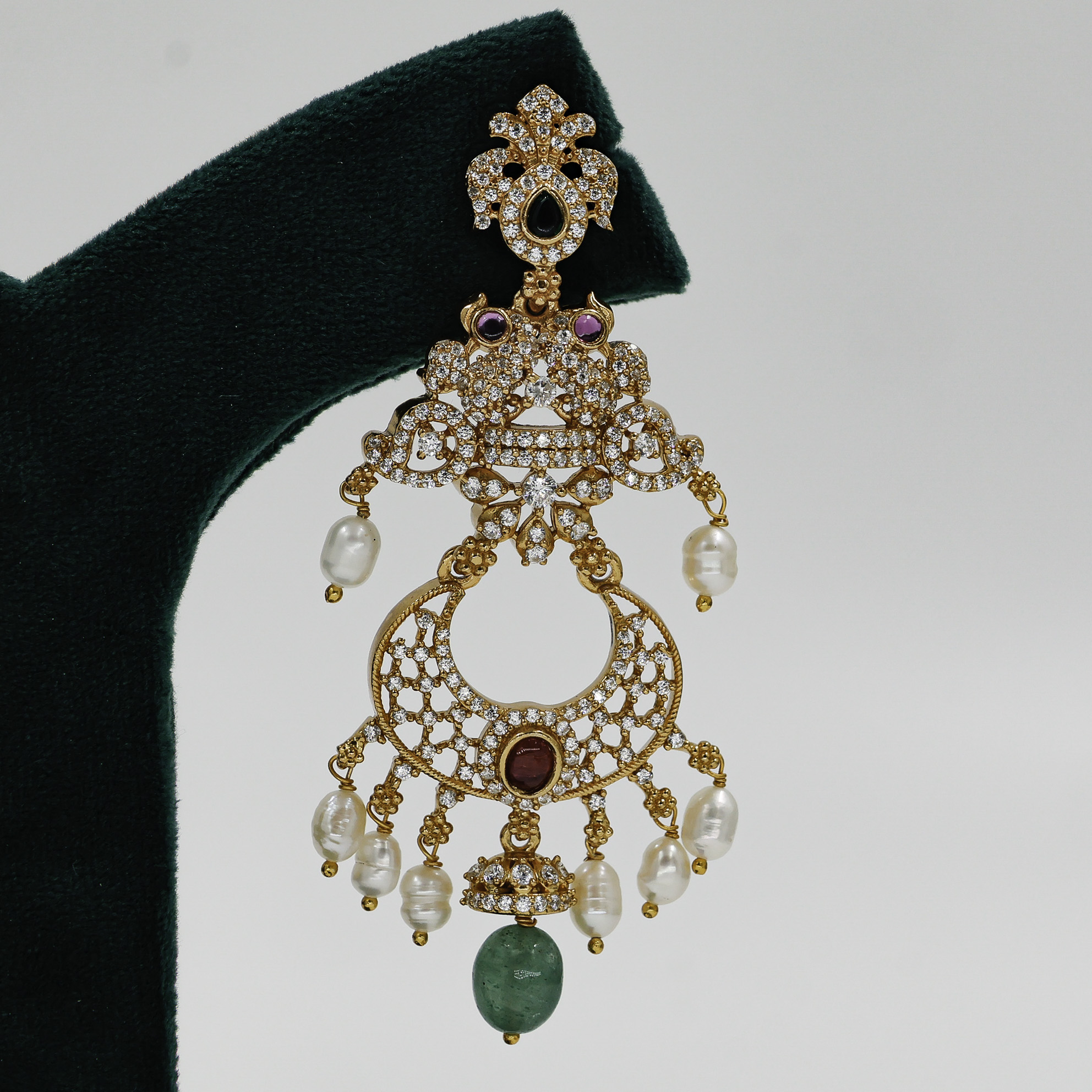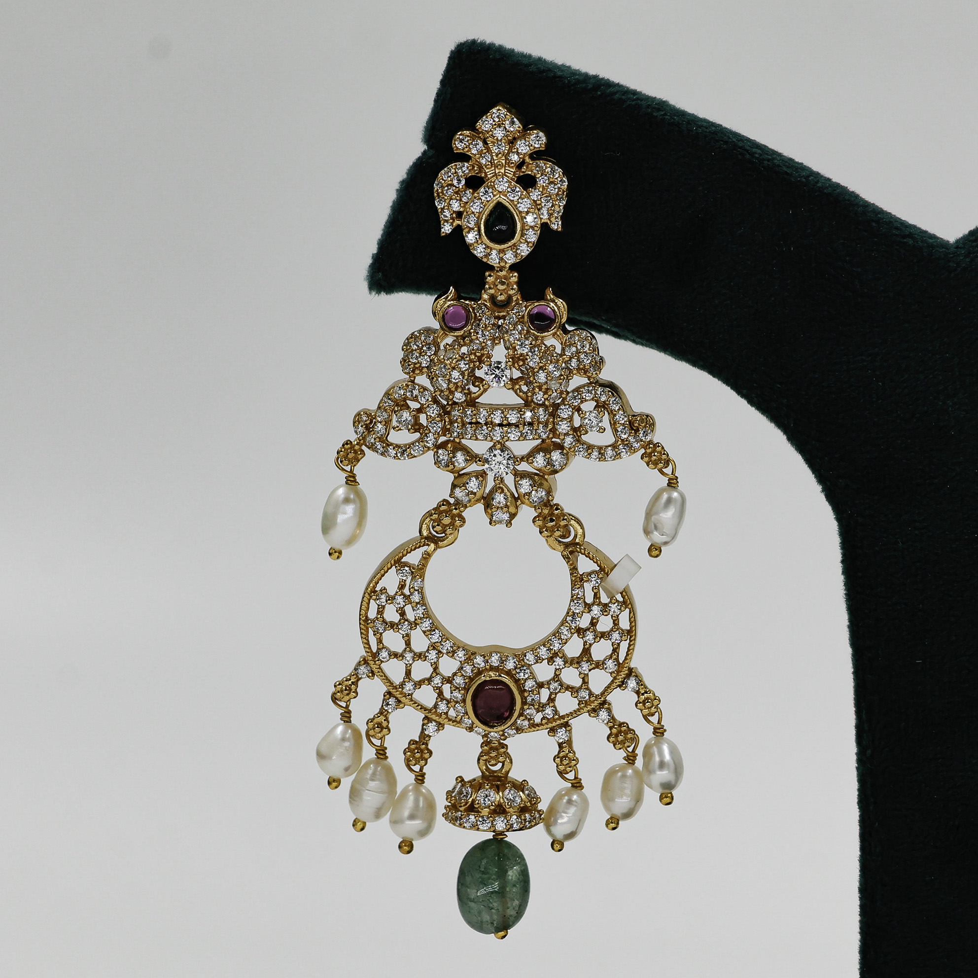 Intricate Gold Polished Silver dangle earrings with pearl and gemstone accents, perfect for weddings and festive occasions. Buy Gold Polished Silver Dangle Earrings from Raag Silver Jewellery in Hyderabad.