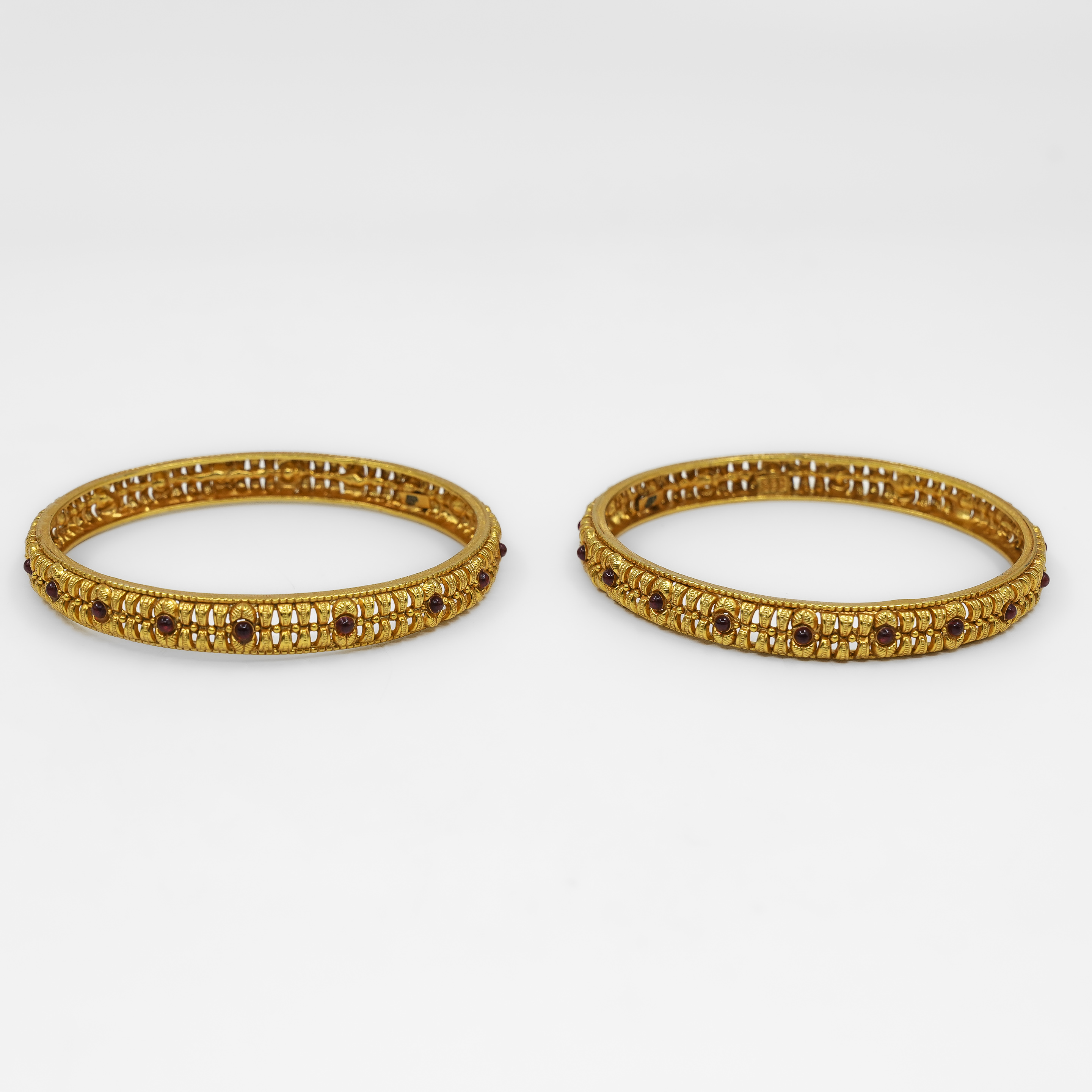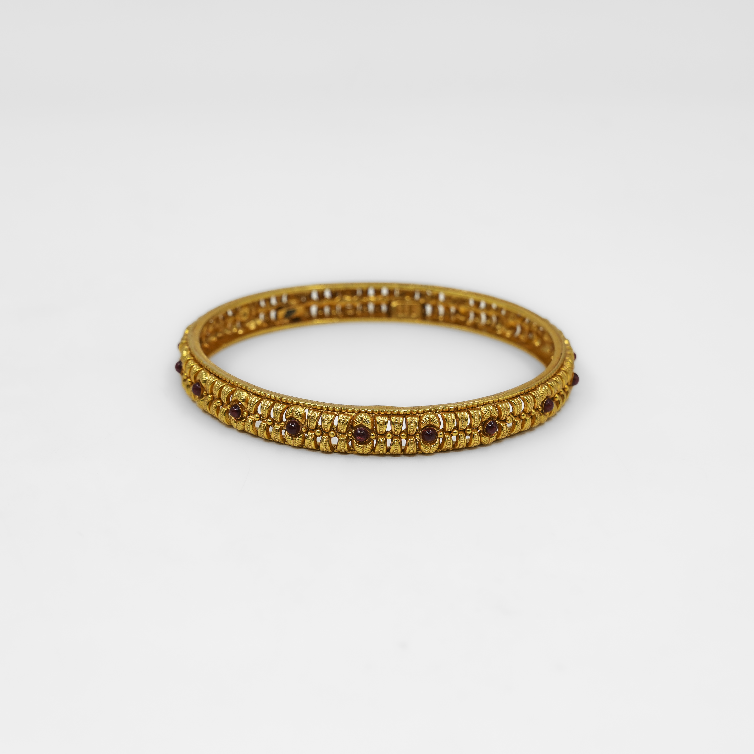 Intricate Gold Polished Silver floral bangle with green stone accents, perfect for traditional occasions. Buy Gold Polished Silver floral bangle from Raag Silver Jewellery in Hyderabad.