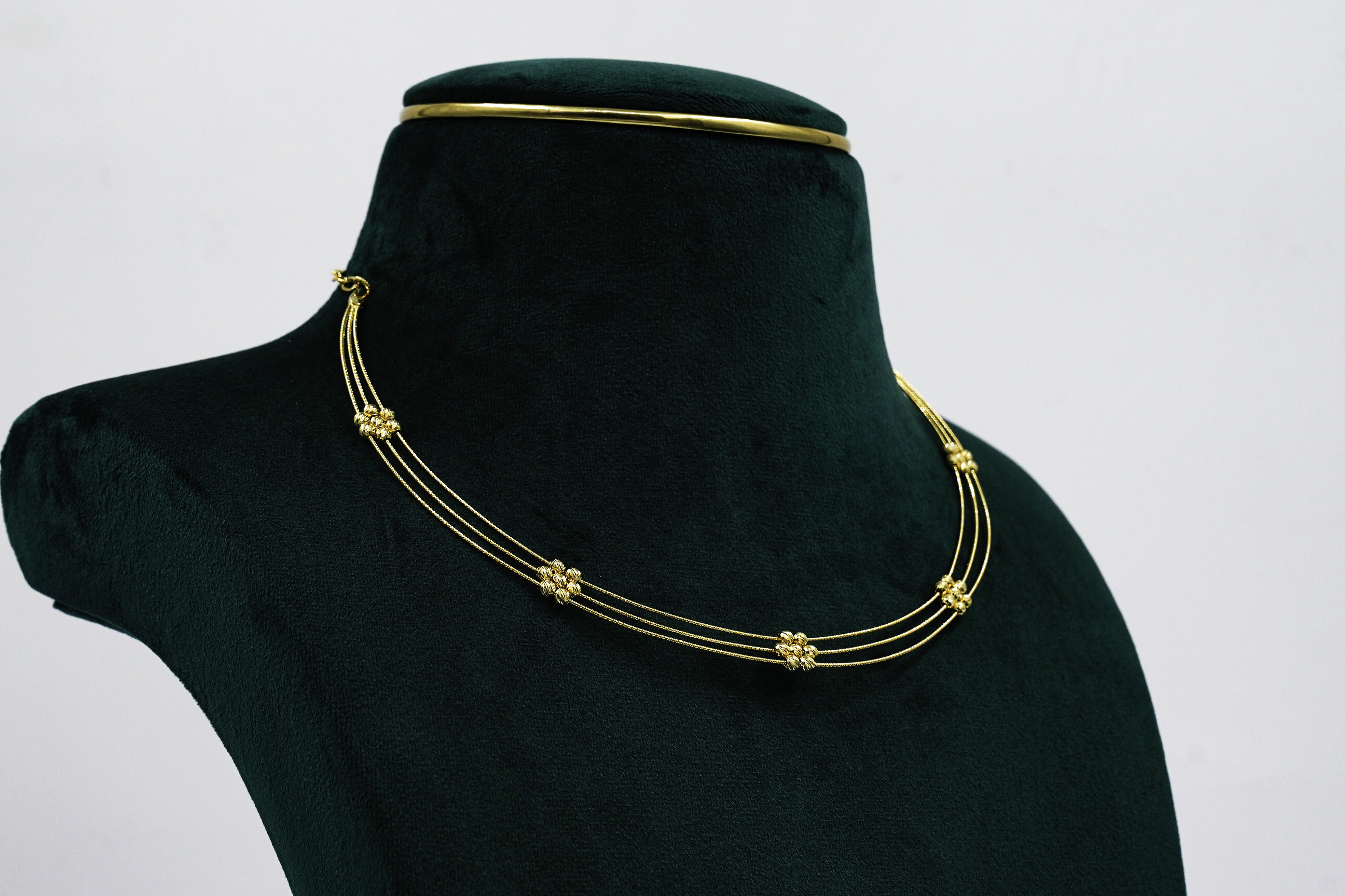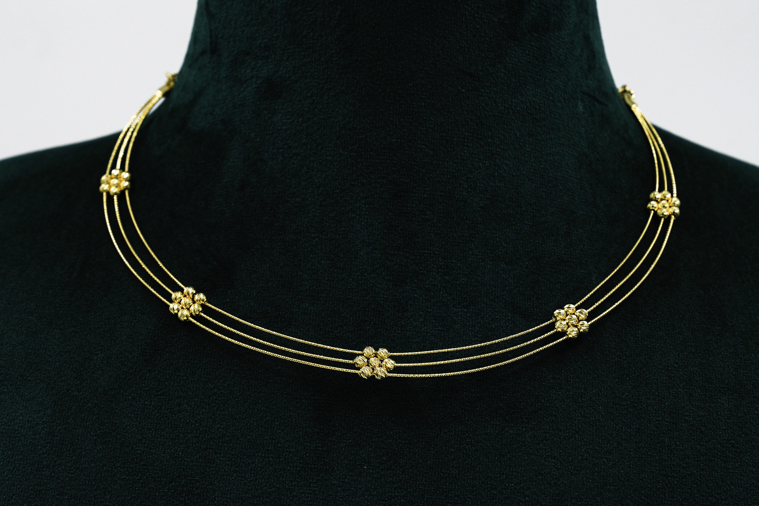 Elegant Gold Polished Silver floral necklace featuring a delicate triple-strand design, perfect for special occasions. Buy Gold Polished Silver floral necklace from Raag Silver Jewellery in Hyderabad.