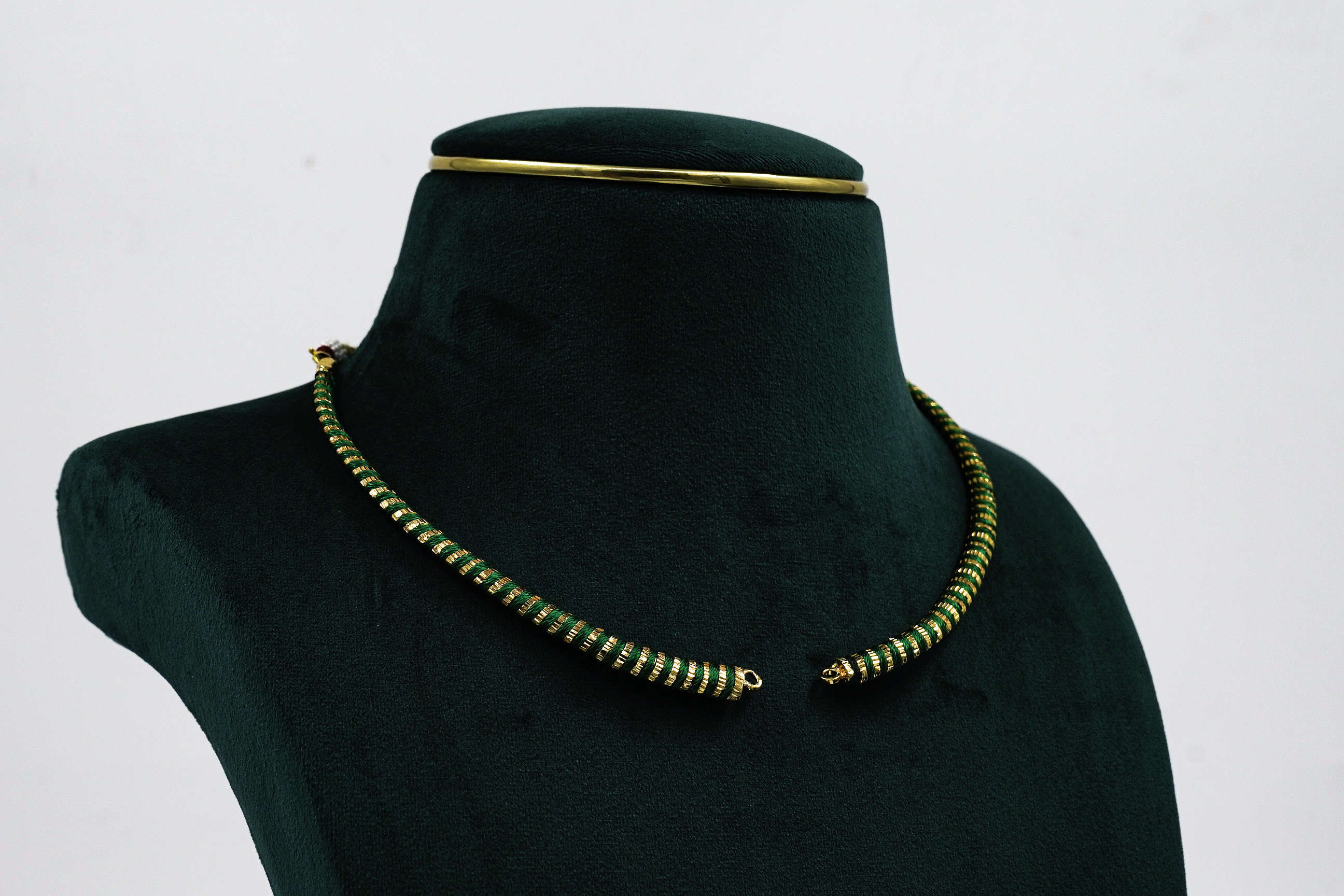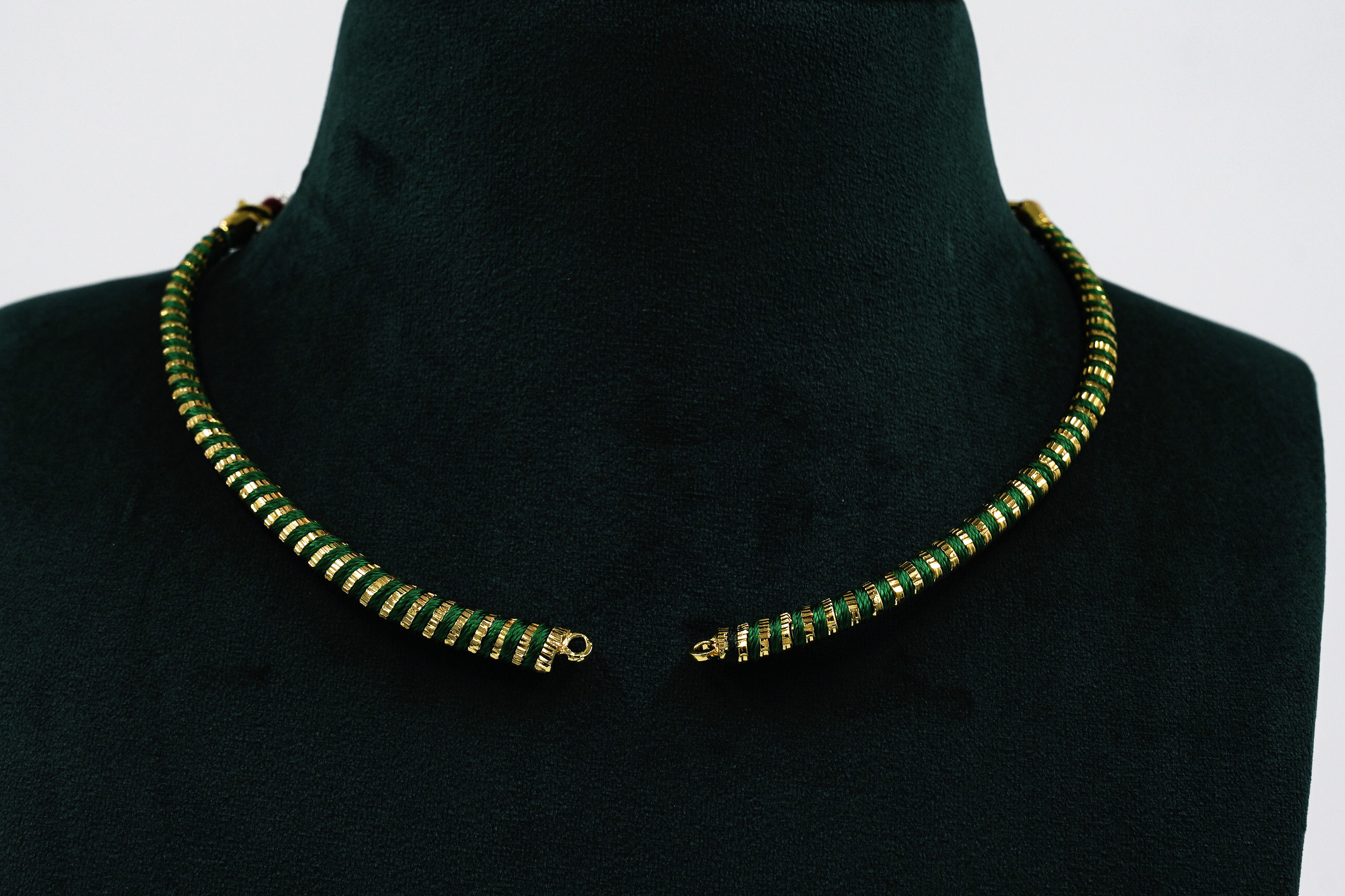 Elegant Gold Polished Silver necklace with green thread work, a classic design. Perfect for traditional occasions. Buy Gold Polished Silver Green Necklace from Raag Silver Jewellery in Hyderabad.