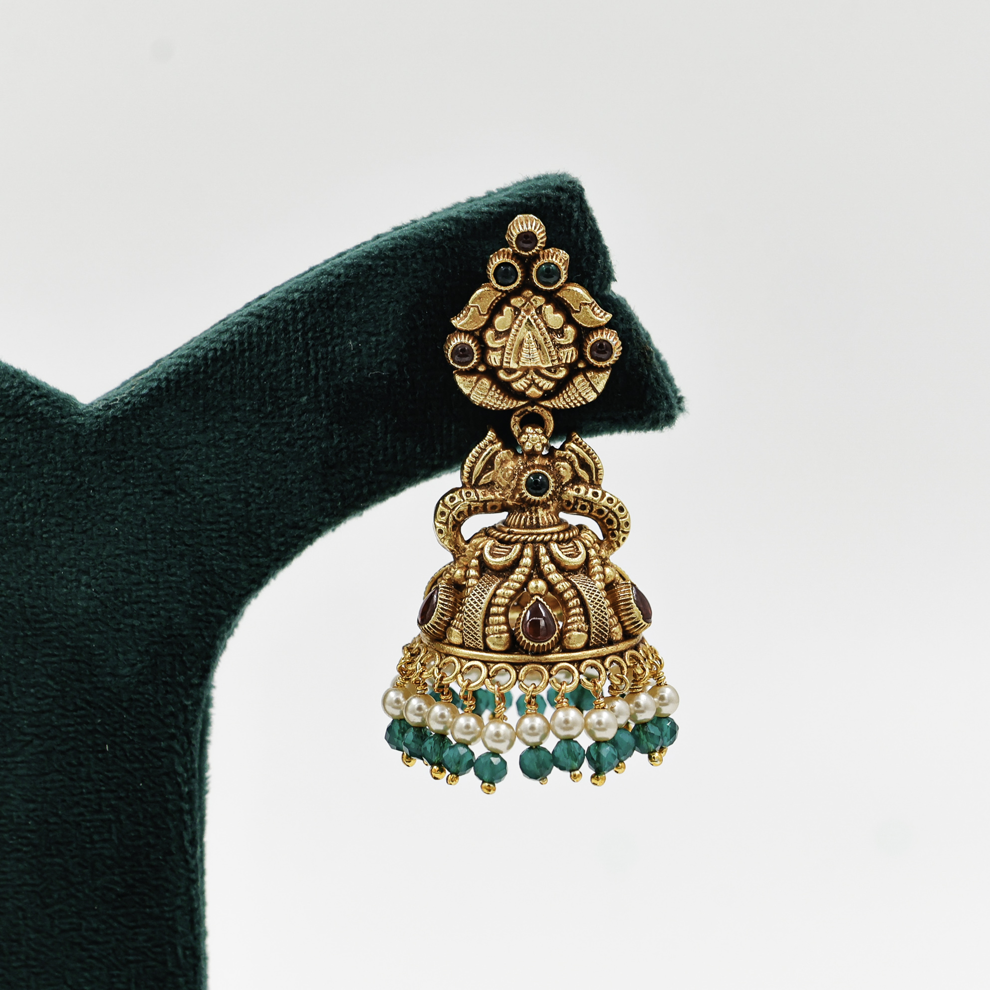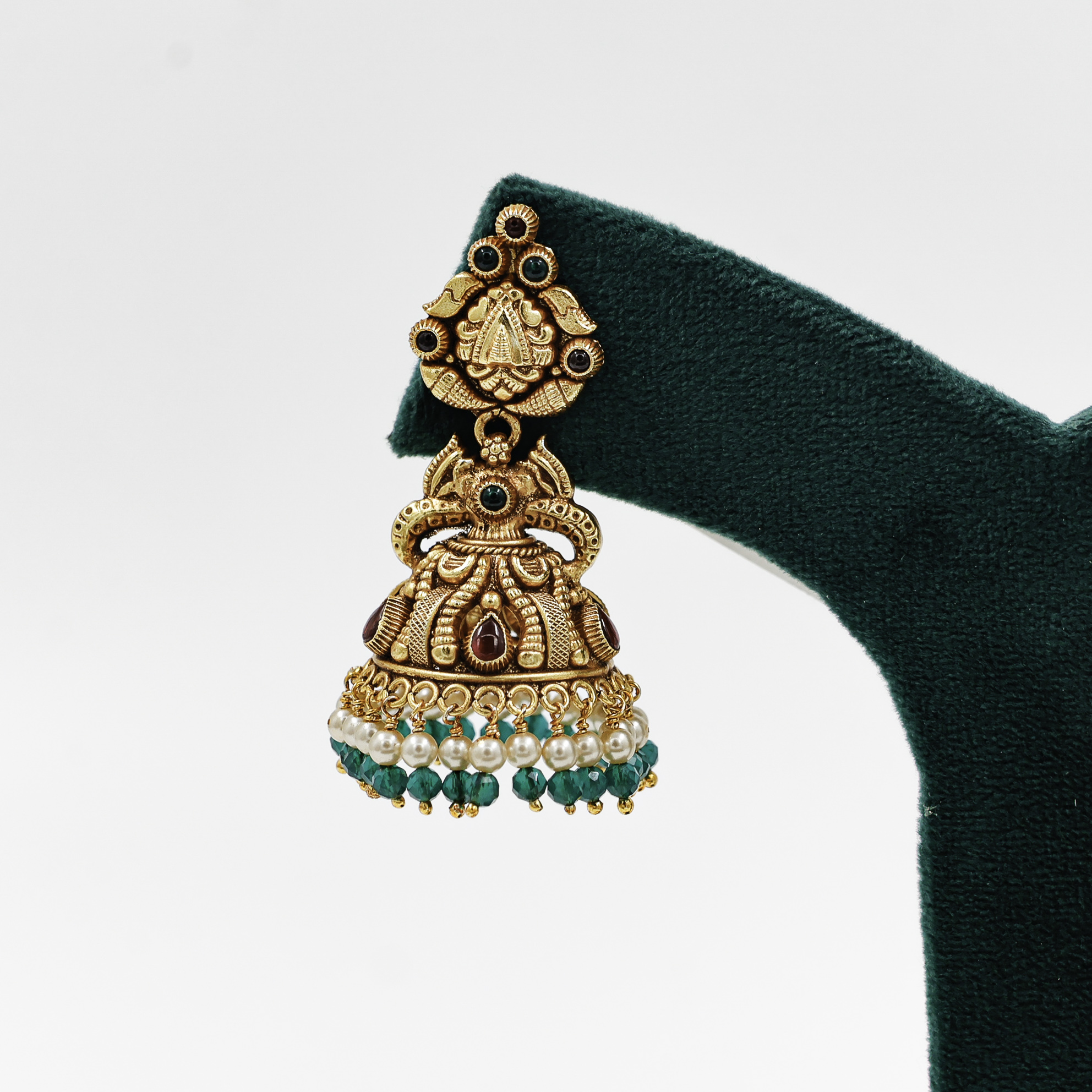 Traditional Gold Polished Silver jhumka earrings adorned with pearls and green beads, perfect for festive occasions. Buy Gold Polished Silver jhumka earrings from Raag Silver Jewellery in Hyderabad.
