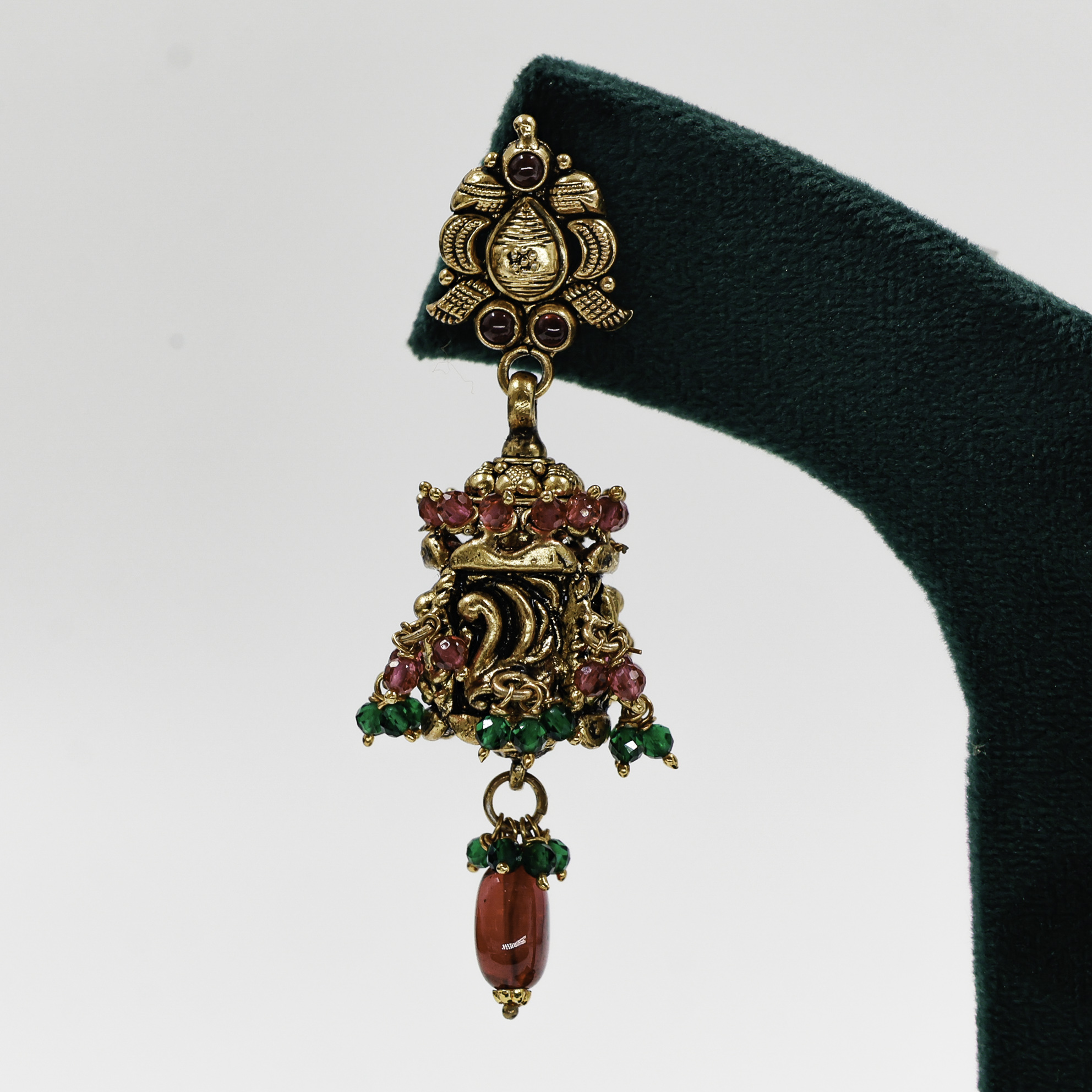 Antique Gold Polished Silver jhumka earrings with ruby and emerald accents, perfect for traditional wear. Buy Gold Polished Silver Jhumka Earrings from Raag Silver Jewellery in Hyderabad.