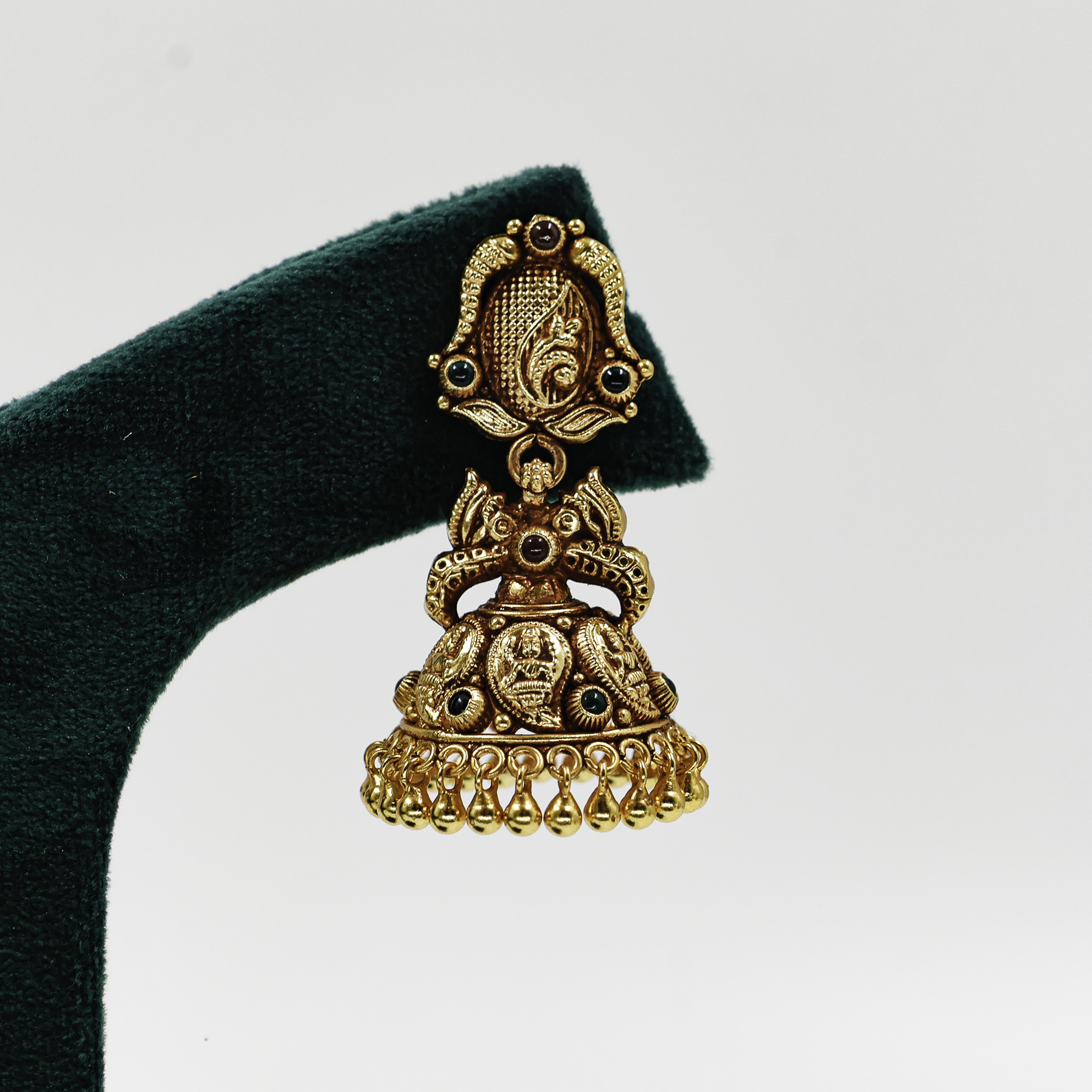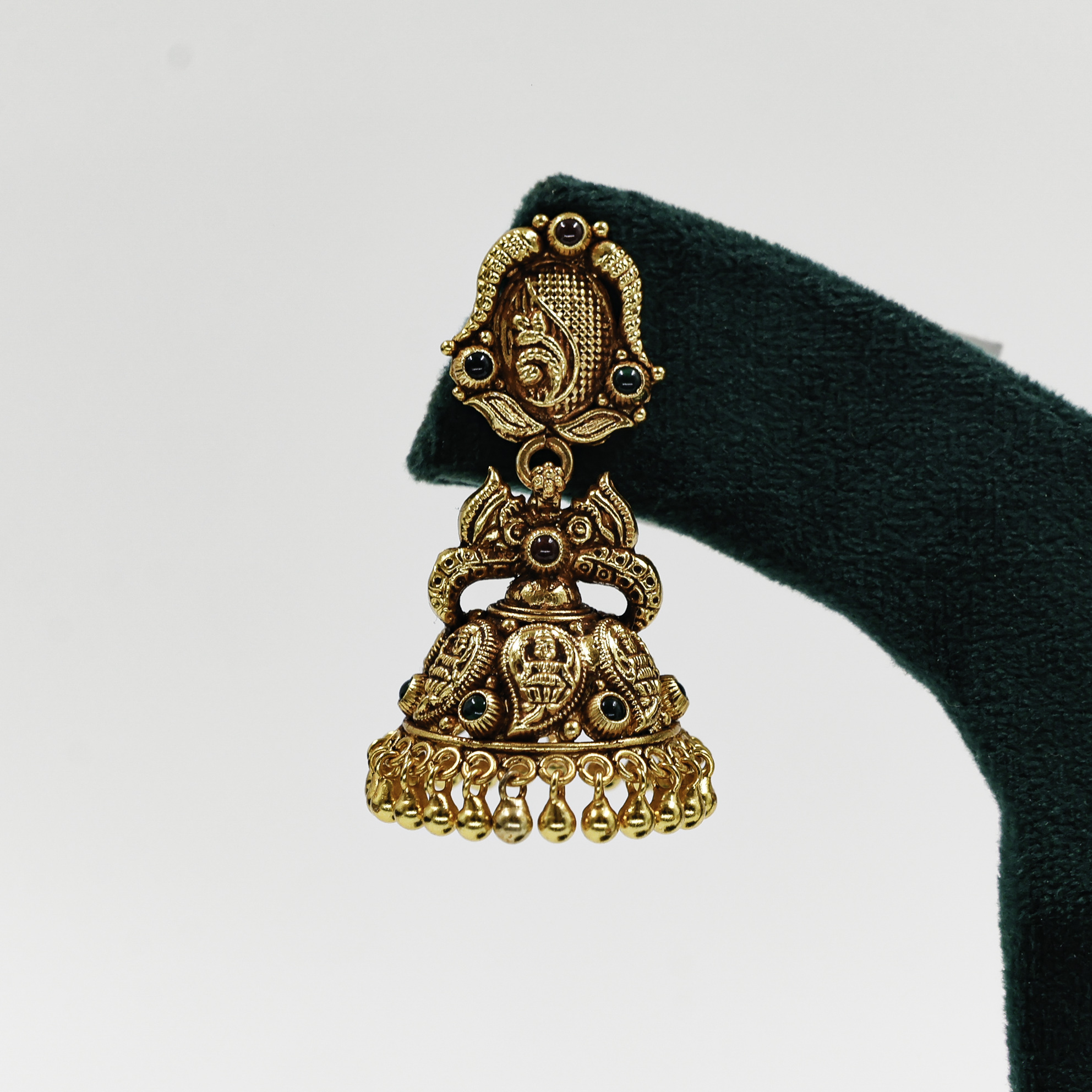 Ethnic Gold Polished Silver jhumka earrings with intricate detailing, perfect for traditional occasions. Buy Gold Polished Silver Jhumka Earrings from Raag Silver Jewellery in Hyderabad.