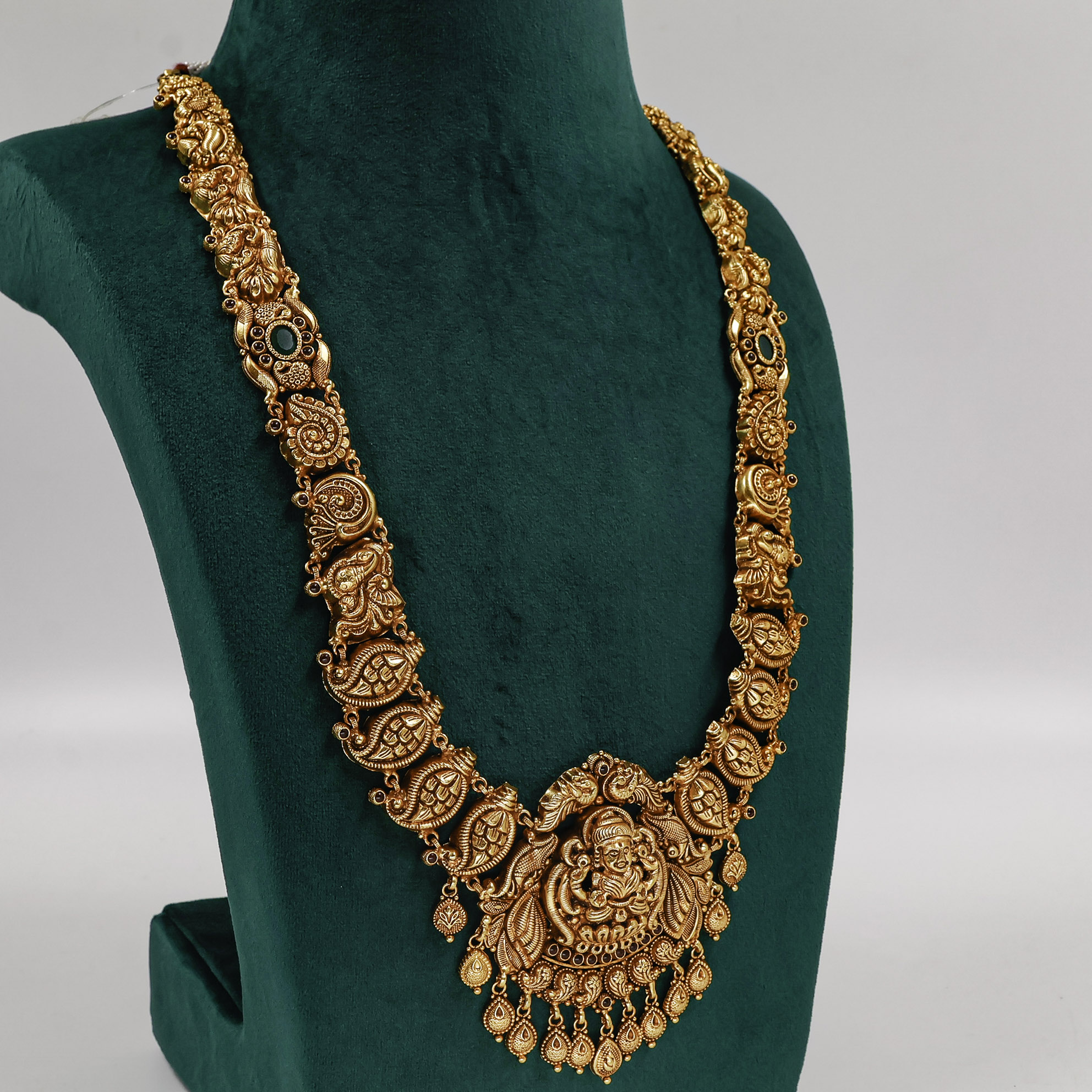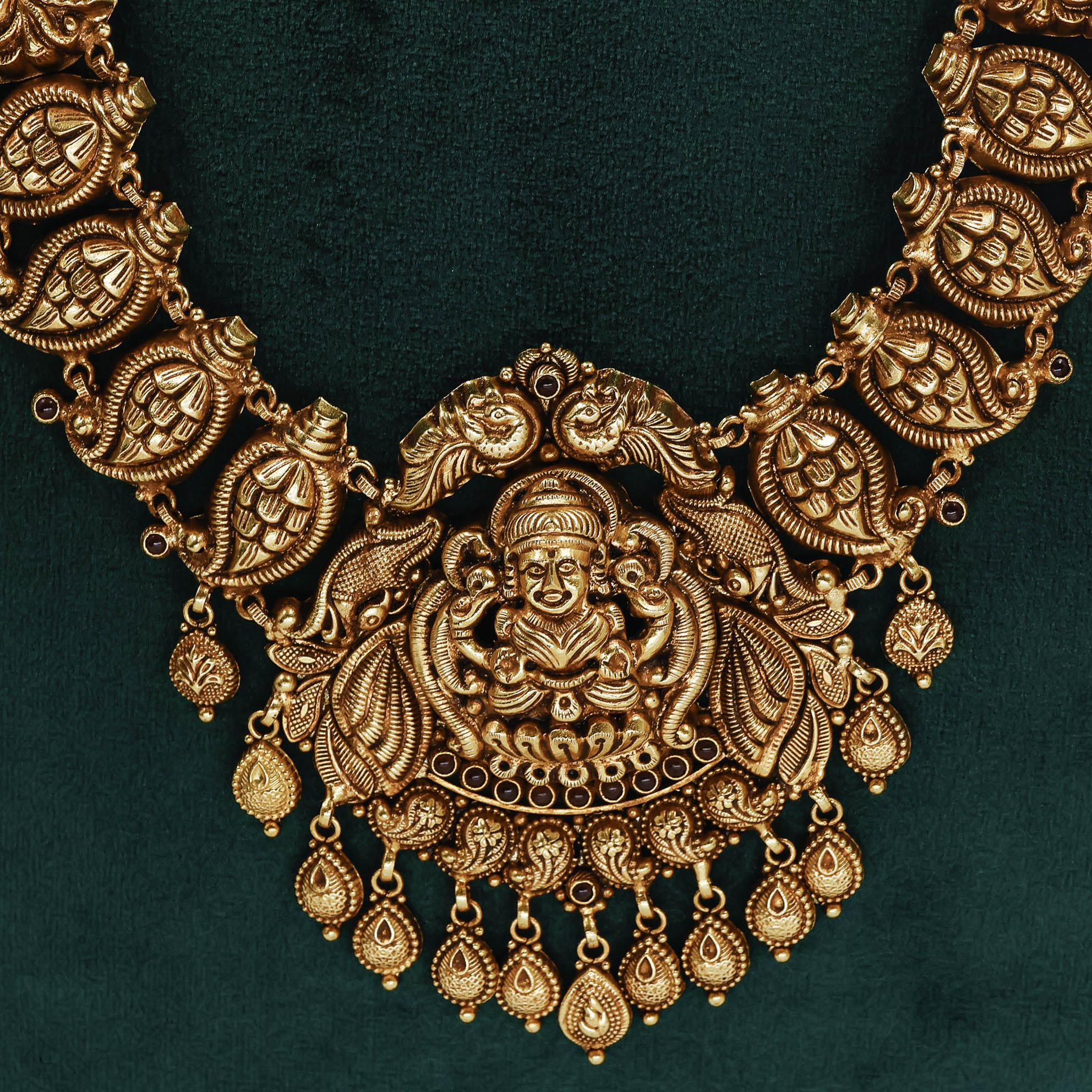 Traditional Lakshmi design Gold Polished Silver necklace, perfect for weddings and festive occasions. Buy Gold Polished Silver Lakshmi necklace from Raag Silver Jewellery in Hyderabad.