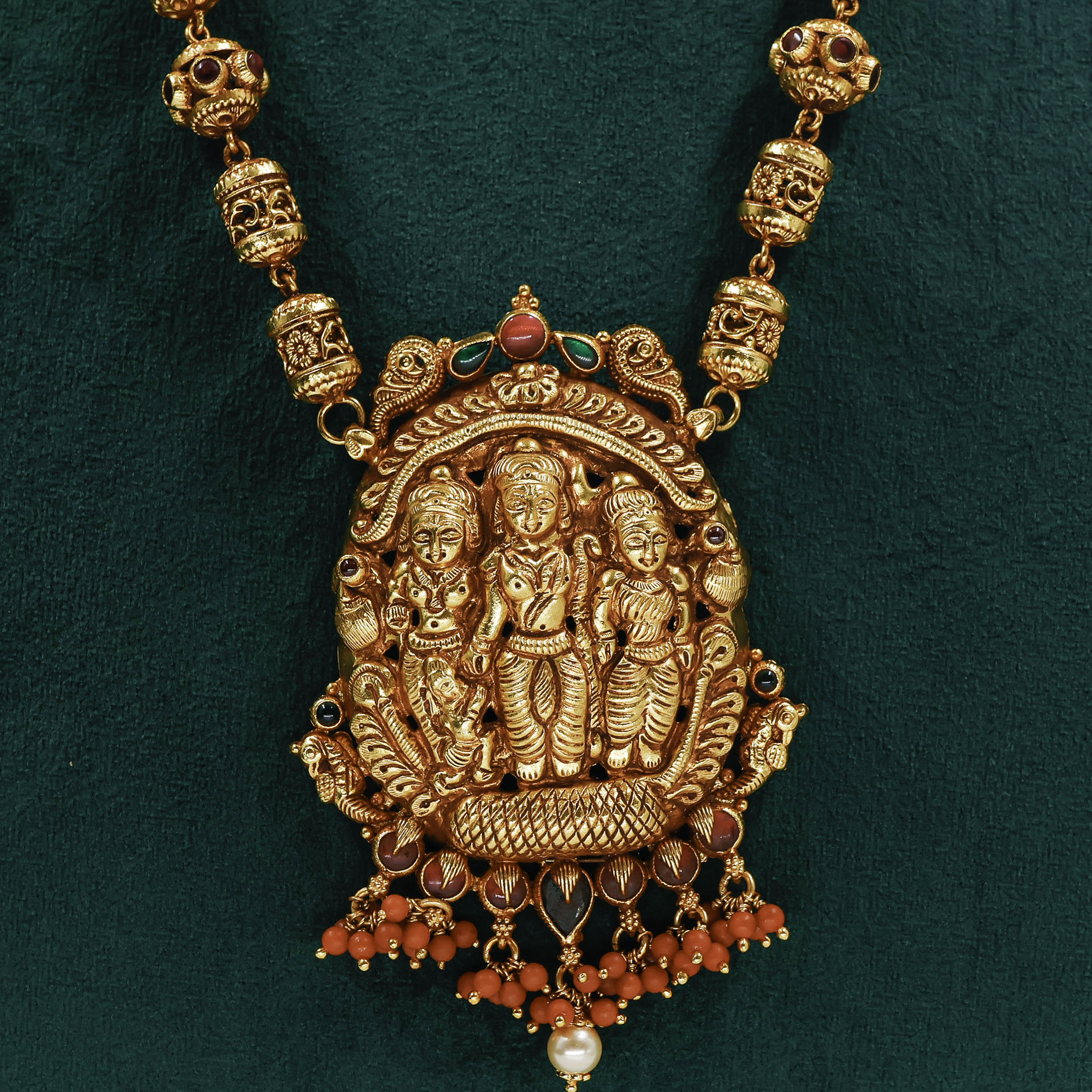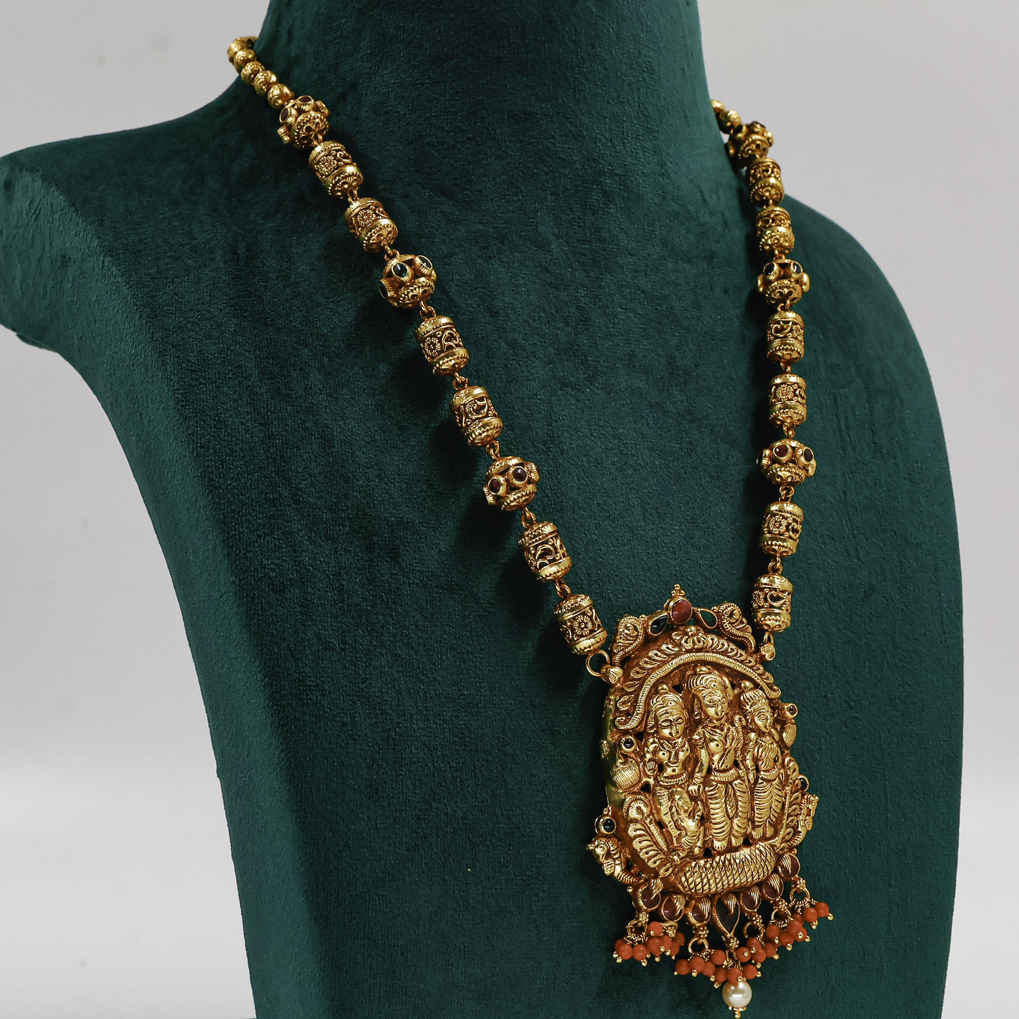 Antique Gold Polished Silver Lakshmi necklace, a divine adornment exuding traditional charm. Buy Gold Polished Silver Lakshmi Necklace from Raag Silver Jewellery in Hyderabad.