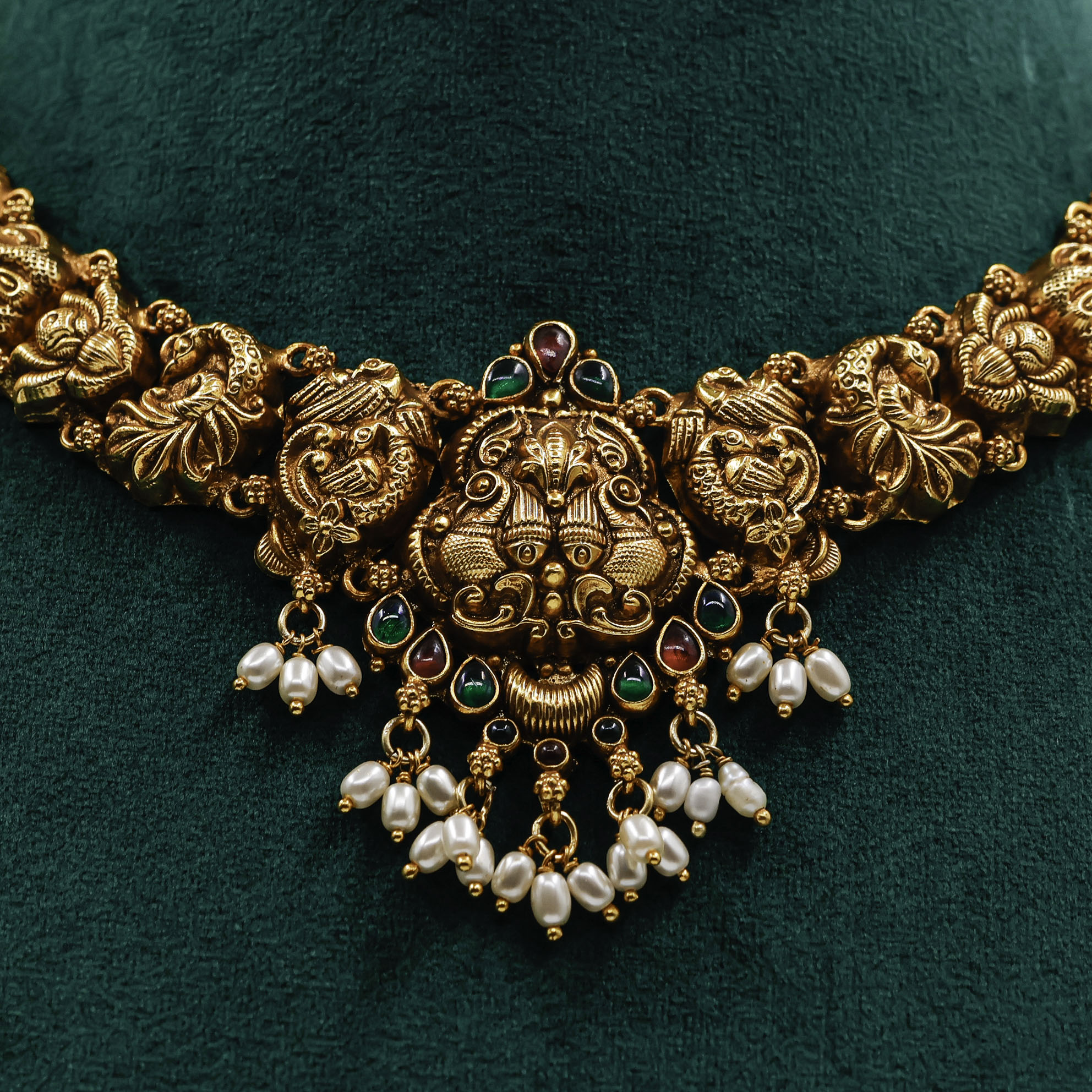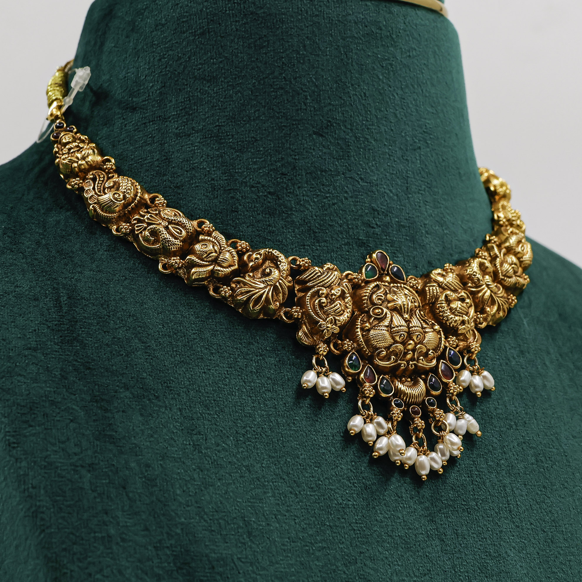 Elegant Gold Polished Silver Lakshmi necklace, a divine statement piece perfect for traditional occasions. Buy Gold Polished Silver Lakshmi Necklace from Raag Silver Jewellery in Hyderabad.