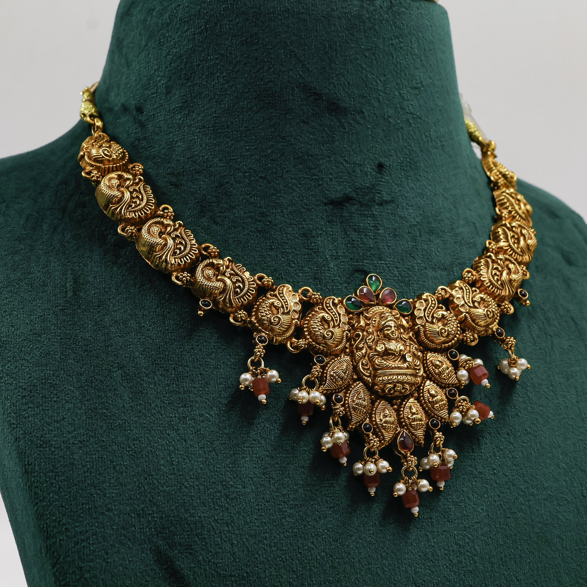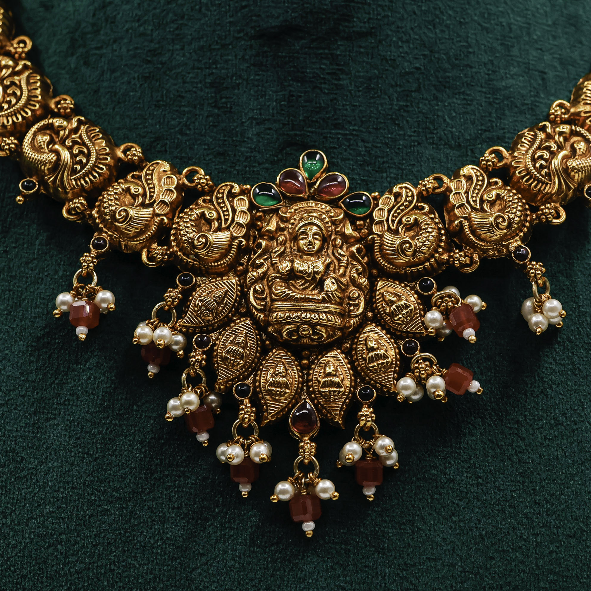 Traditional Gold Polished Silver Lakshmi necklace featuring intricate detailing, perfect for weddings and festive occasions. Buy Gold Polished Silver Lakshmi Necklace from Raag Silver Jewellery in Hyderabad.