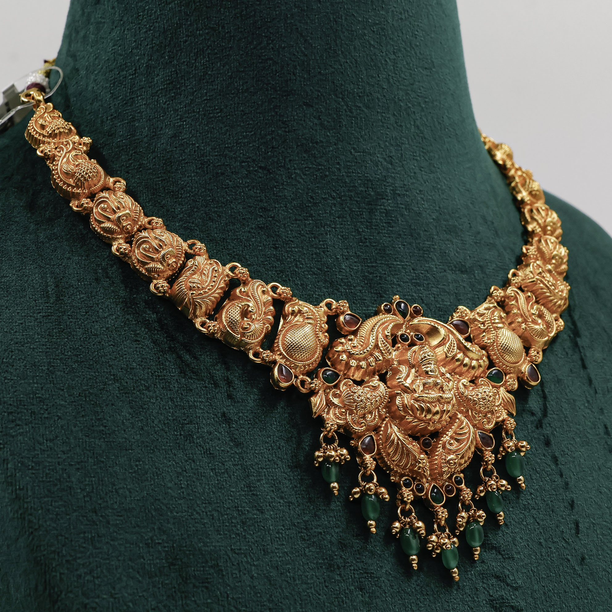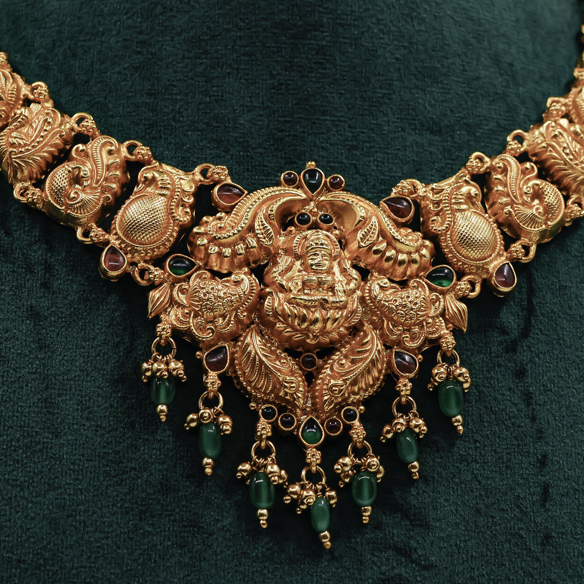 Elegant Gold Polished Silver Lakshmi necklace with intricate details, perfect for traditional occasions. Buy Gold Polished Silver Lakshmi Necklace from Raag Silver Jewellery in Hyderabad.