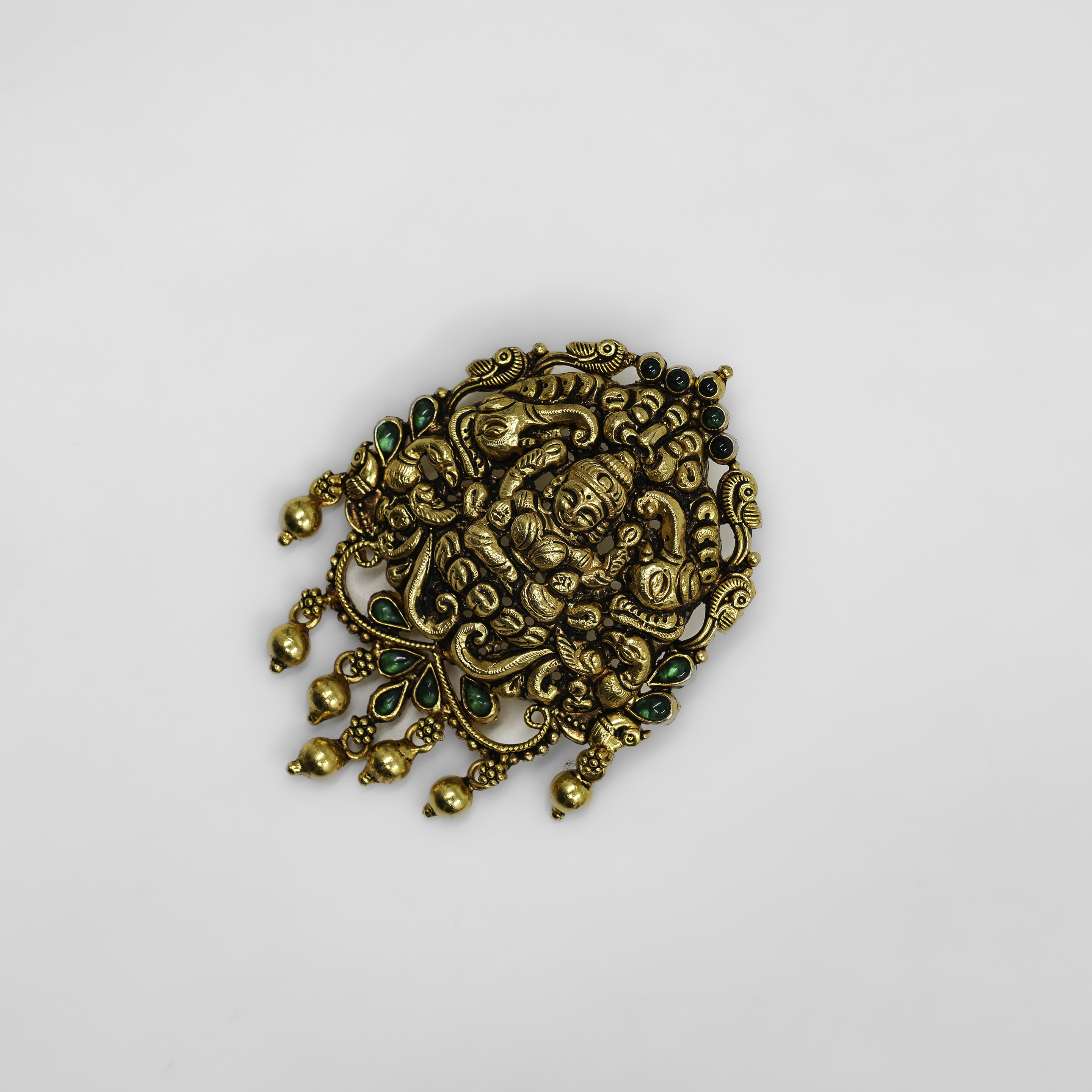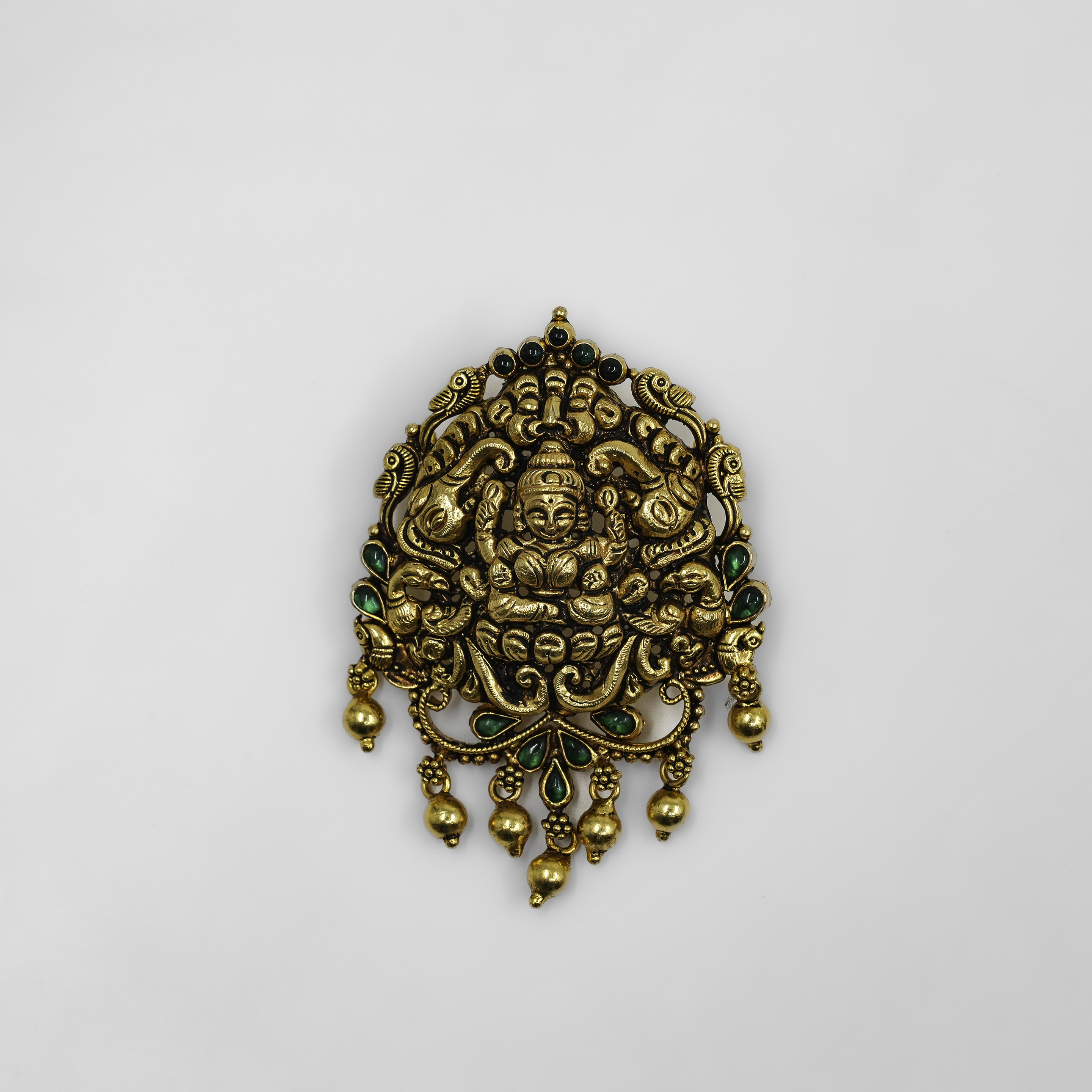 Intricate Gold Polished Silver Lakshmi pendant featuring goddess Lakshmi, perfect for religious occasions. Buy Gold Polished Silver Lakshmi Pendant from Raag Silver Jewellery in Hyderabad.