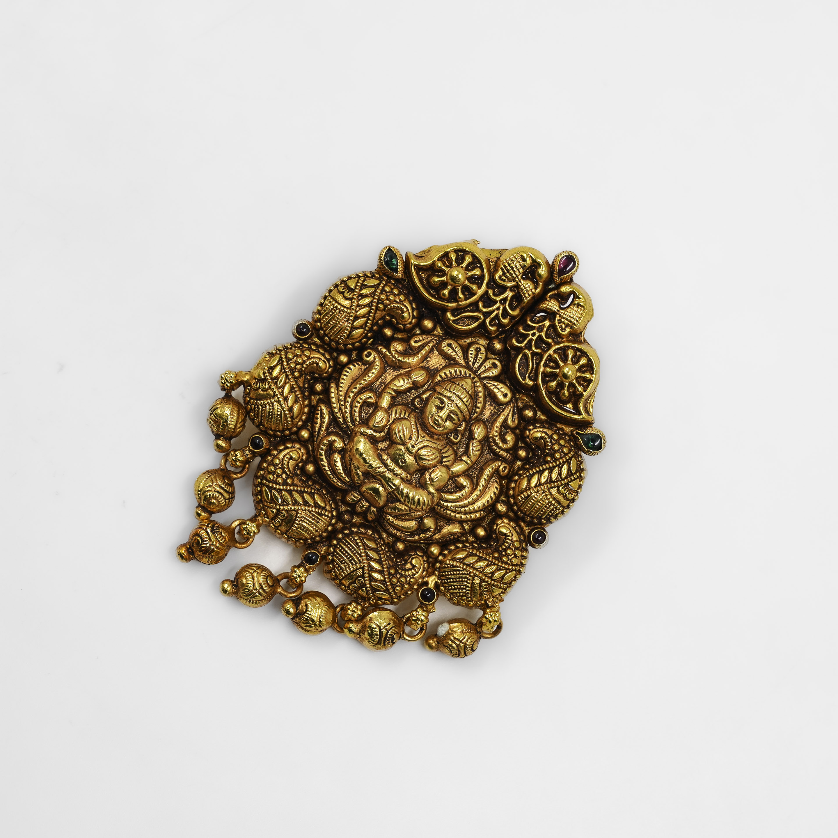 Intricate Gold Polished Silver Lakshmi Pendant featuring divine carvings and ruby-pearl hangings. Buy Gold Polished Silver Lakshmi Pendant from Raag Silver Jewellery in Hyderabad.