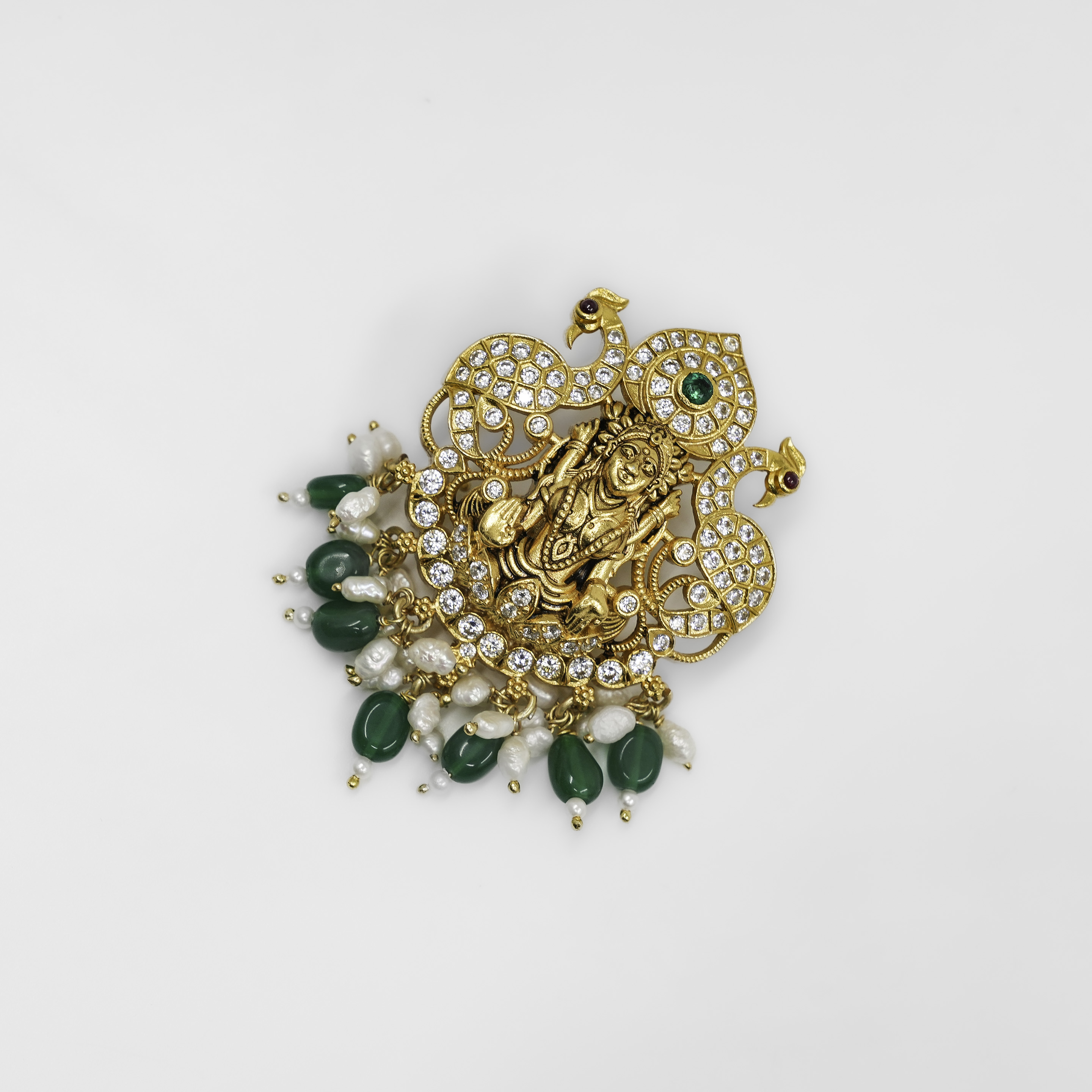 Intricate Gold Polished Silver Lakshmi pendant adorned with gems, perfect for religious occasions. Buy Gold Polished Silver Lakshmi Pendant from Raag Silver Jewellery in Hyderabad.
