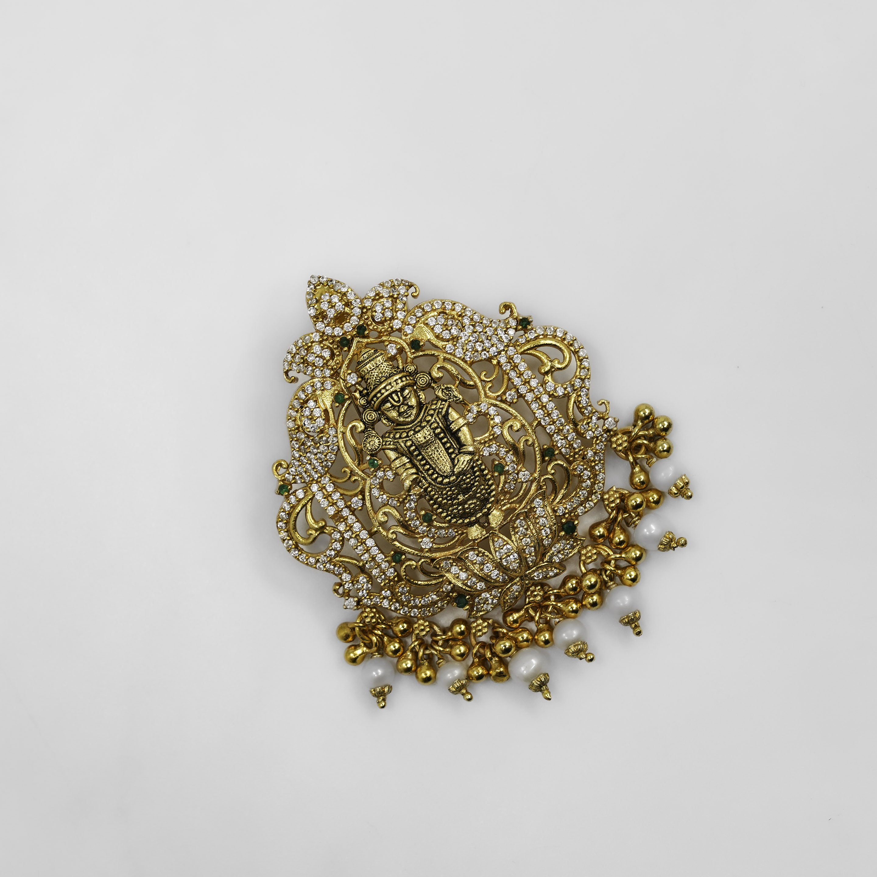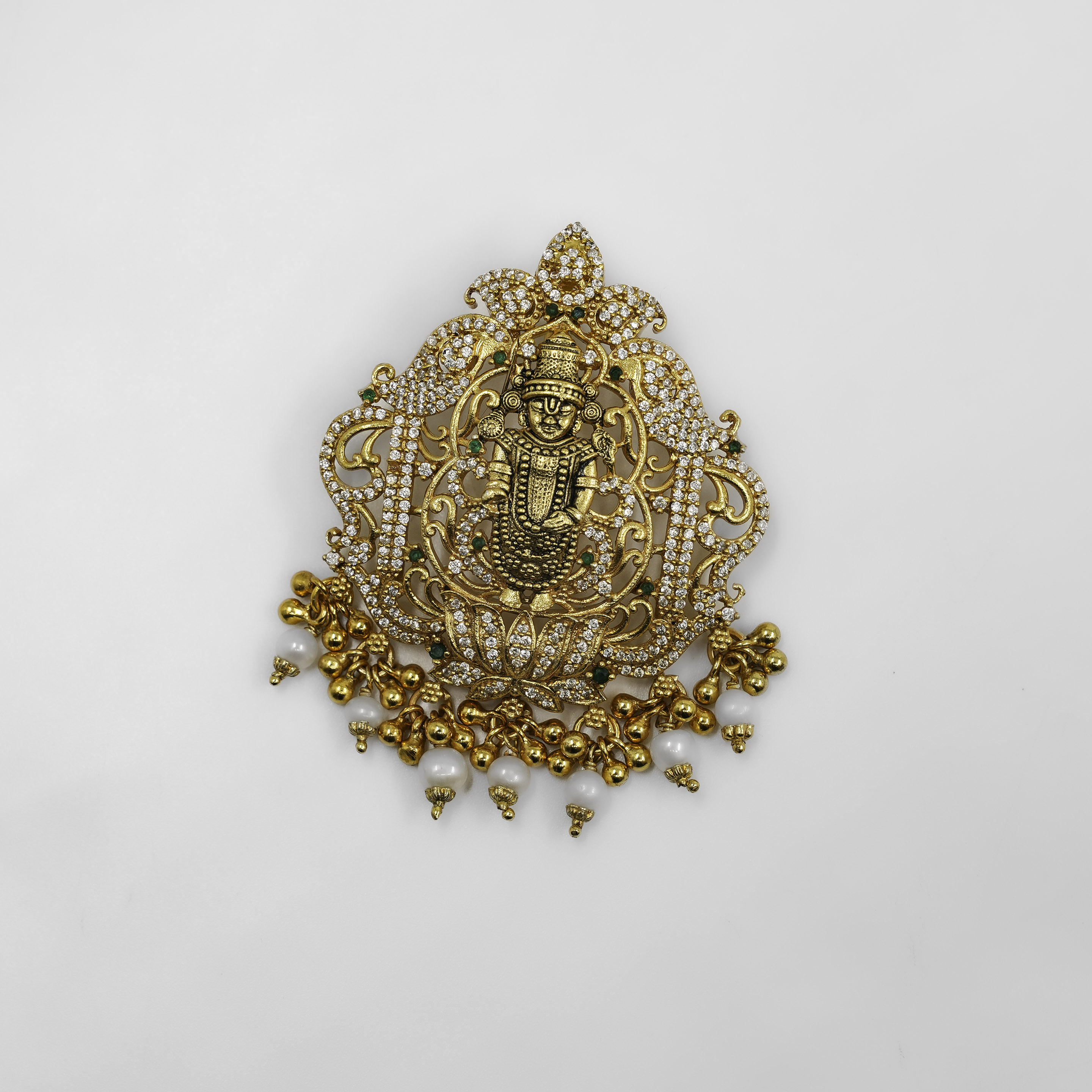 Ornate Gold Polished Silver Laxmi pendant featuring intricate detailing, symbolizing wealth and prosperity. Buy Gold Polished Silver Laxmi Pendant from Raag Silver Jewellery in Hyderabad.
