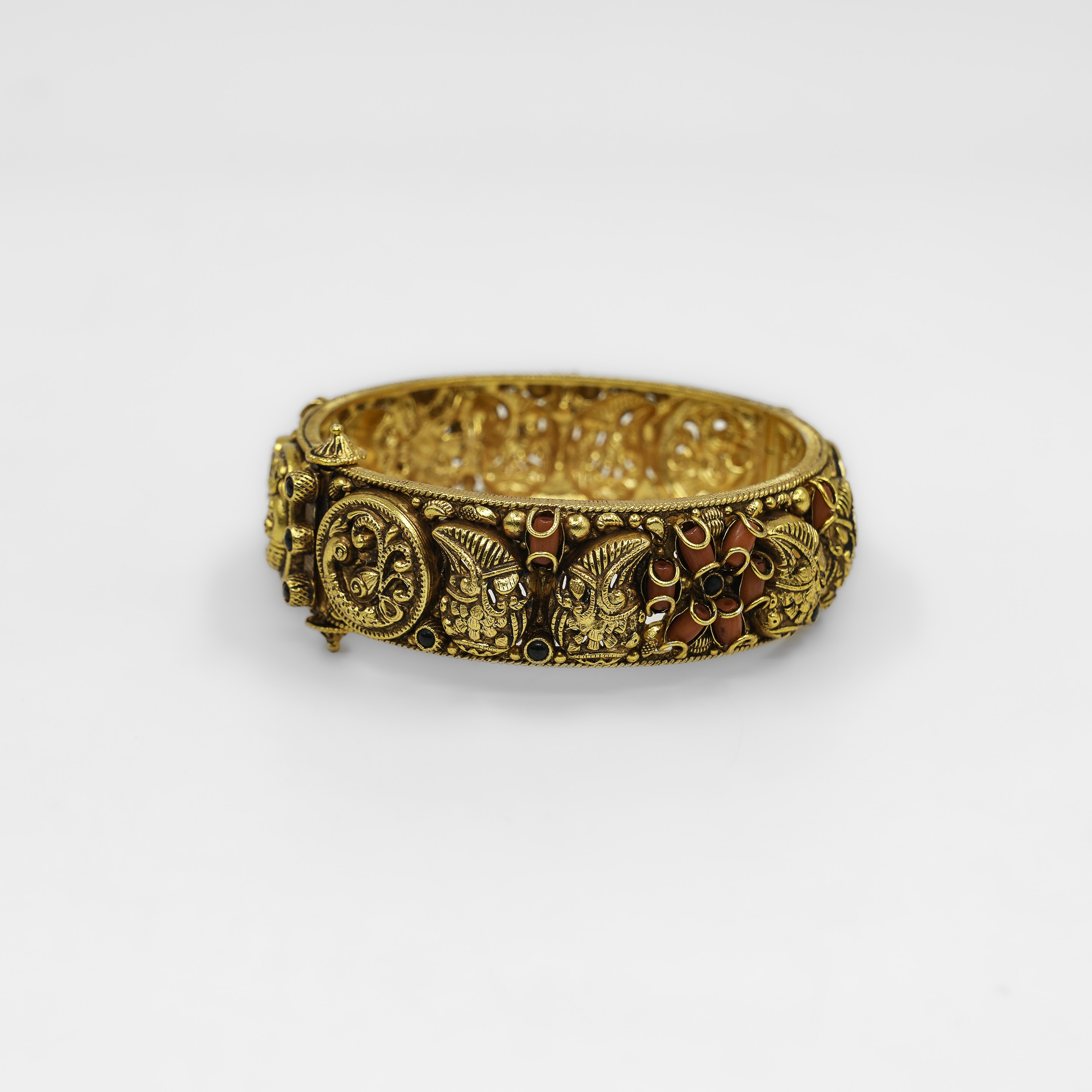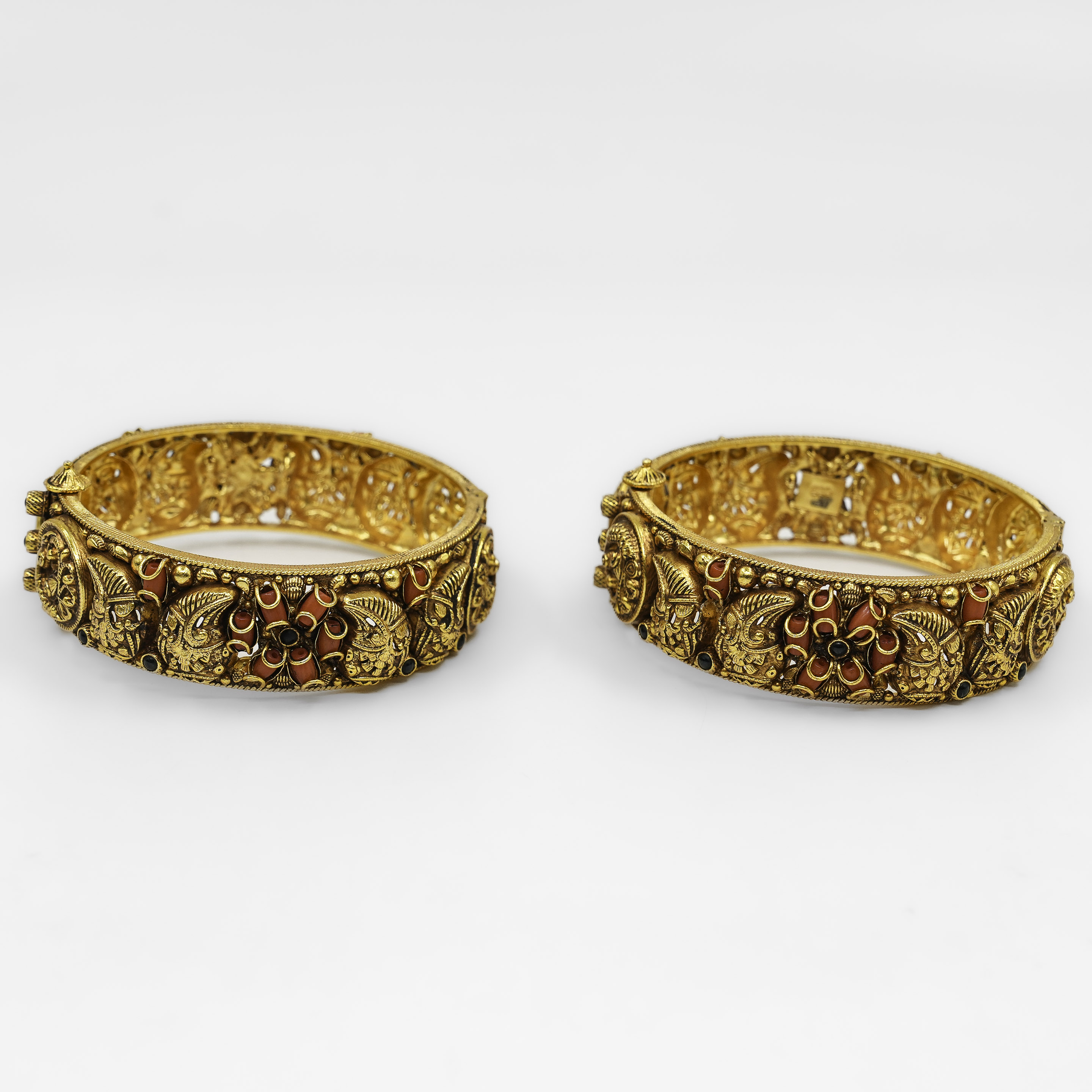 Ornate Gold Polished Silver bangles featuring intricate lion motifs, a bold statement for traditional wear. Buy Gold Polished Silver Lion Bangles from Raag Silver Jewellery in Hyderabad.
