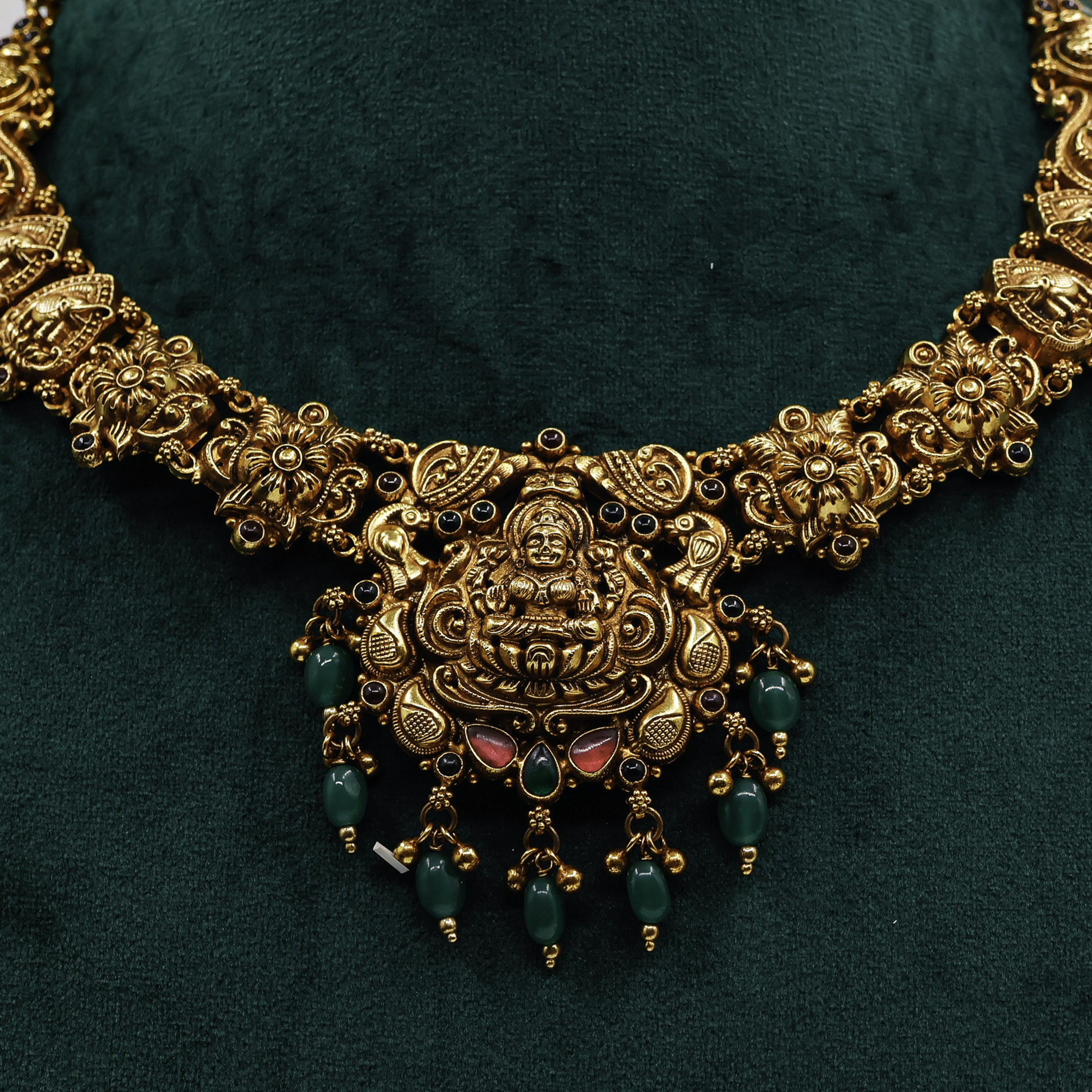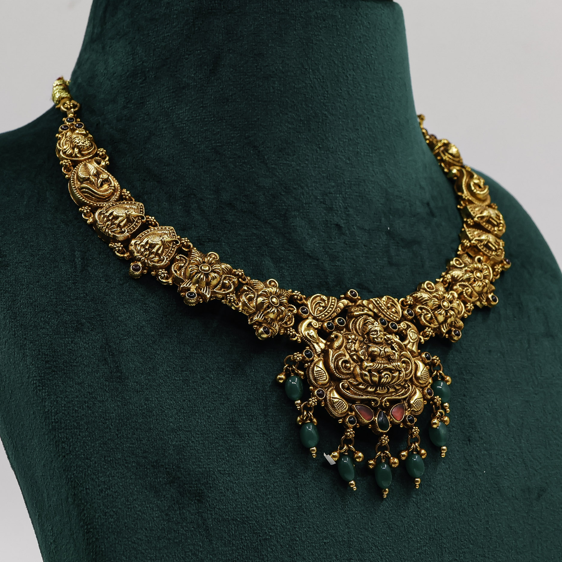 Elegant Gold Polished Silver temple necklace with intricate detailing, perfect for weddings and festive occasions. Buy Gold Polished Silver Necklace from Raag Silver Jewellery in Hyderabad.
