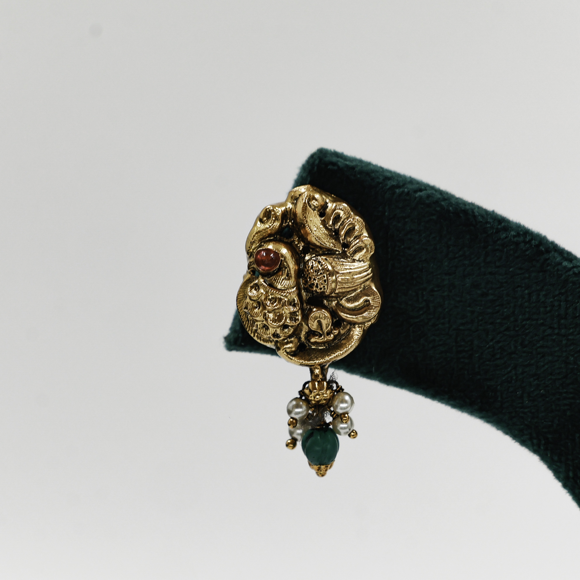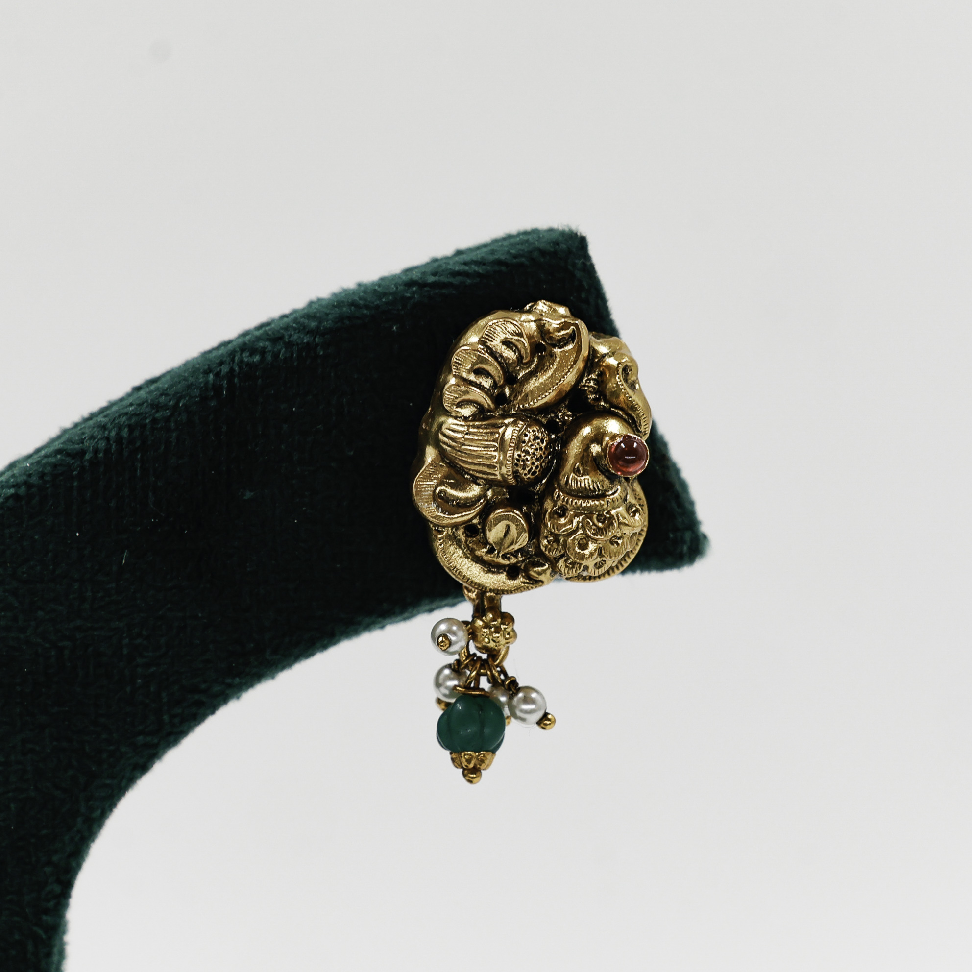 Antique Gold Polished Silver peacock earrings with intricate detailing, perfect for traditional occasions. Buy Gold Polished Silver peacock earrings from Raag Silver Jewellery in Hyderabad.
