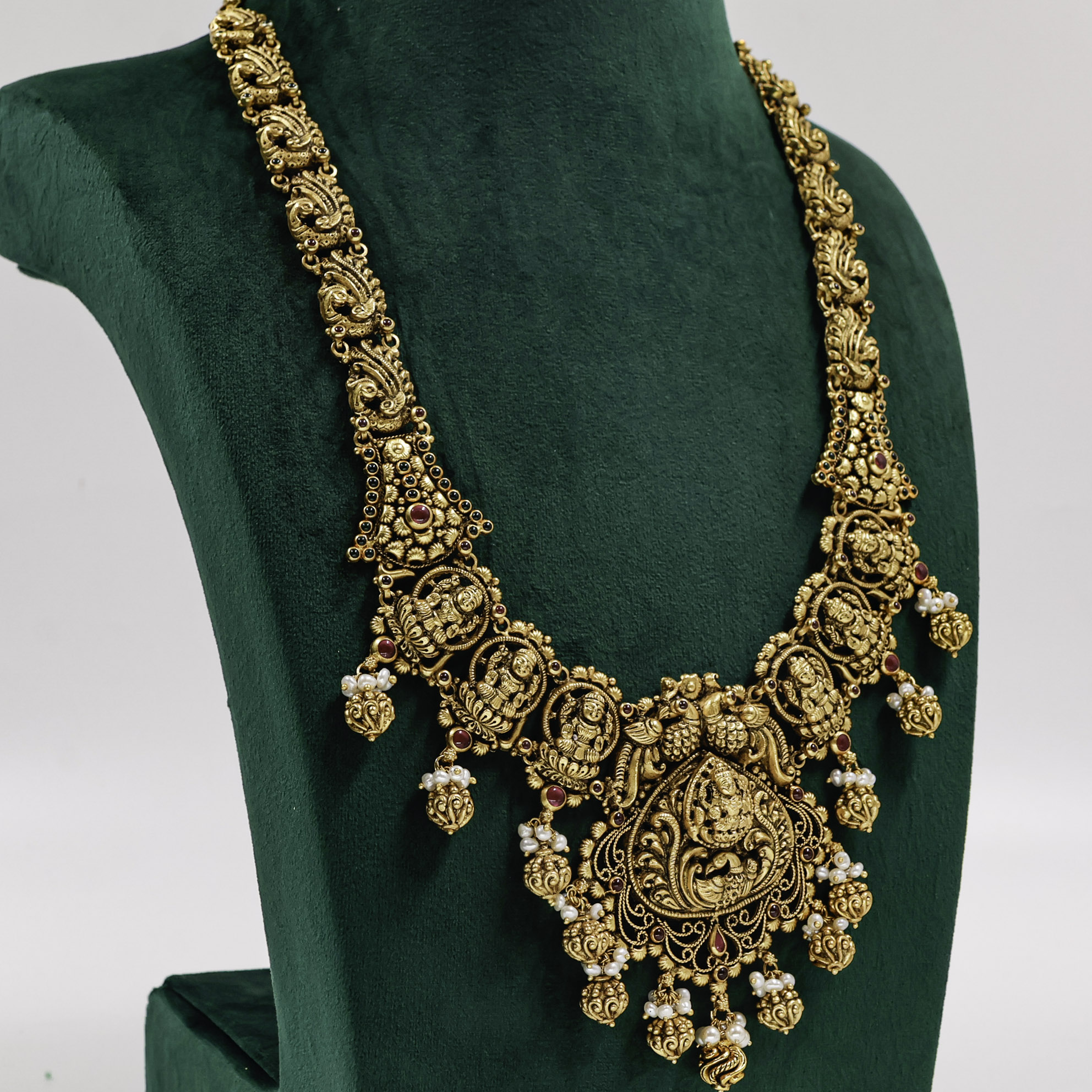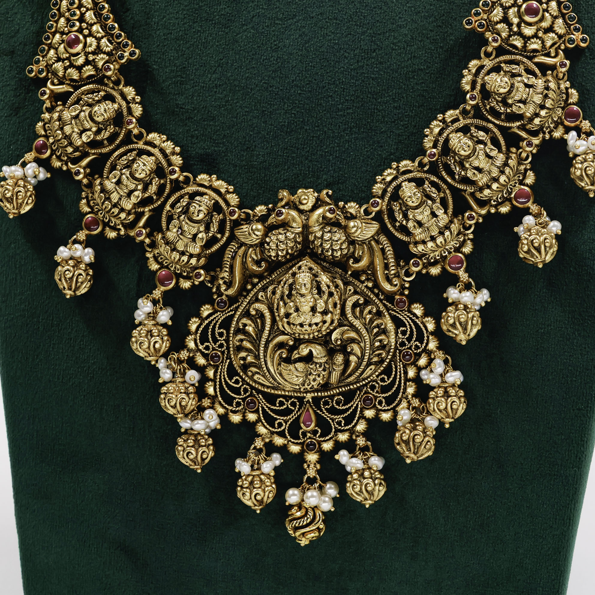 Elegant Gold Polished Silver peacock necklace with intricate detailing, a perfect statement piece for traditional occasions. Buy Gold Polished Silver peacock necklace from Raag Silver Jewellery in Hyderabad.