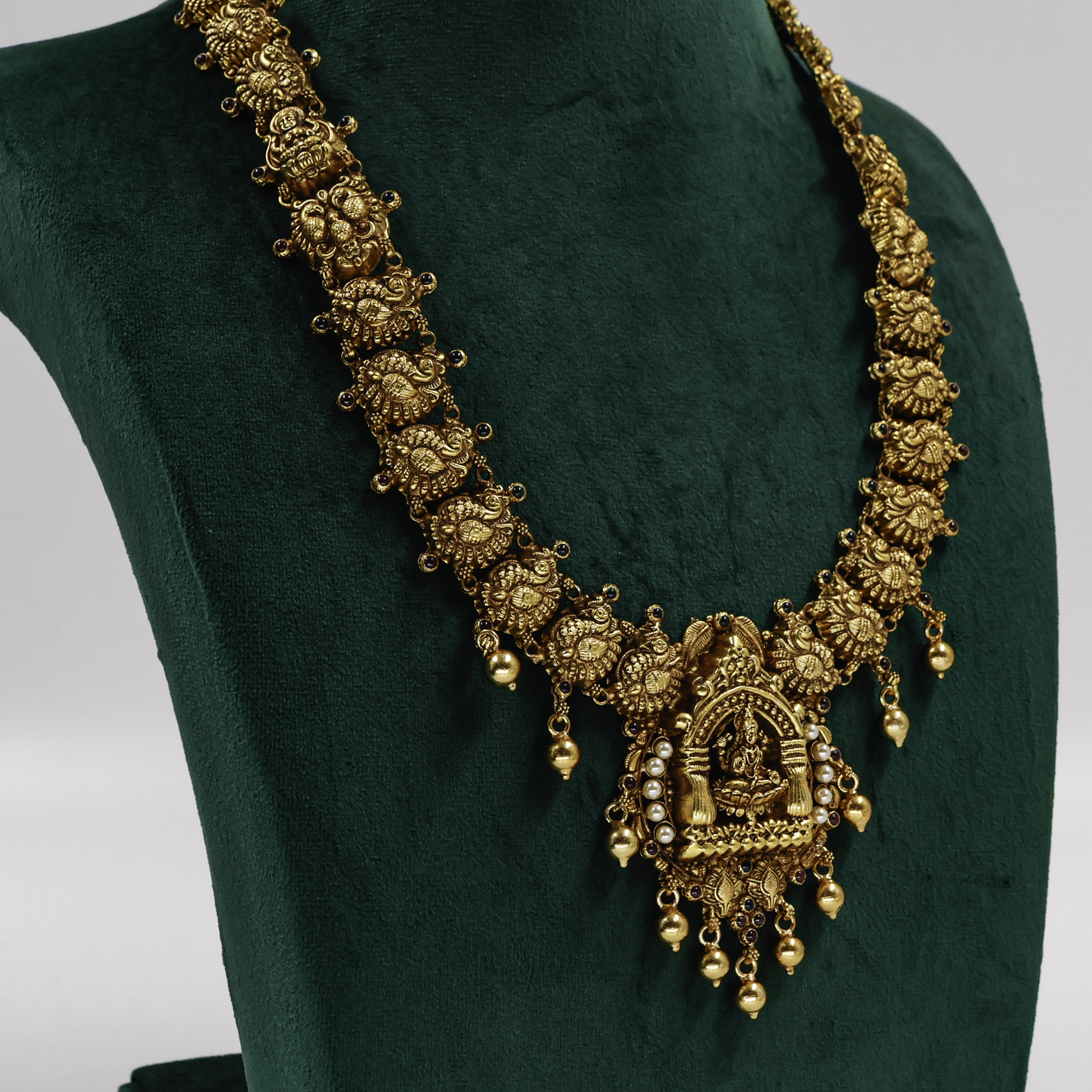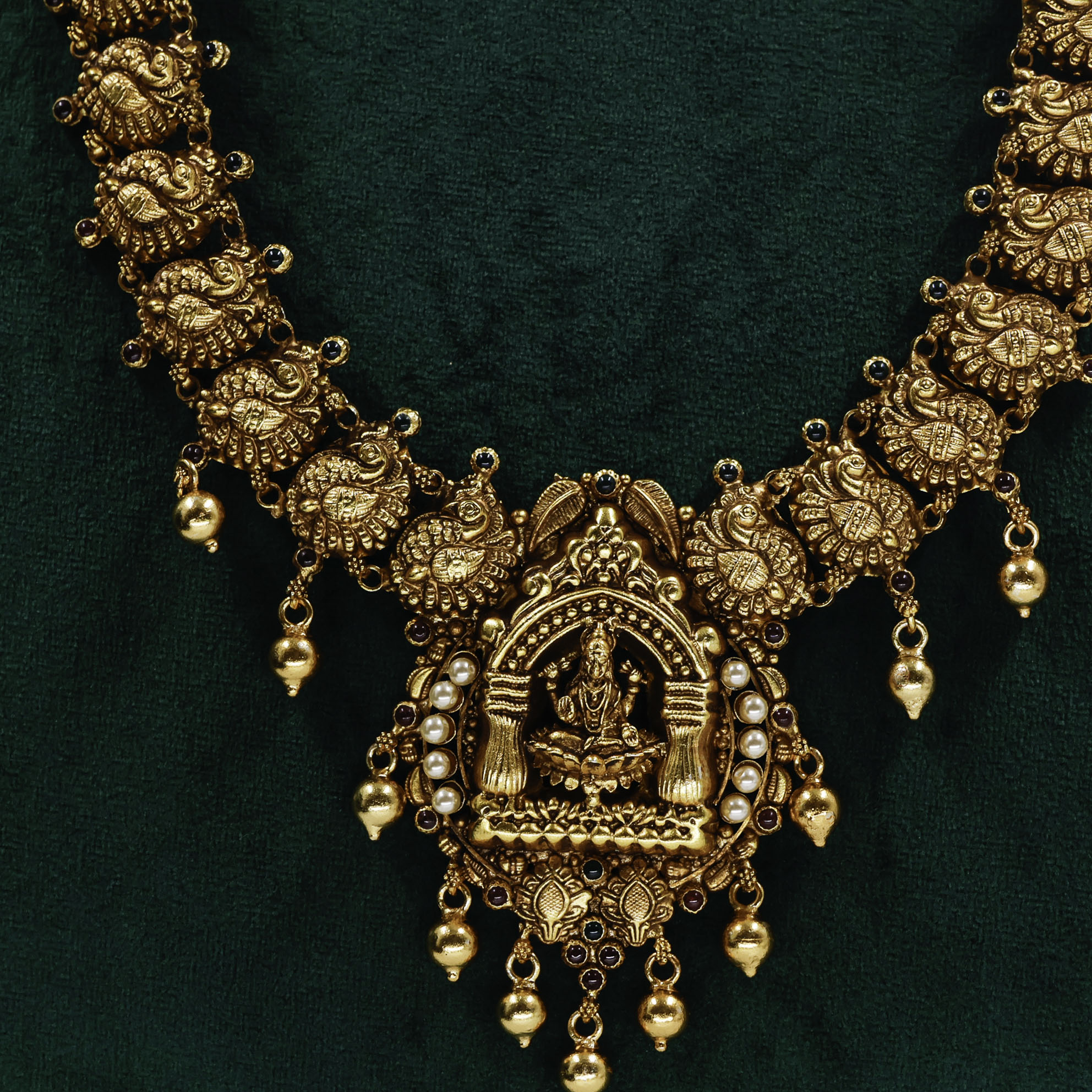 Elegant Gold Polished Silver pendant necklace featuring intricate detailing, perfect for traditional occasions. Buy Gold Polished Silver Pendant Necklace from Raag Silver Jewellery in Hyderabad.