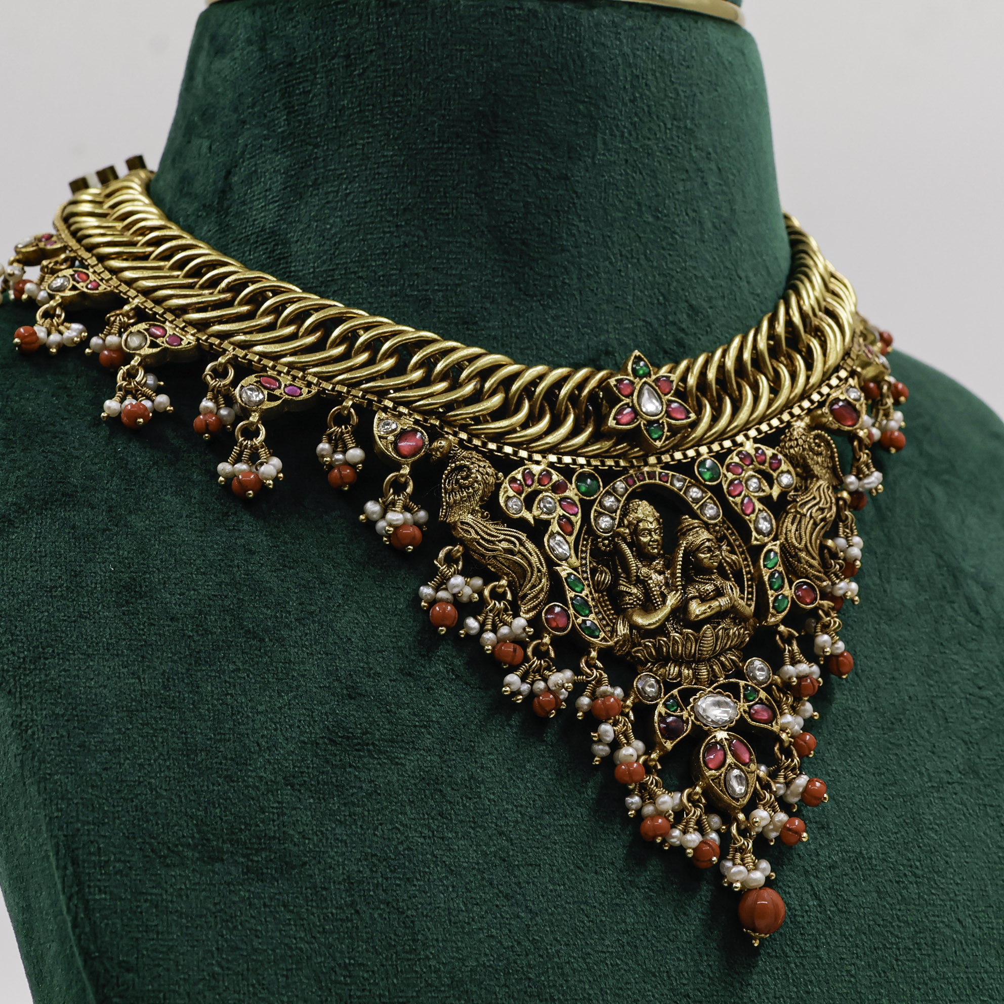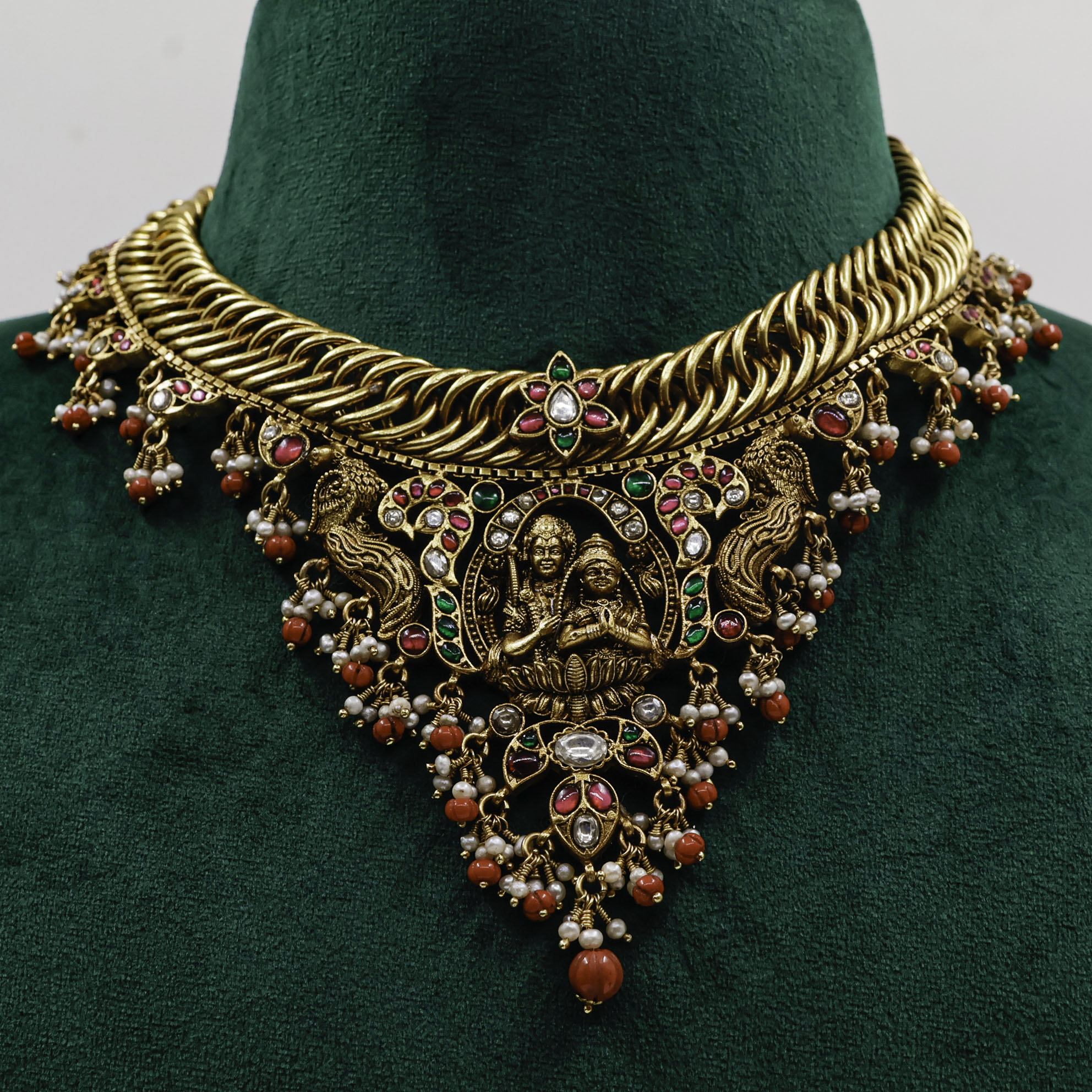 Elegant Gold Polished Silver necklace with ruby and emerald stones, perfect for traditional occasions. Buy Gold Polished Silver ruby necklace from Raag Silver Jewellery in Hyderabad.