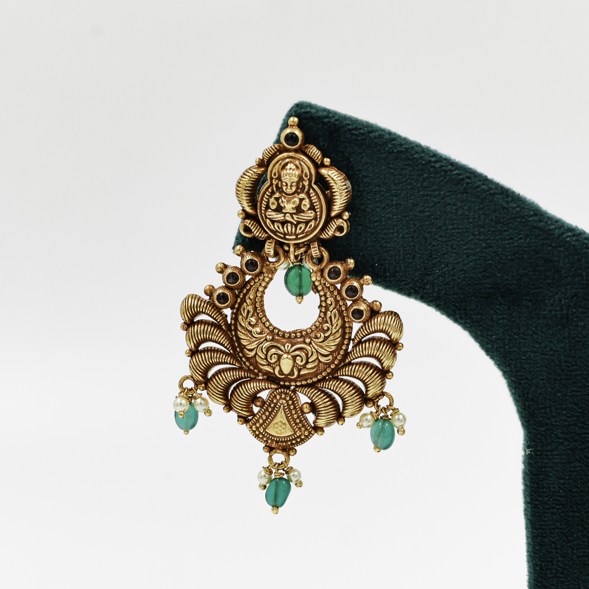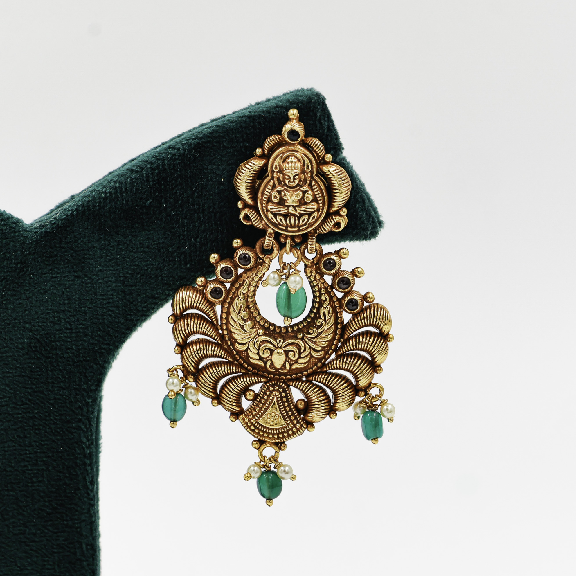 Elegant Gold Polished Silver temple earrings featuring intricate detailing, perfect for traditional occasions. Buy Gold Polished Silver Temple Earrings from Raag Silver Jewellery in Hyderabad.