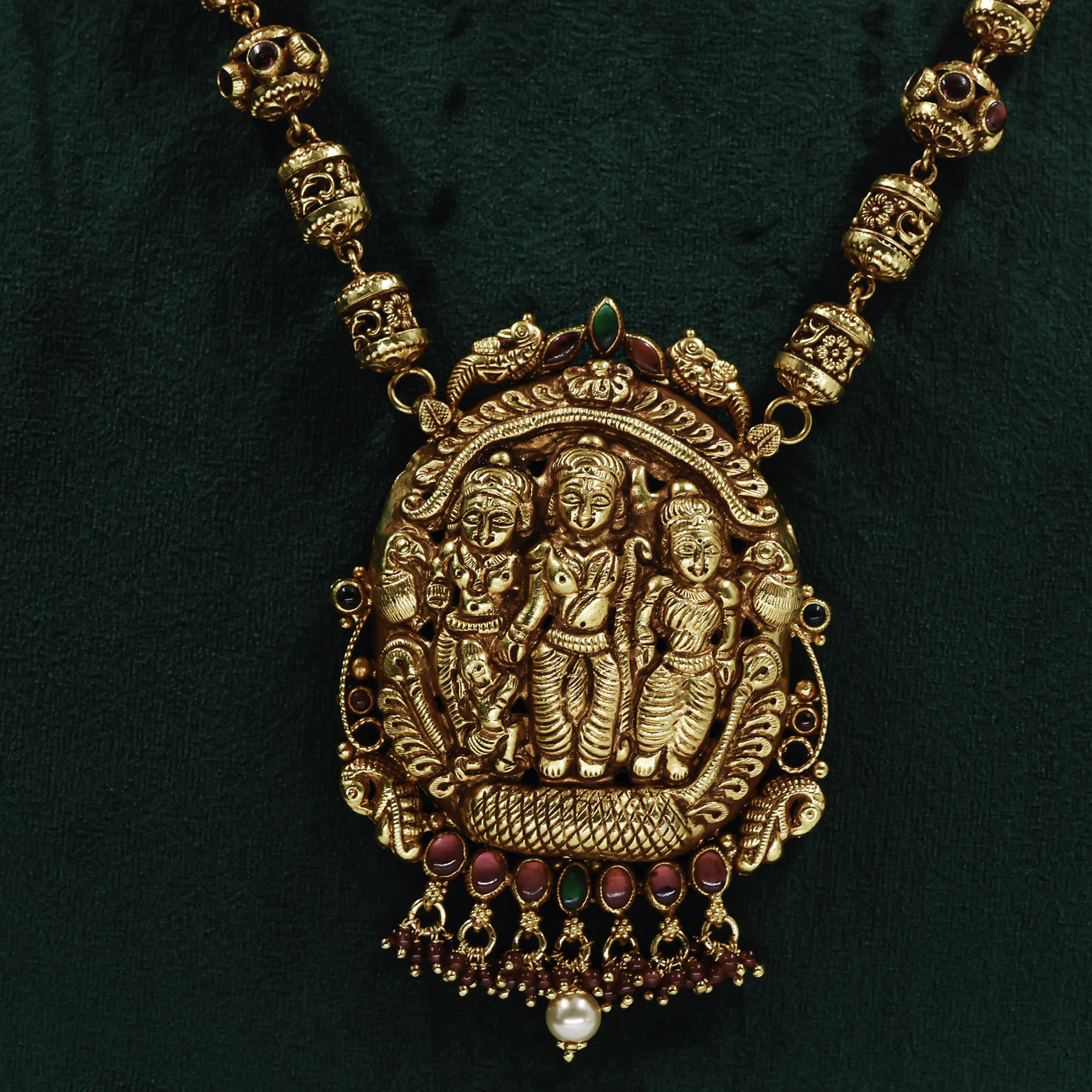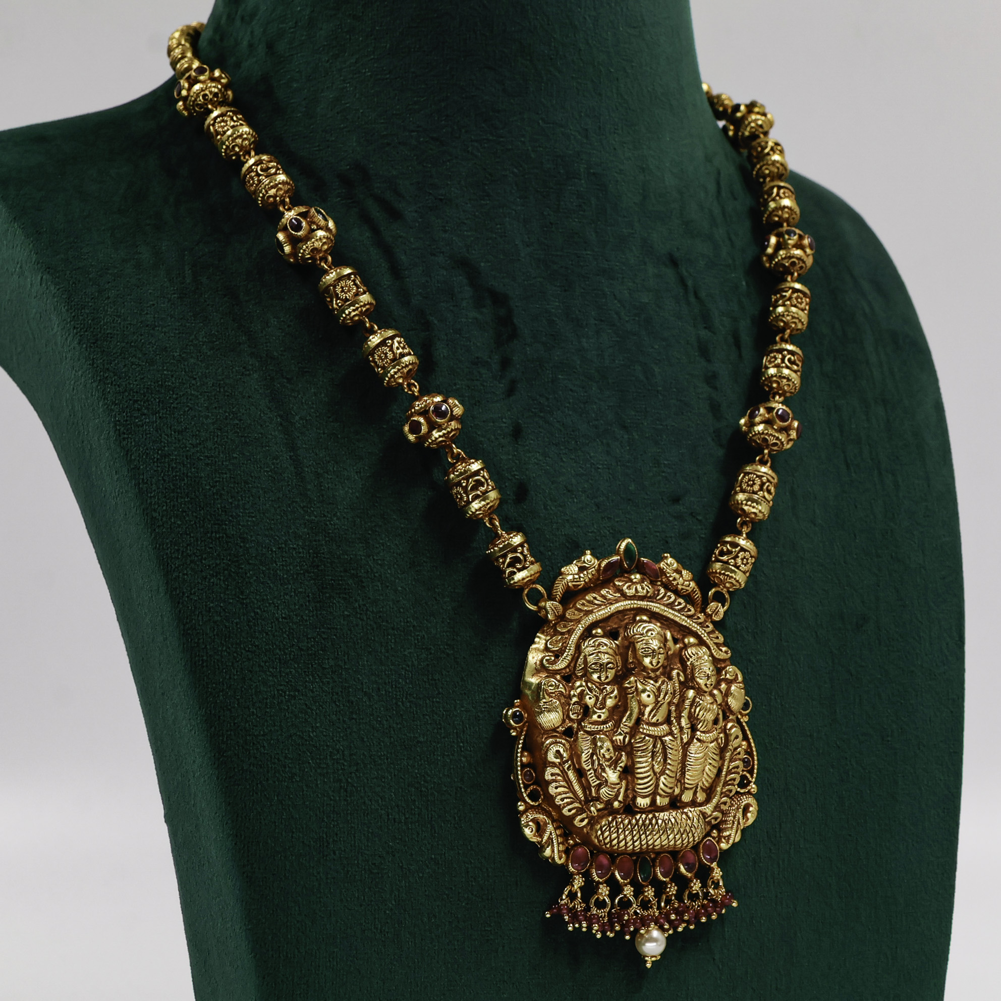 Elegant Gold Polished Silver temple necklace with intricate detailing, perfect for traditional occasions. Buy Gold Polished Silver Temple Necklace from Raag Silver Jewellery in Hyderabad.