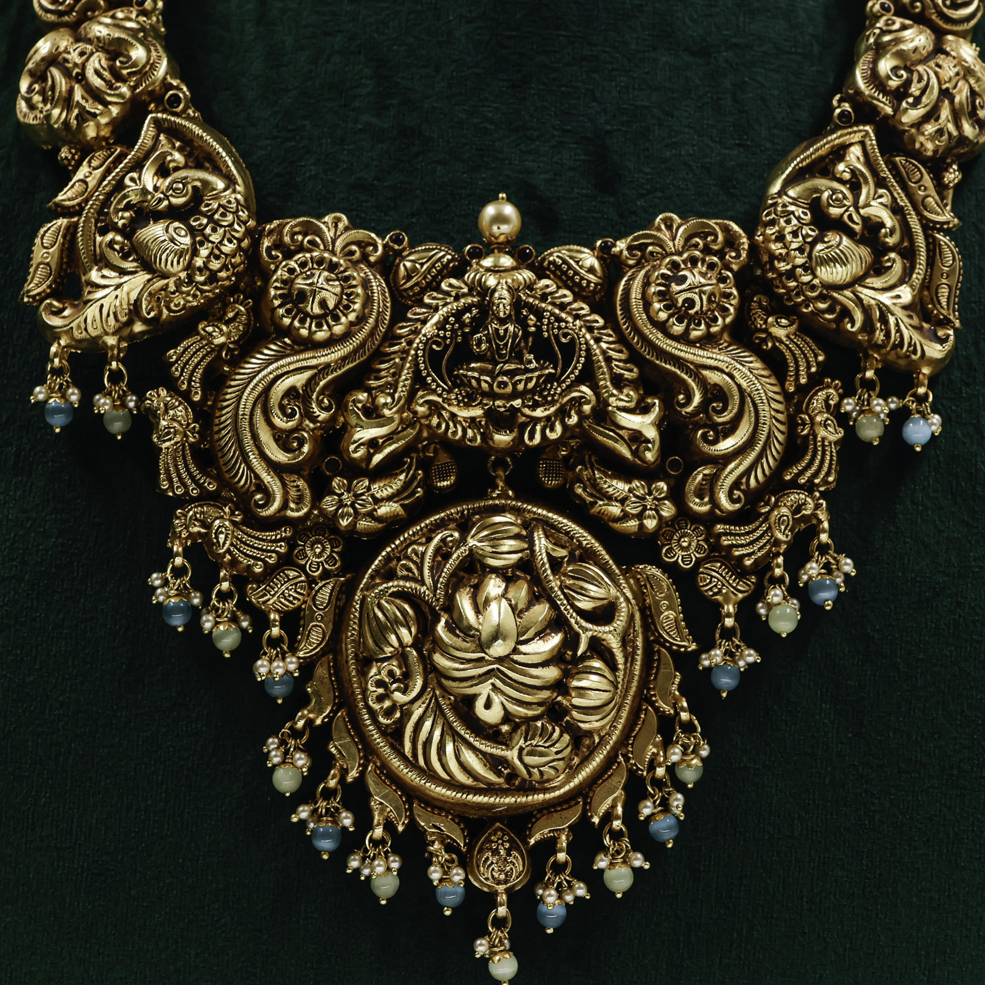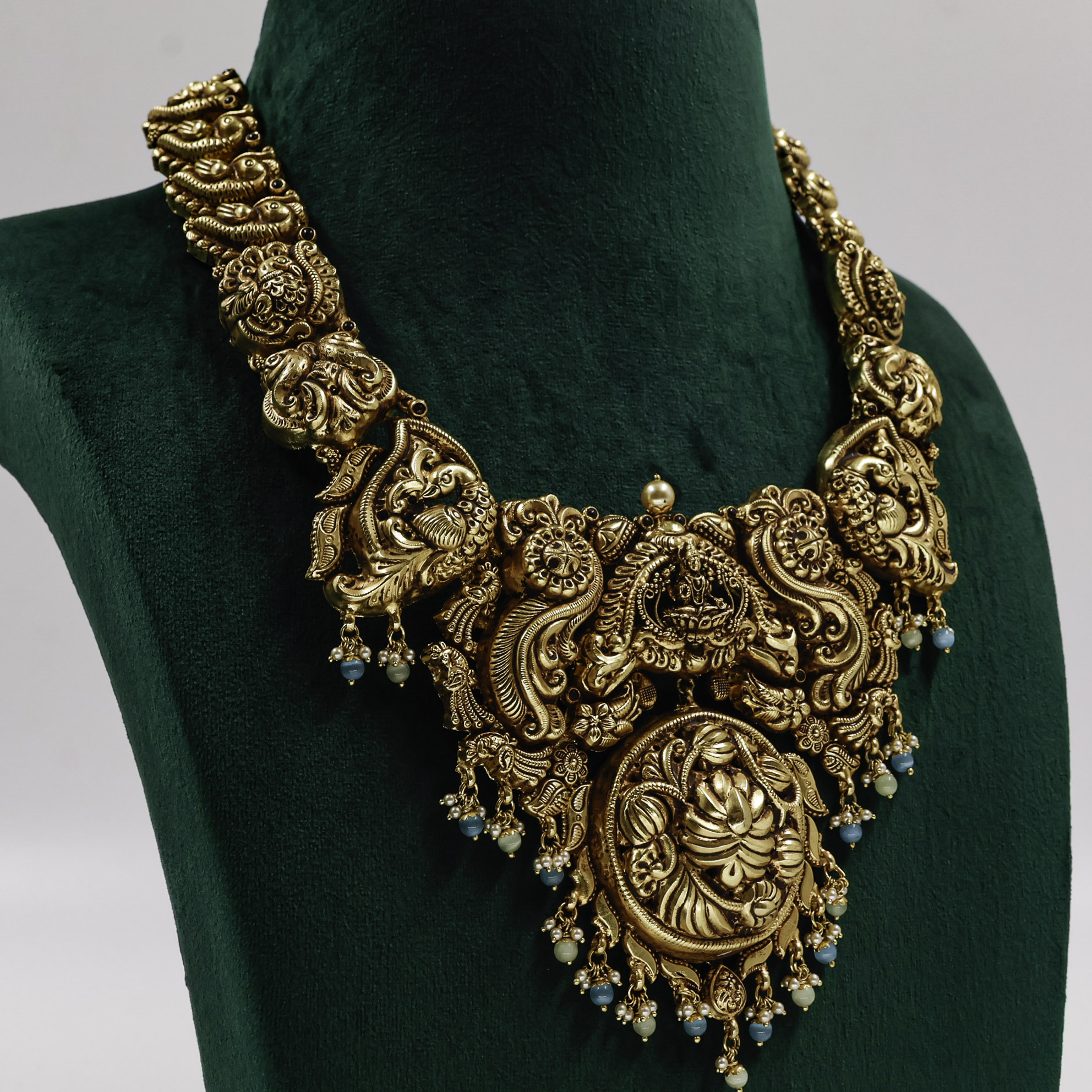 Elegant Gold Polished Silver temple necklace with intricate detailing, perfect for traditional occasions. Buy Gold Polished Silver temple necklace from Raag Silver Jewellery in Hyderabad.