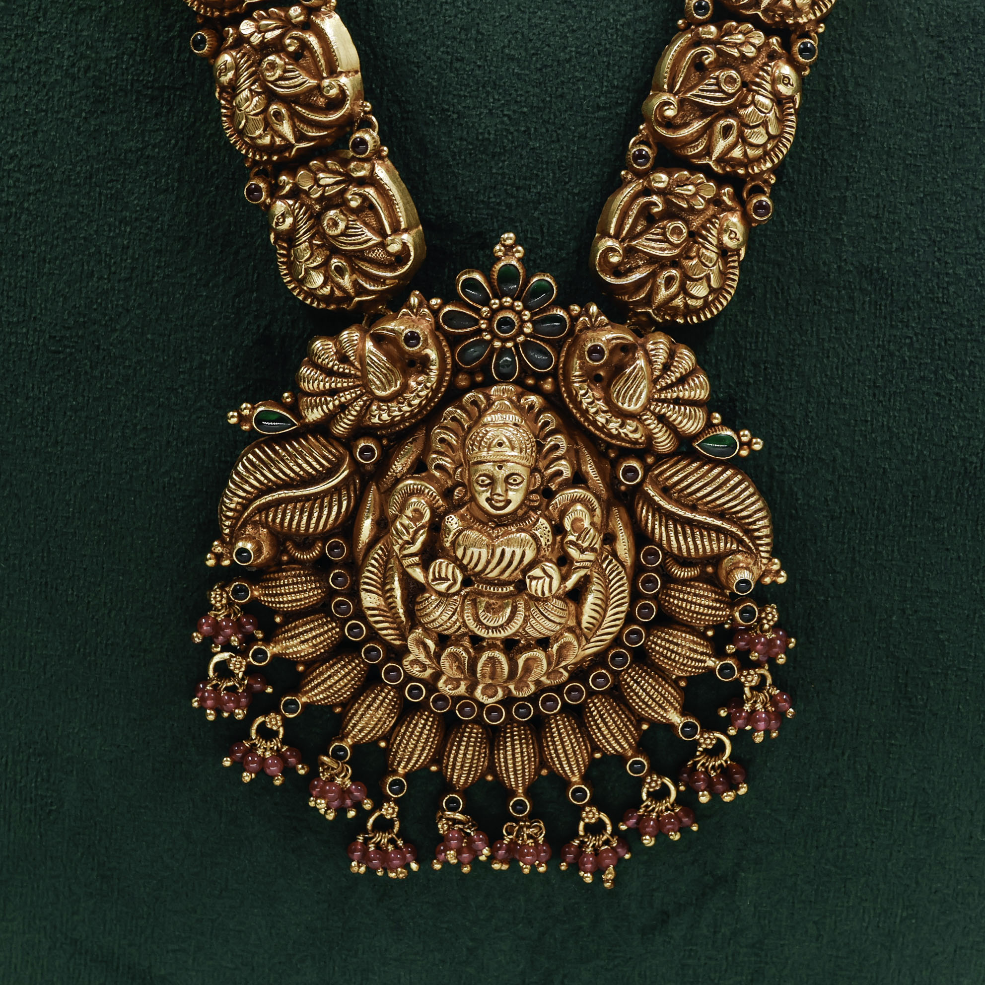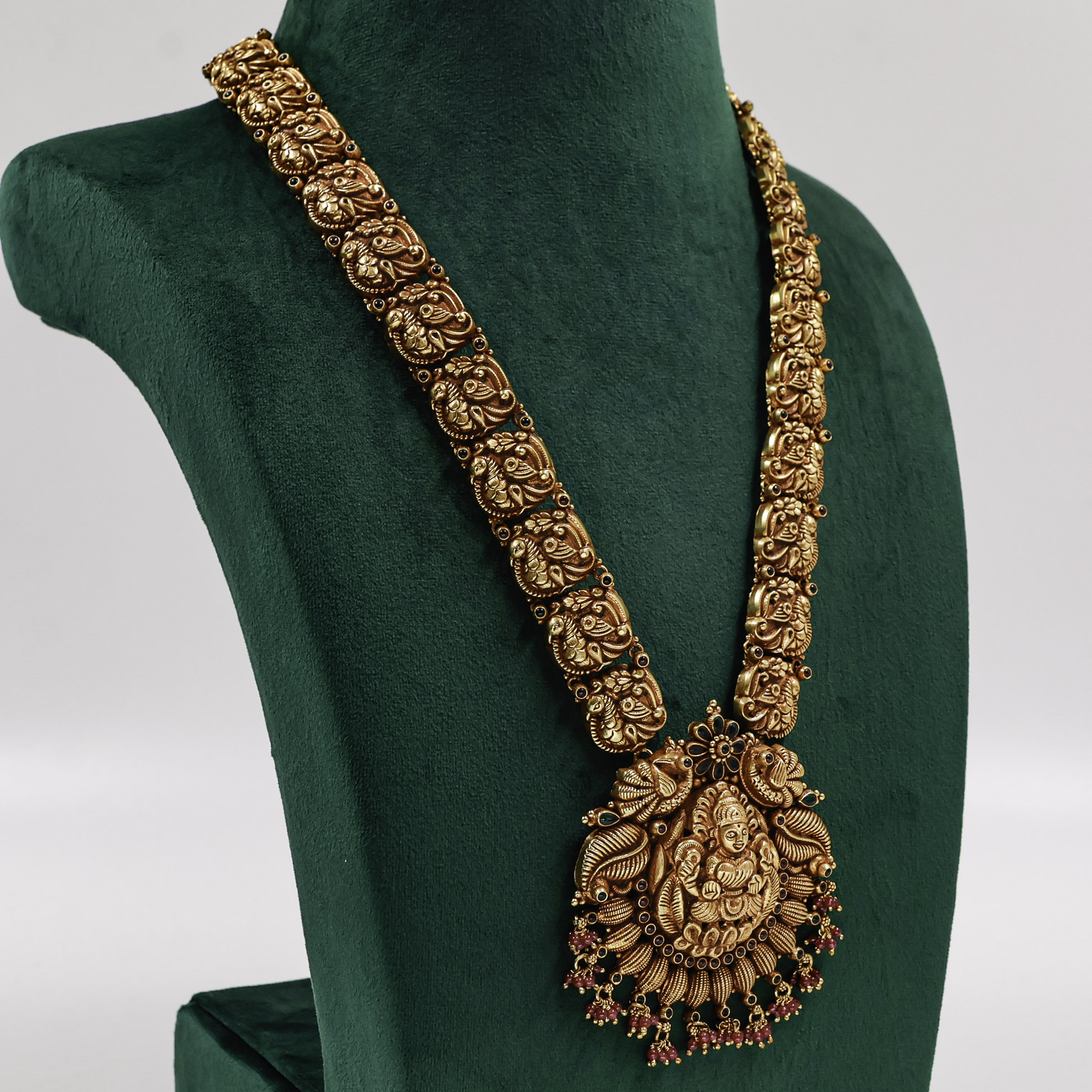 Elegant Gold Polished Silver temple necklace with intricate design, perfect for weddings and festive occasions. Buy Gold Polished Silver temple necklace from Raag Silver Jewellery in Hyderabad.