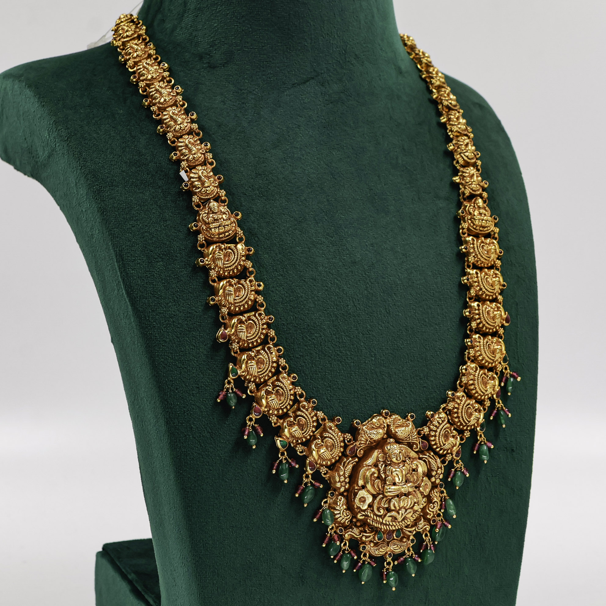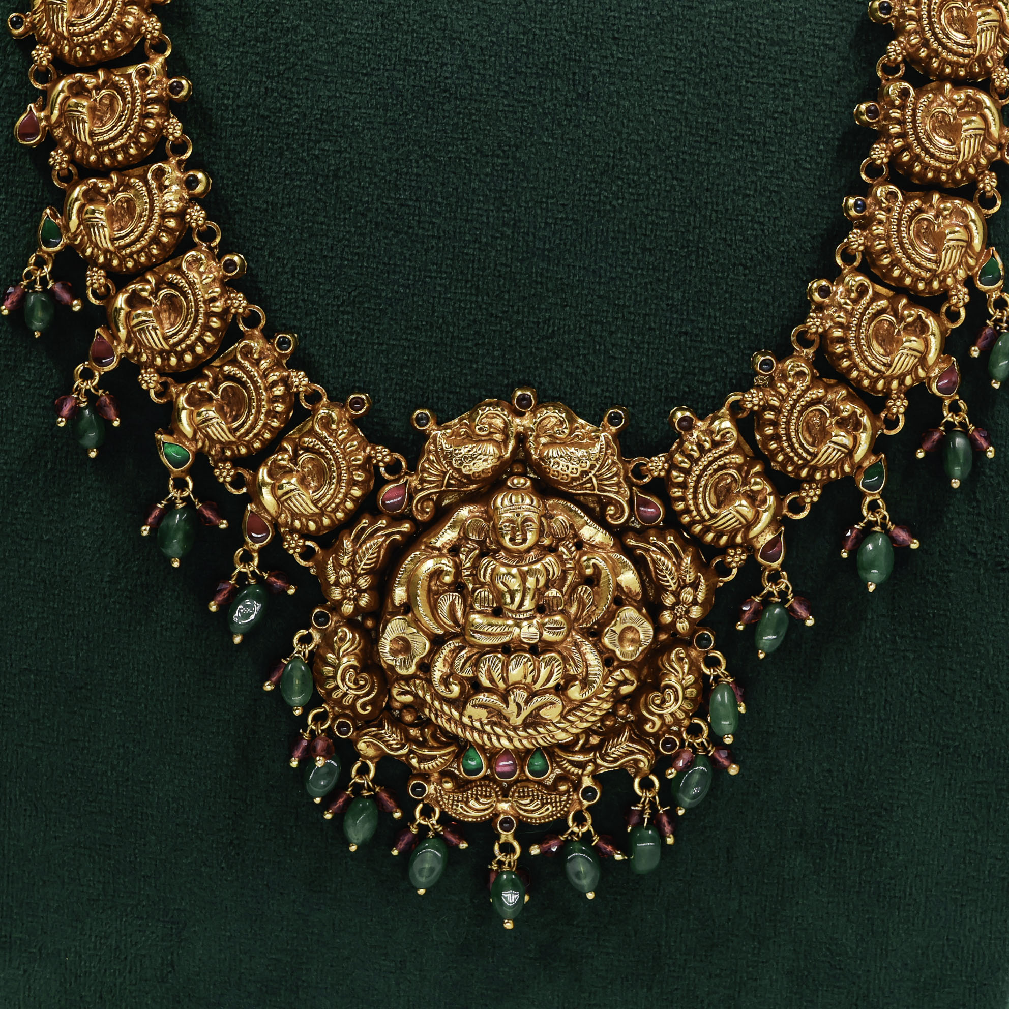 Antique Gold Polished Silver temple necklace with intricate design, perfect for traditional occasions. Buy Gold Polished Silver temple necklace from Raag Silver Jewellery in Hyderabad.