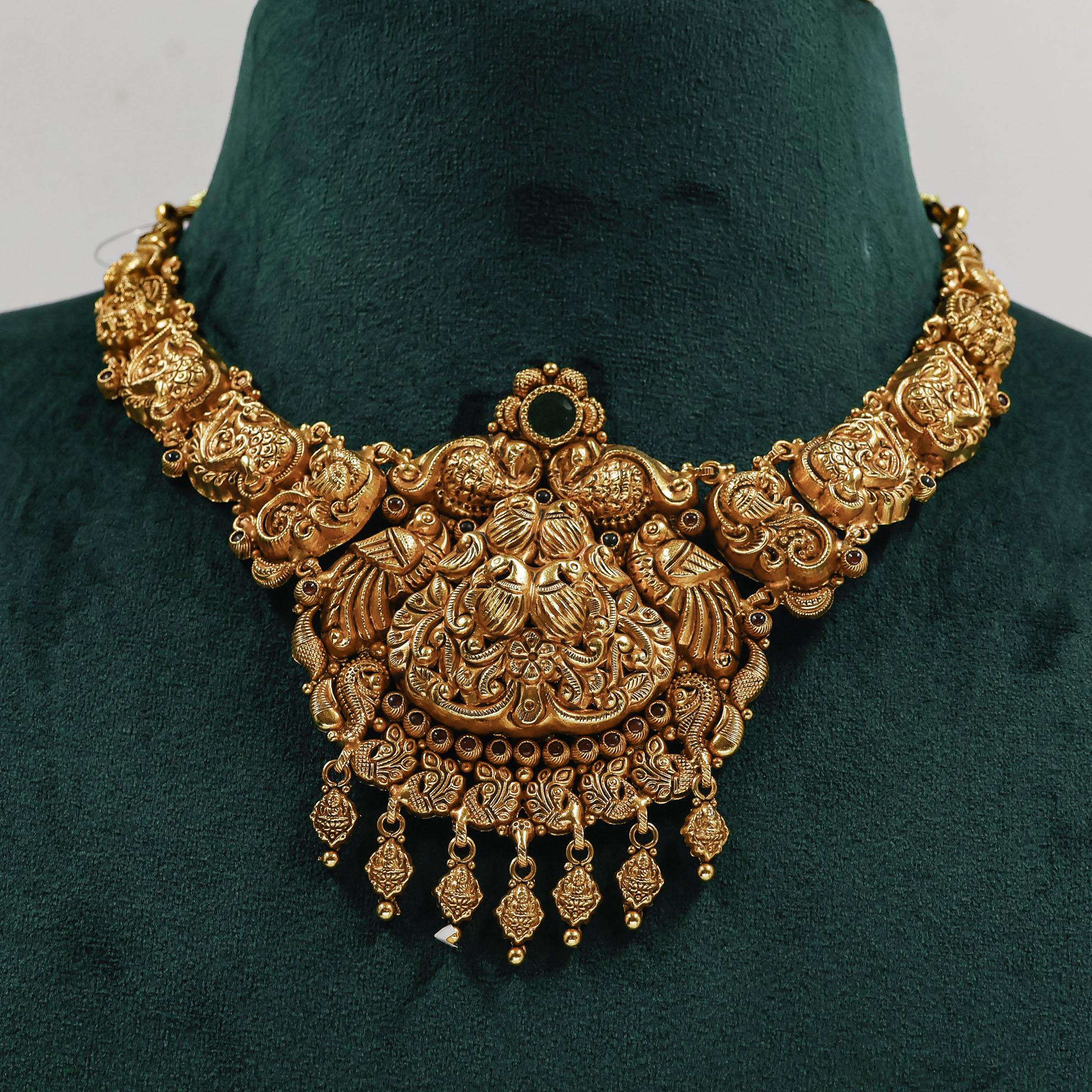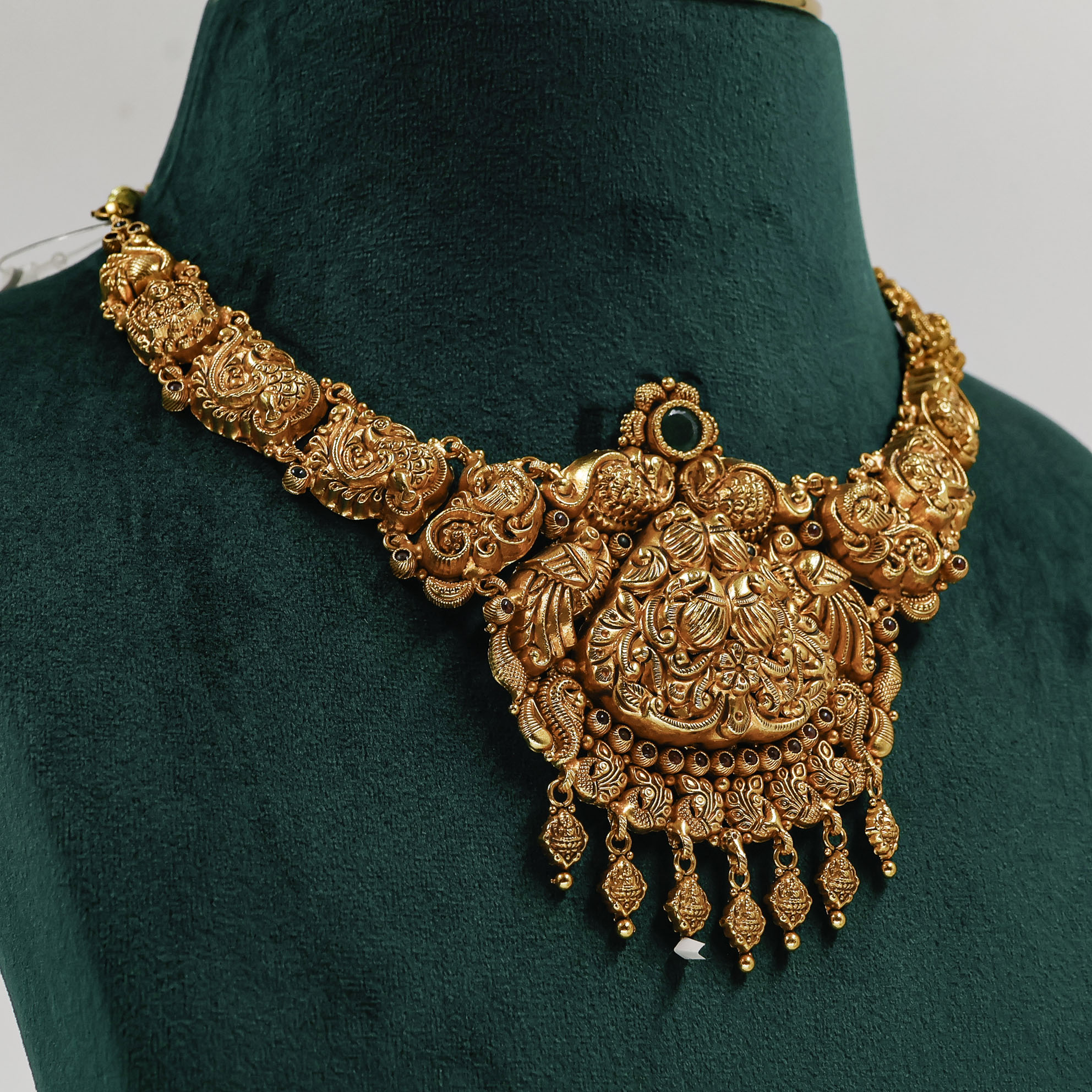 Elegant Gold Polished Silver temple necklace with intricate detailing, perfect for weddings and traditional occasions. Buy Gold Polished Silver temple necklace from Raag Silver Jewellery in Hyderabad.